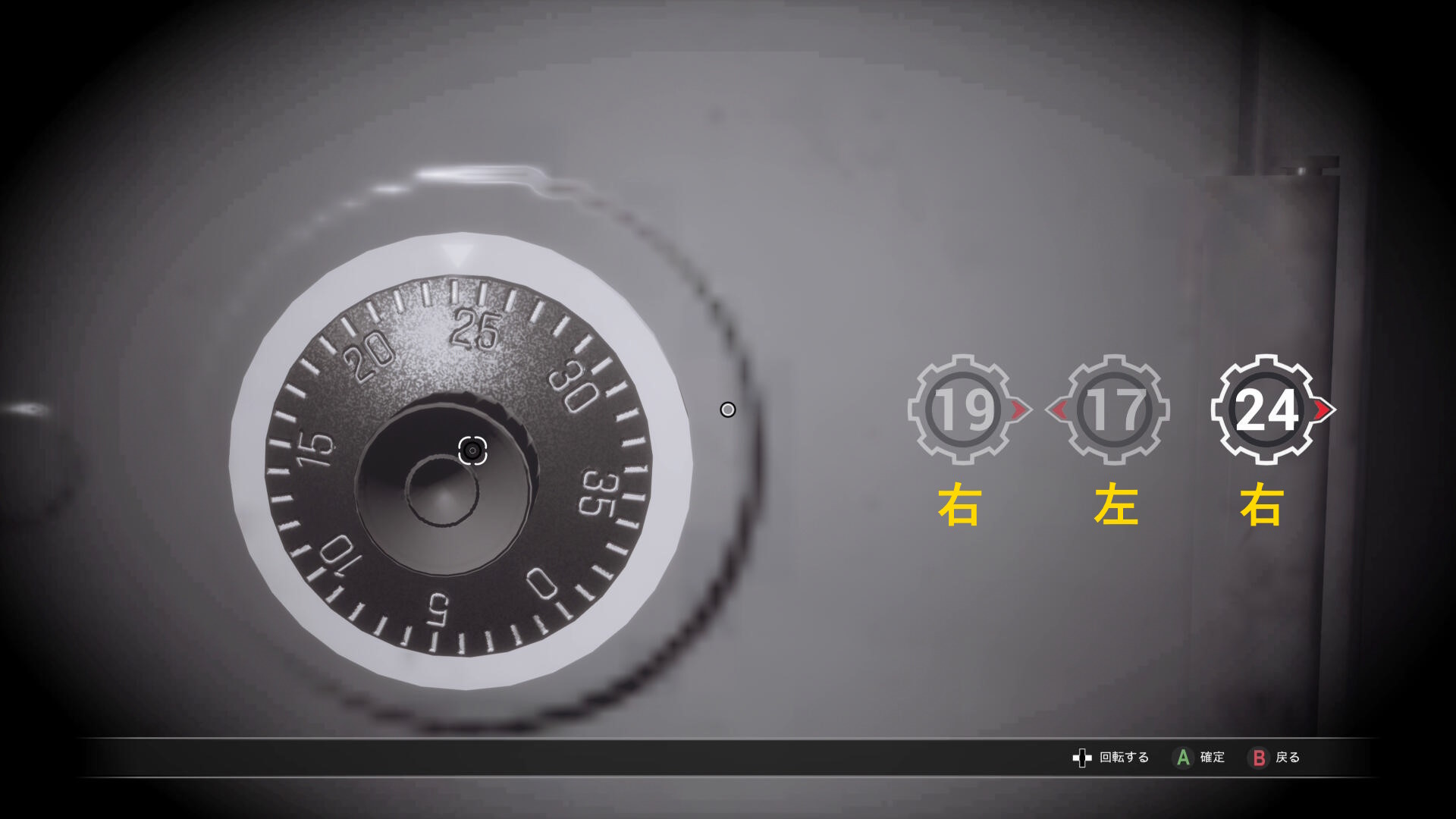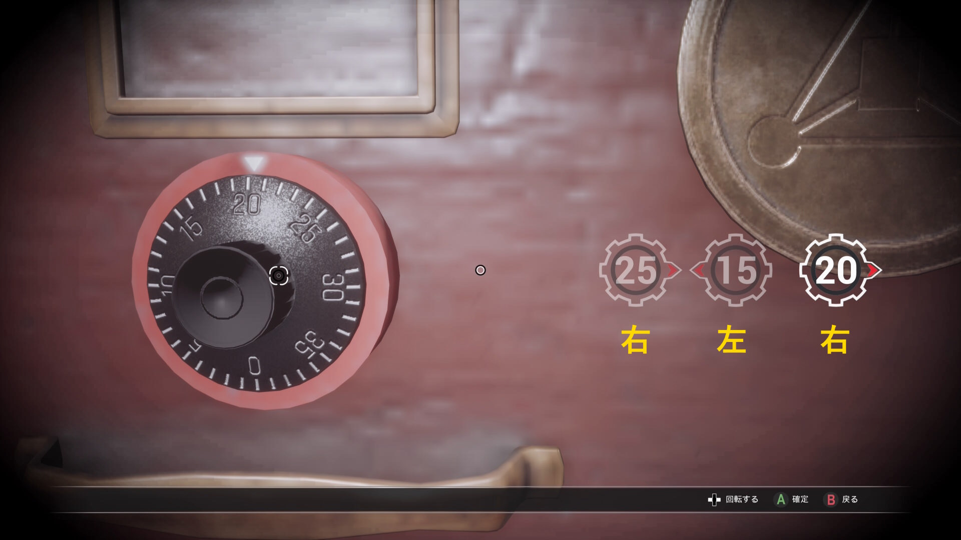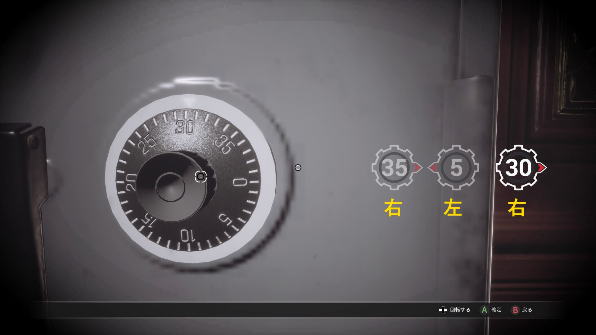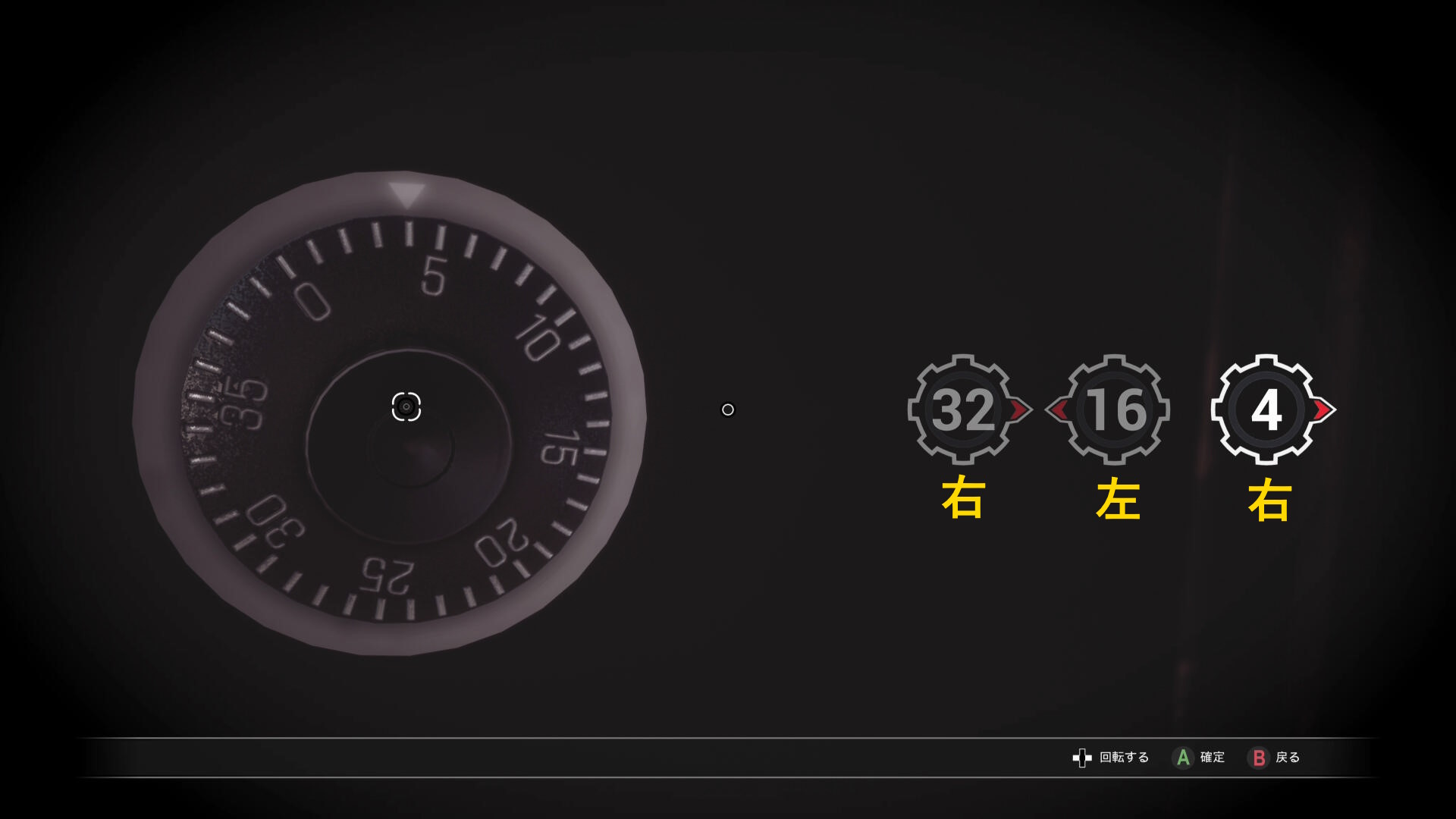 • 金庫にアクセスし、ダイヤルを 32右 ⇒ 16左 ⇒ 4右 の順に回すと解錠
