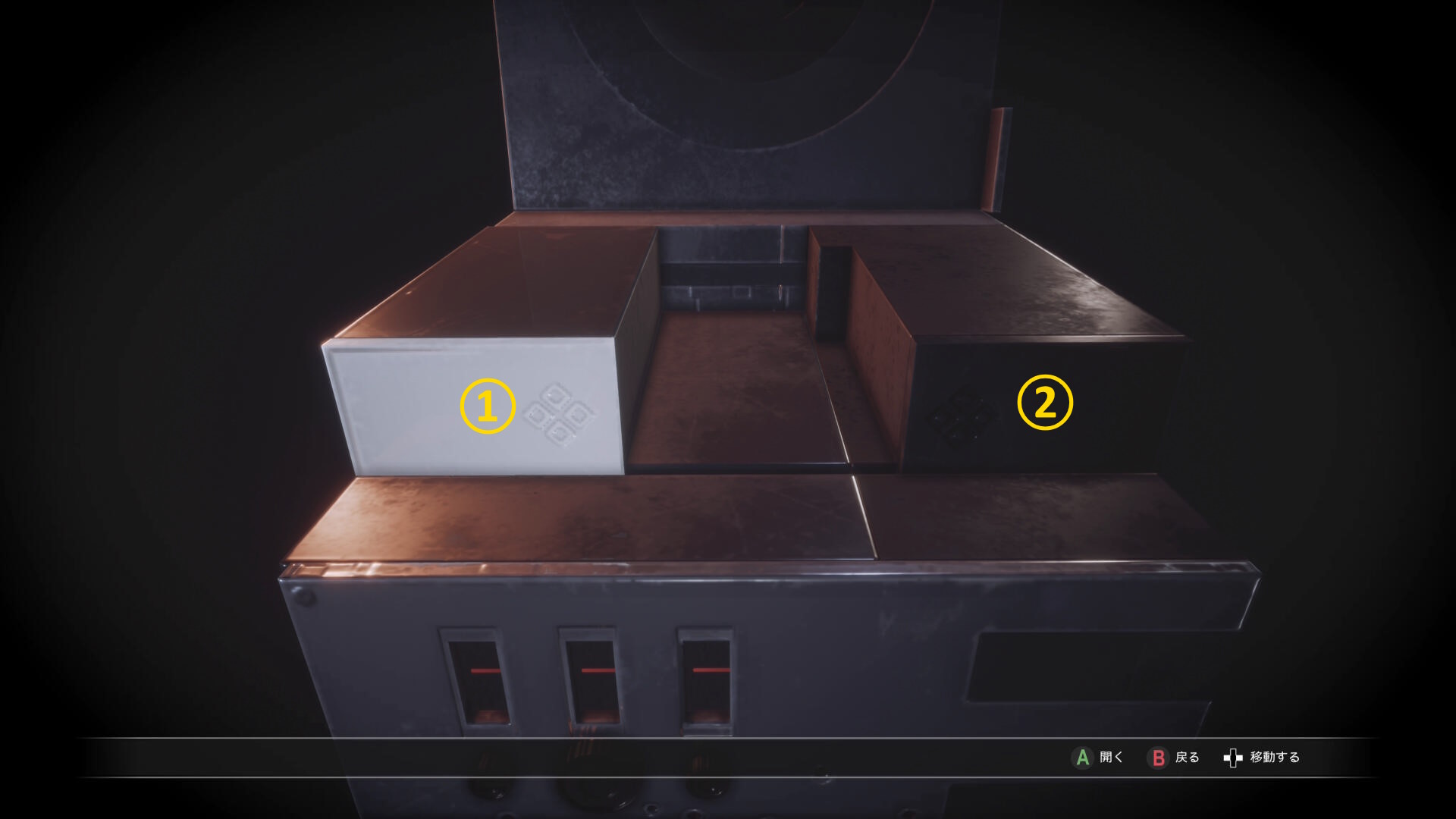 • パズル付きキューブを回収した金庫の左に引き出しがあり、暗視カメラを起動すると箱が出現するのでモジュール式鍵で解錠する