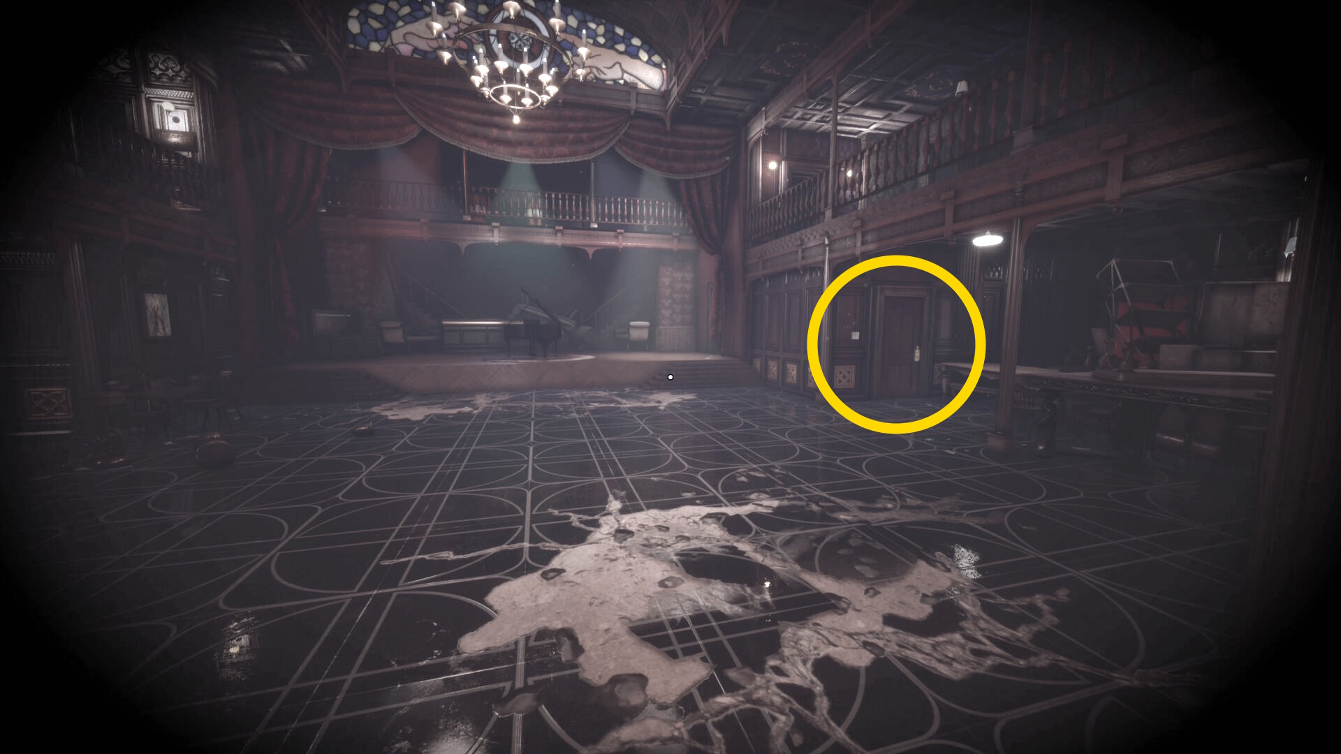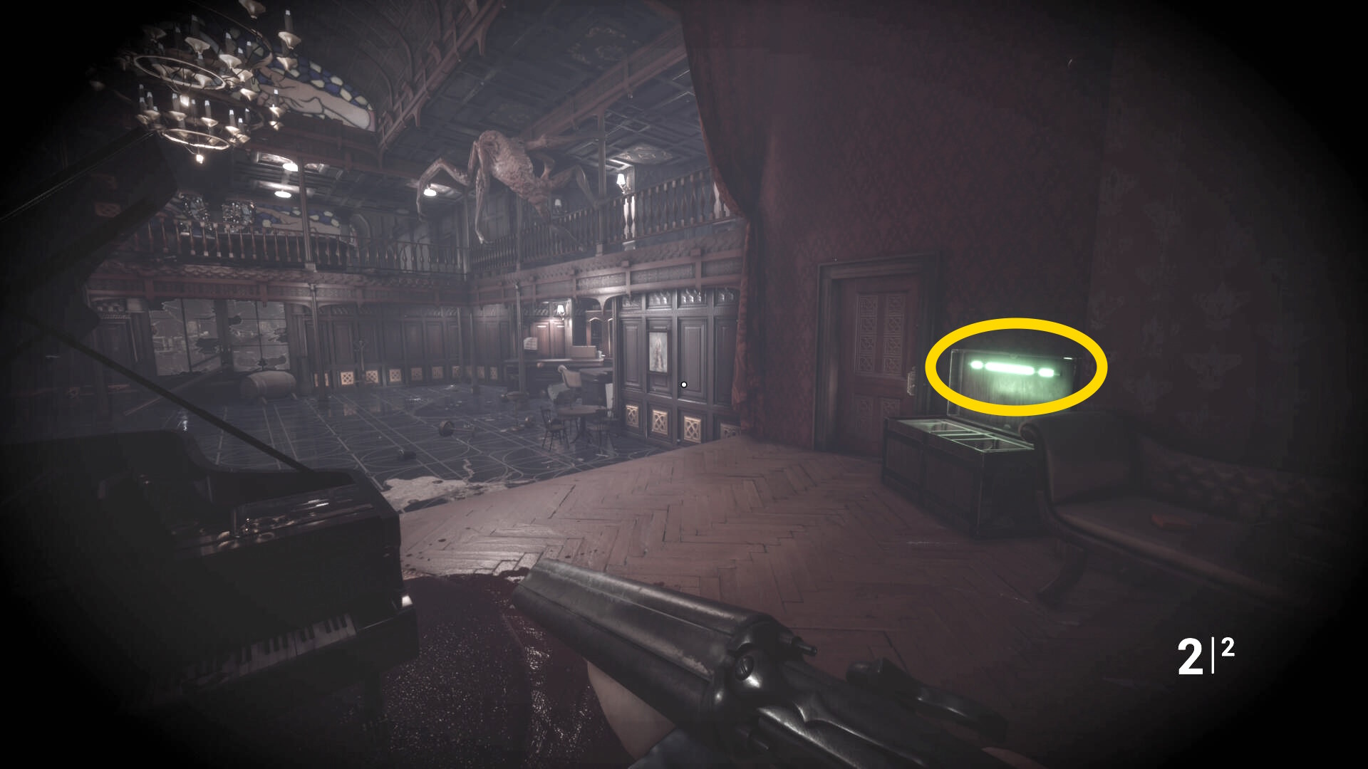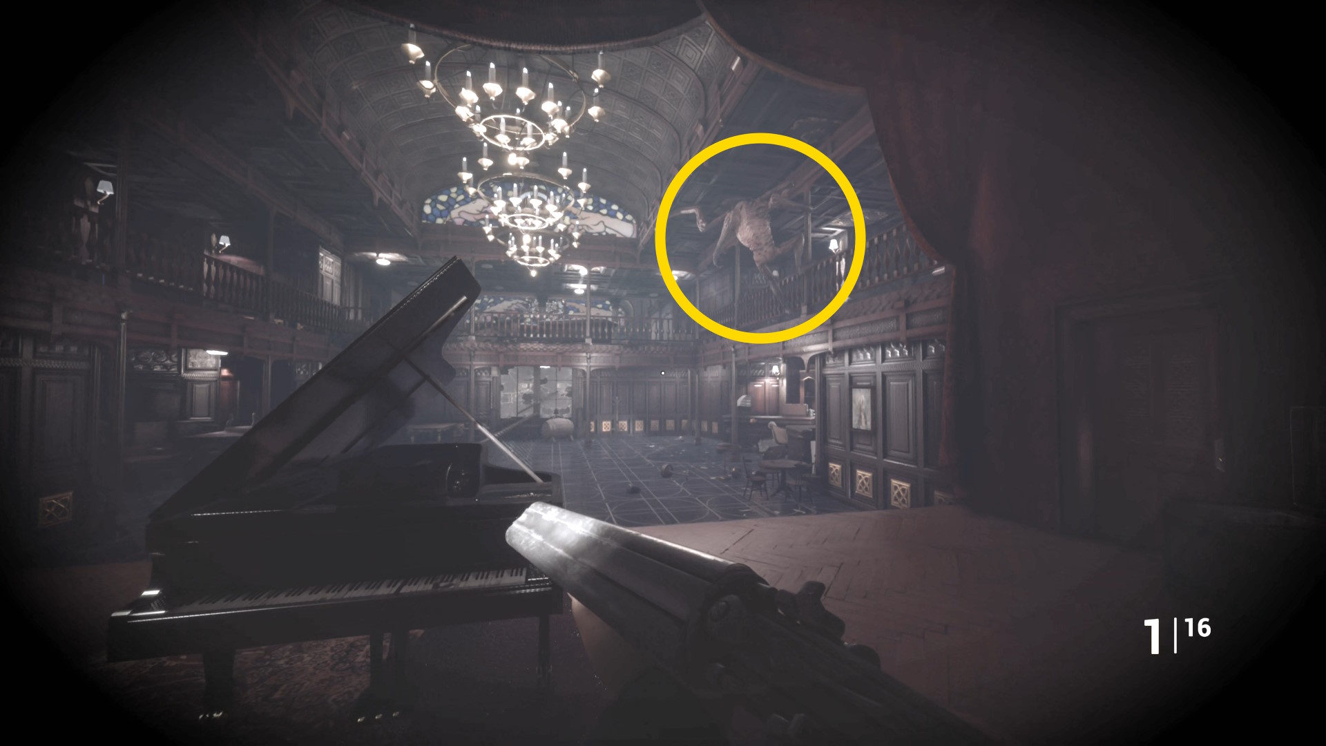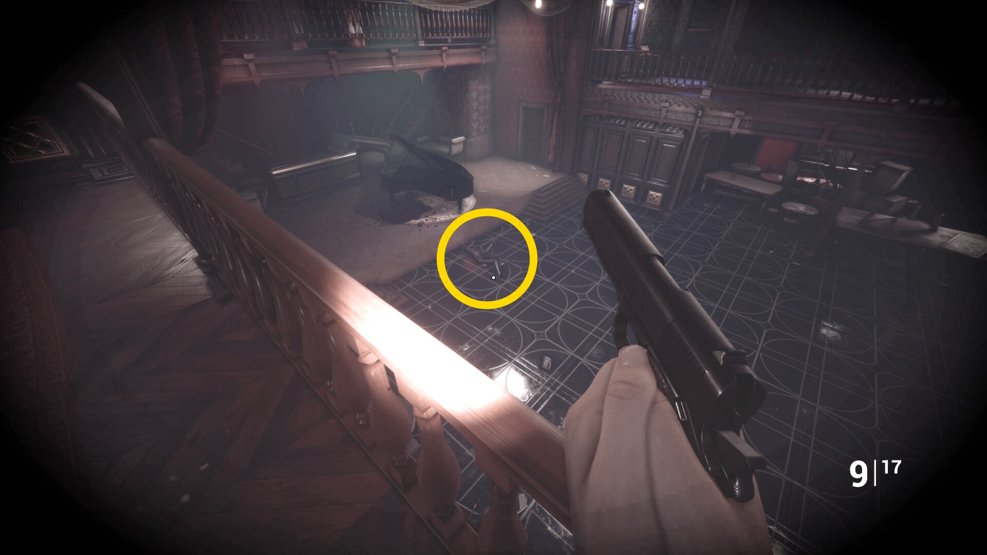 • 手すりから眼下を見るとピアノの前に敵が1体寝ている