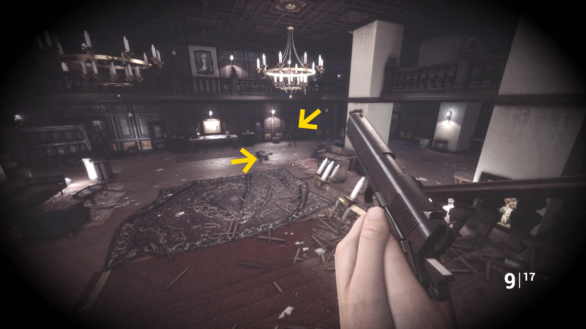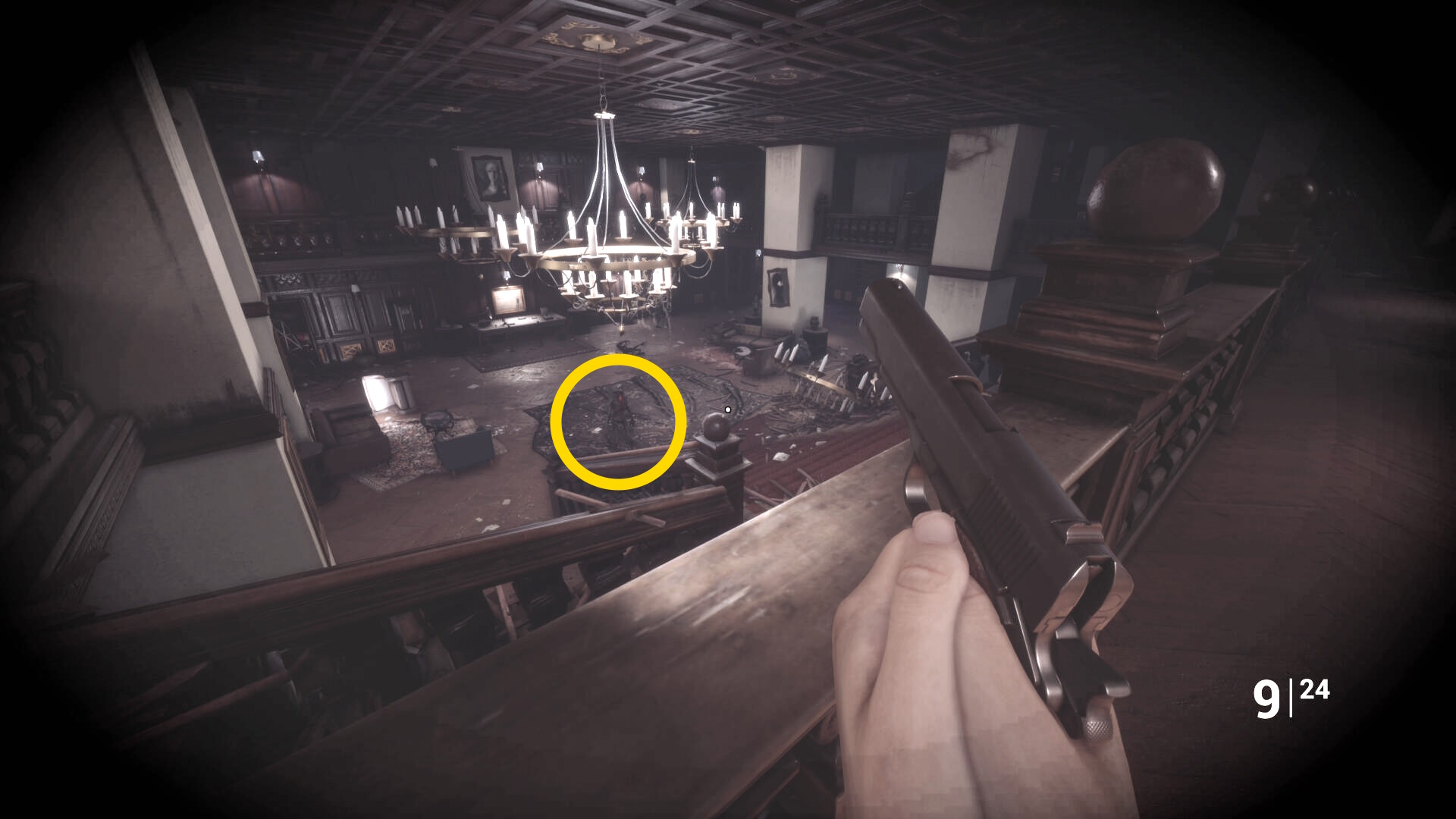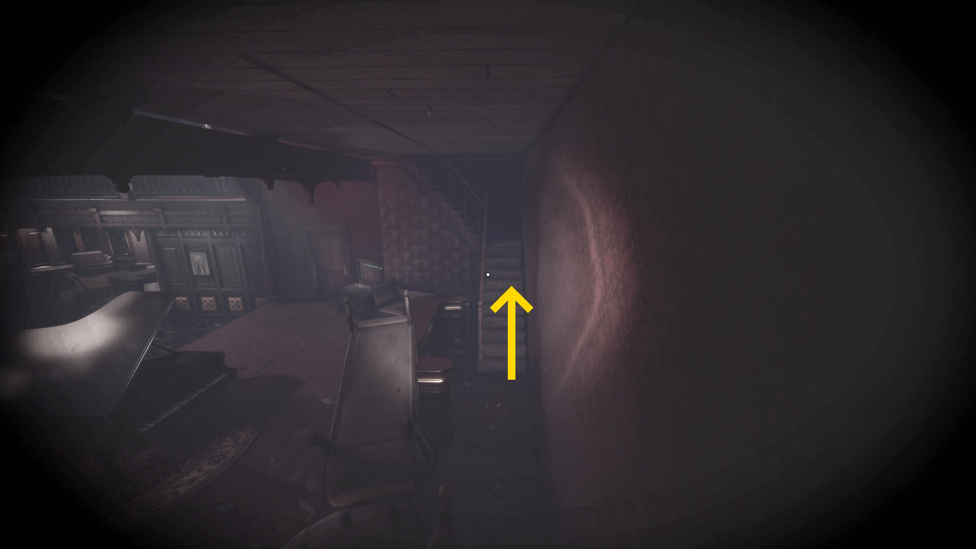 • 手すりから眼下を見るとピアノの前に敵が1体寝ている