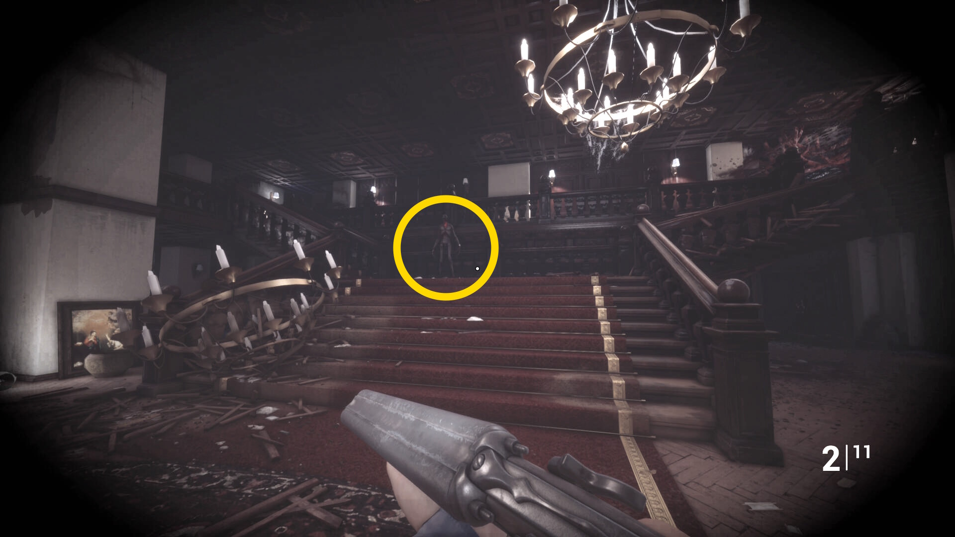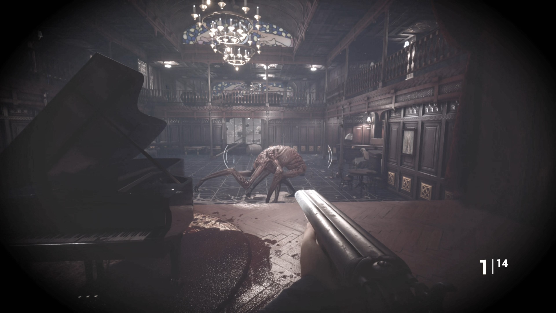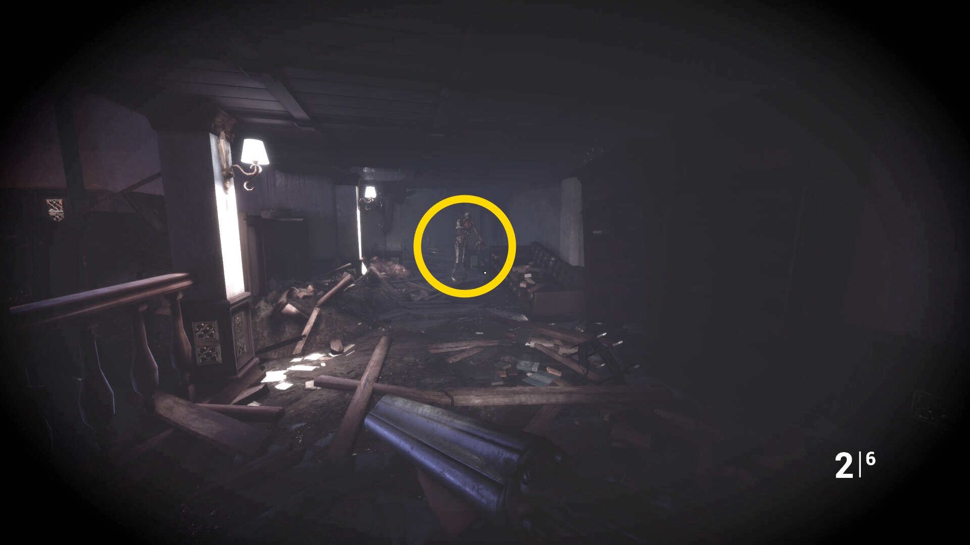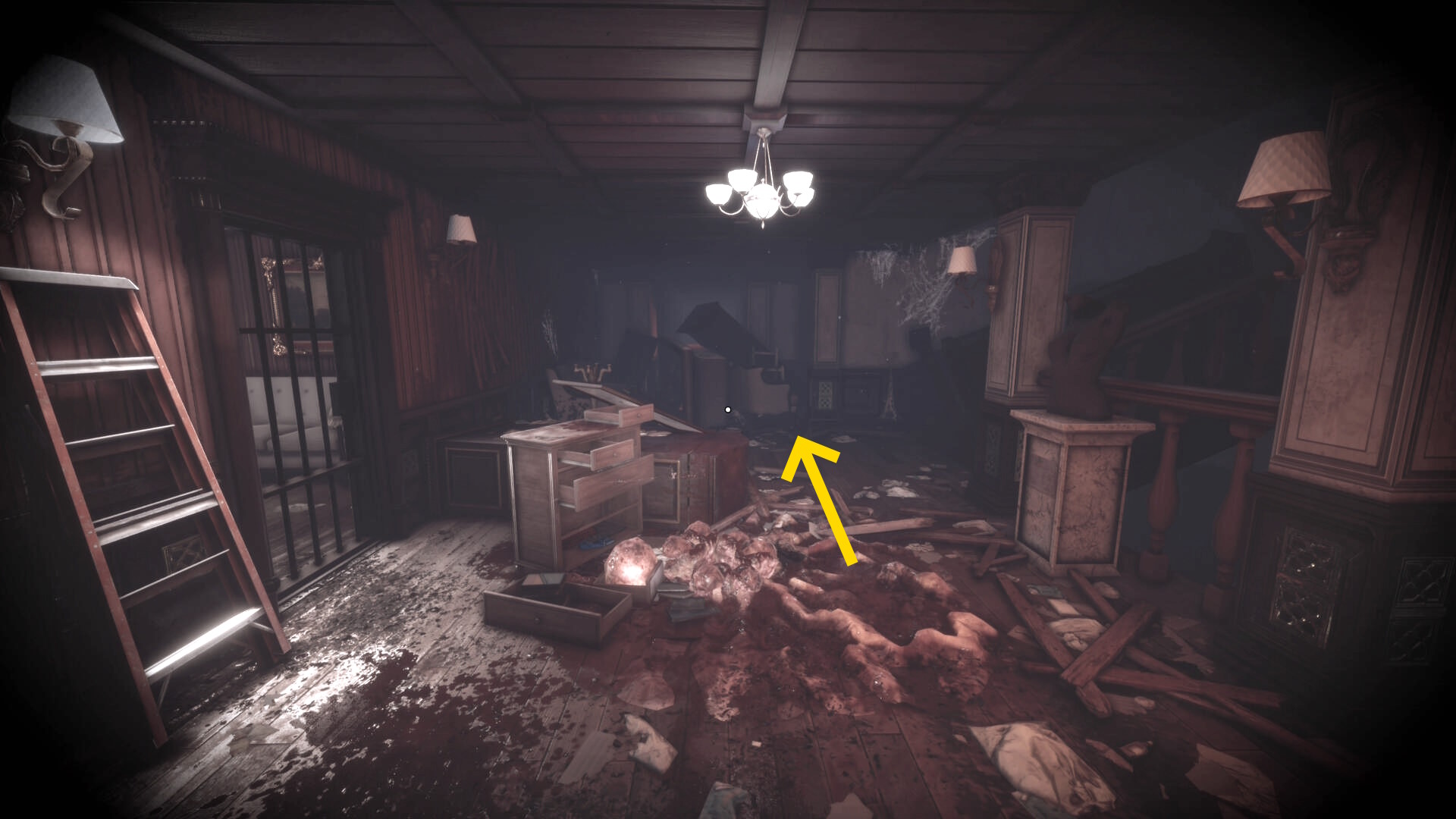 • 手すりから眼下を見るとピアノの前に敵が1体寝ている
