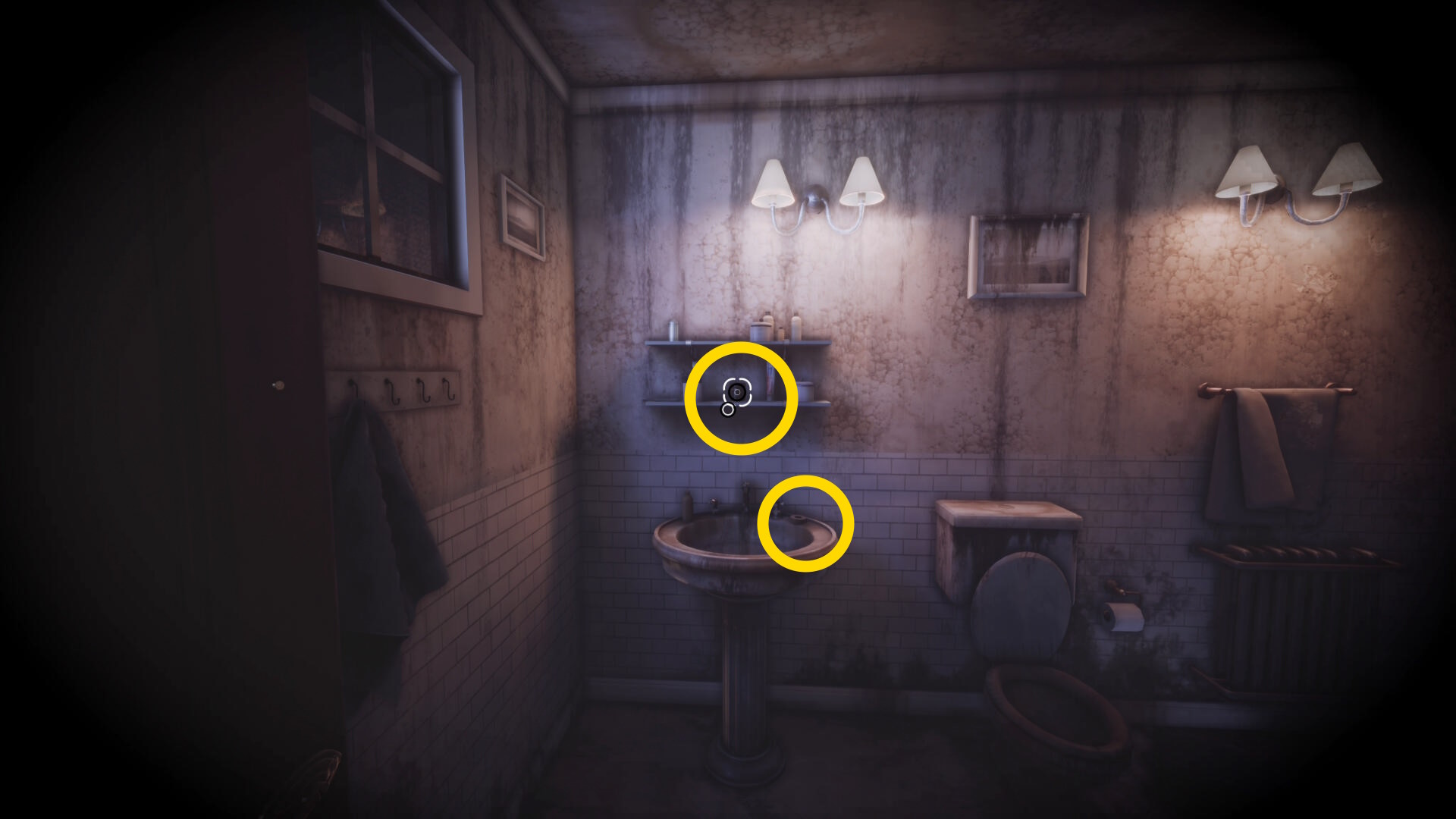 • トイレのドアを開け、洗面台の上の棚から カメラレンズ を回収し、カメラと組み合わせる