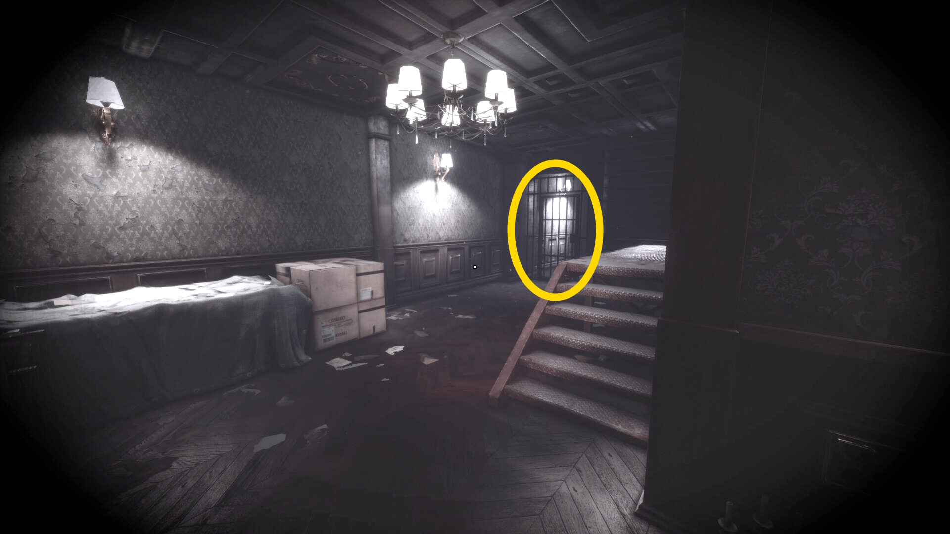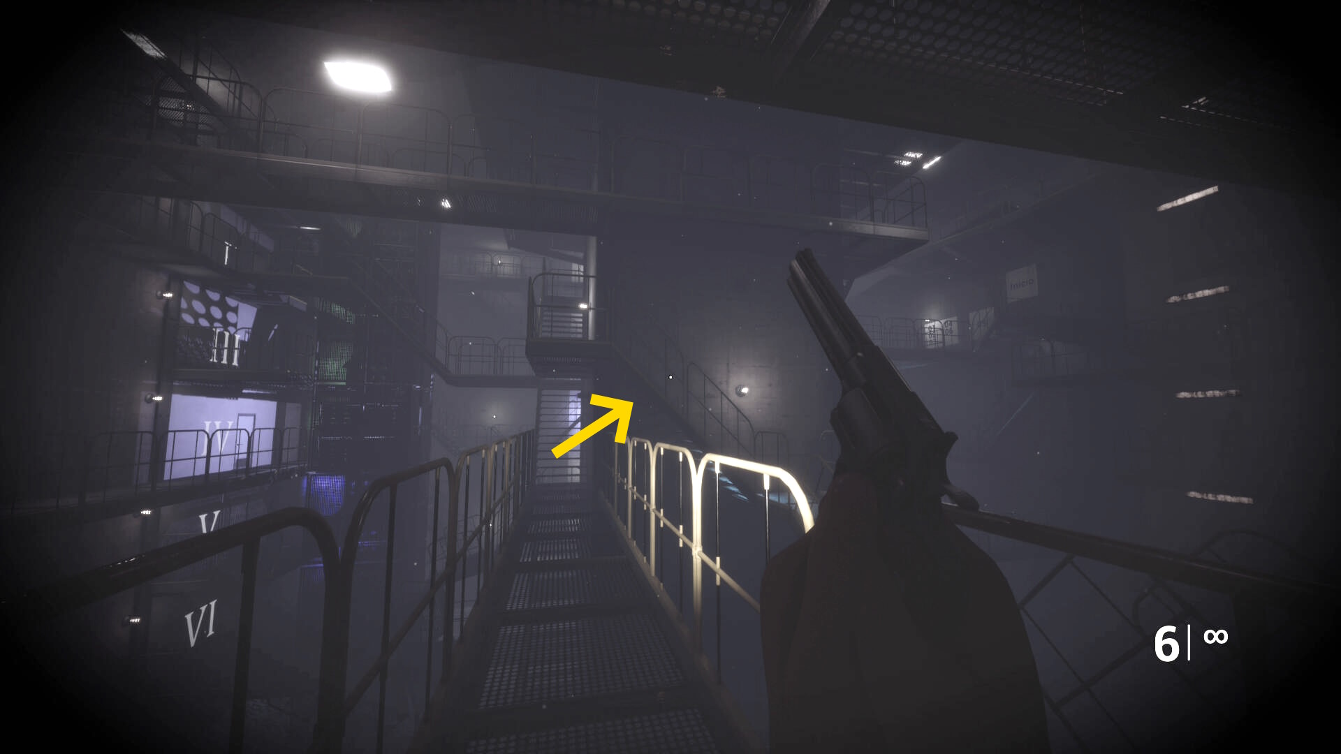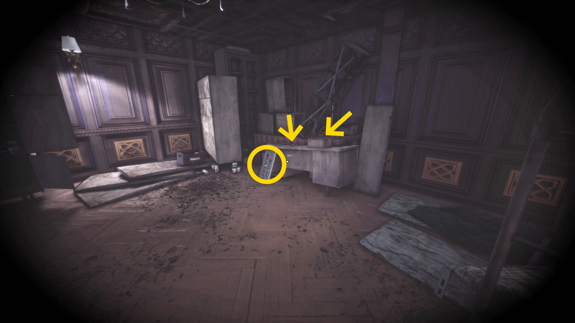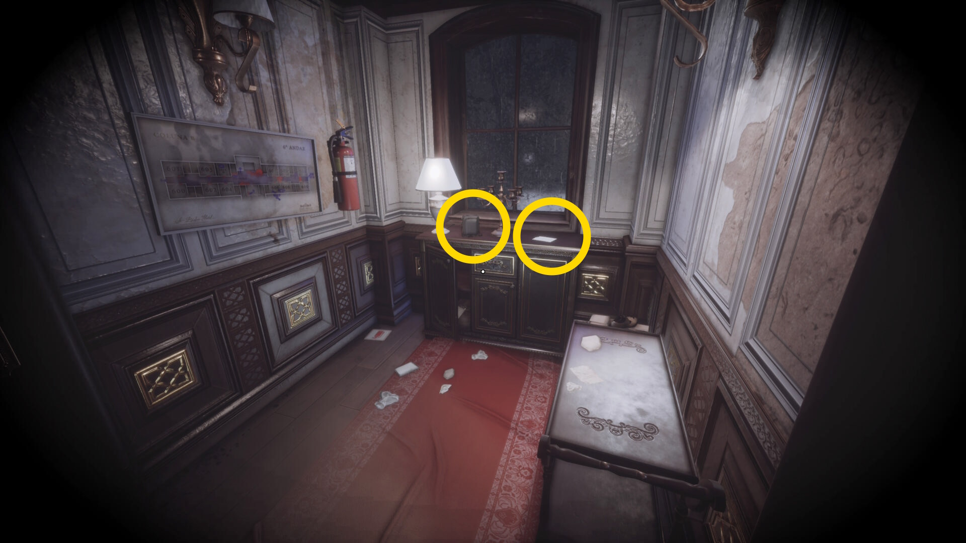 • 6階のサービスルームに入り、エレベーター1階のボタン を回収(その上の箱から 包帯 を回収)