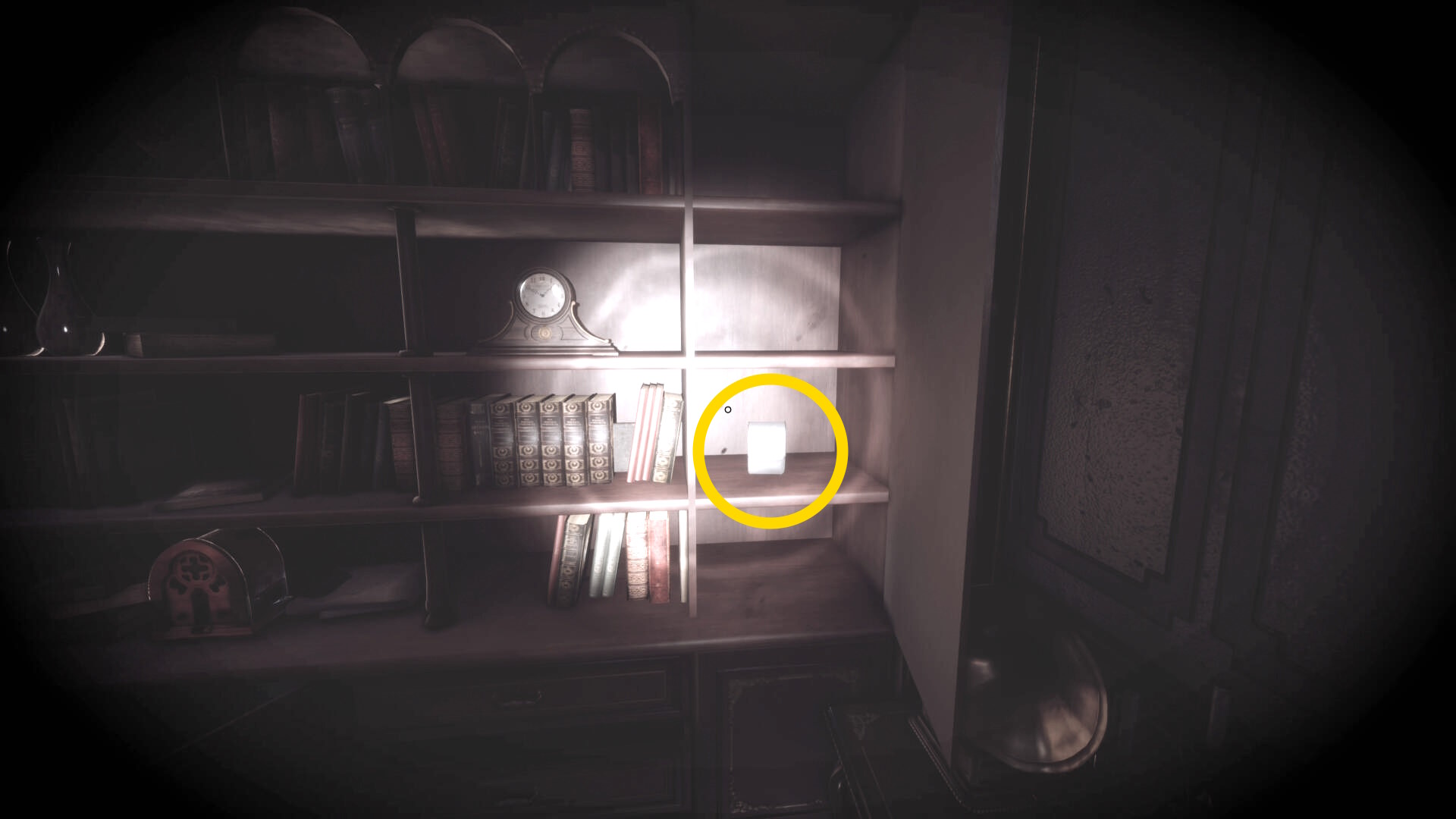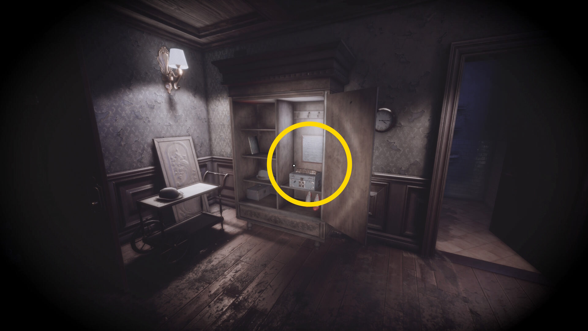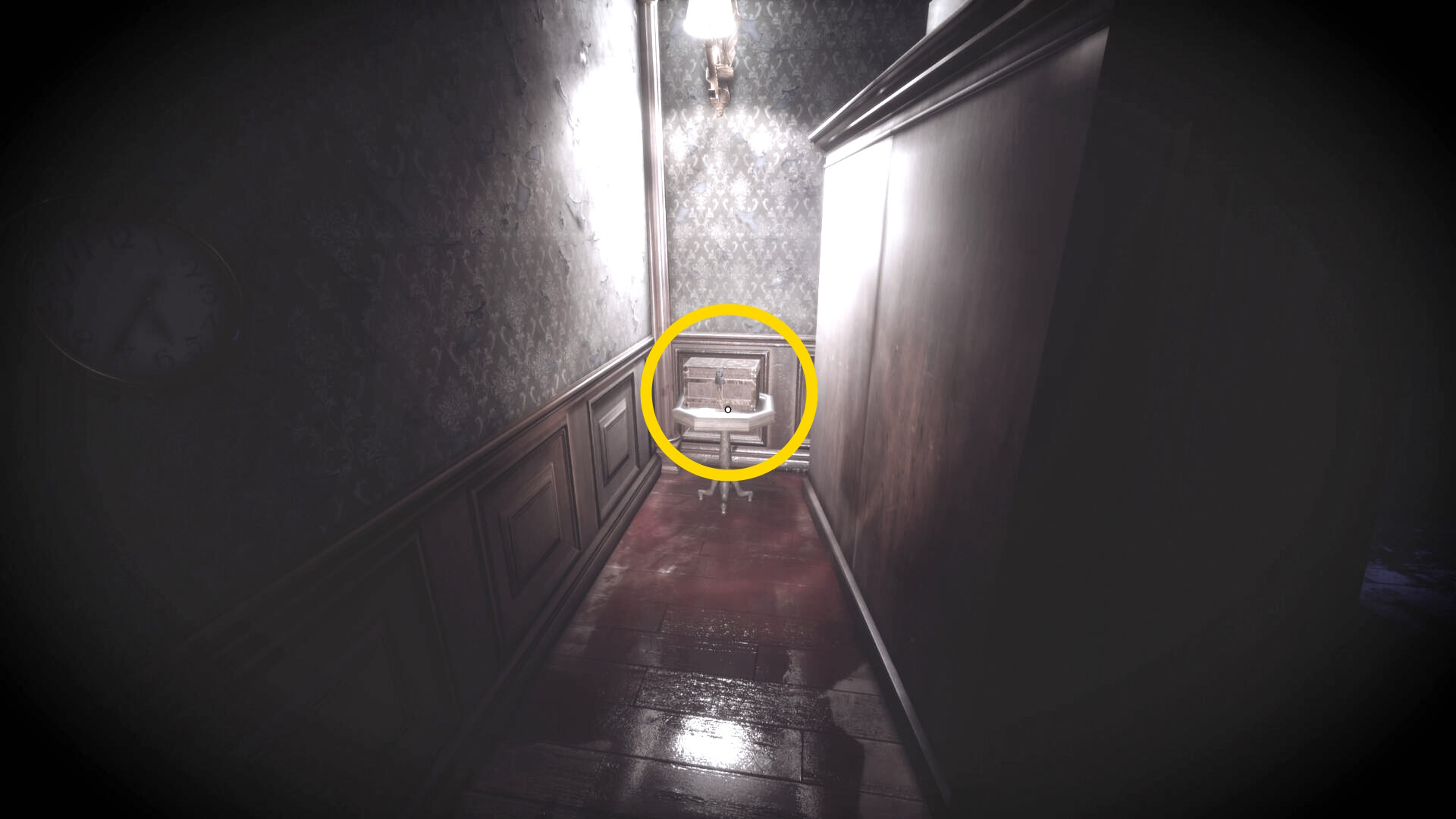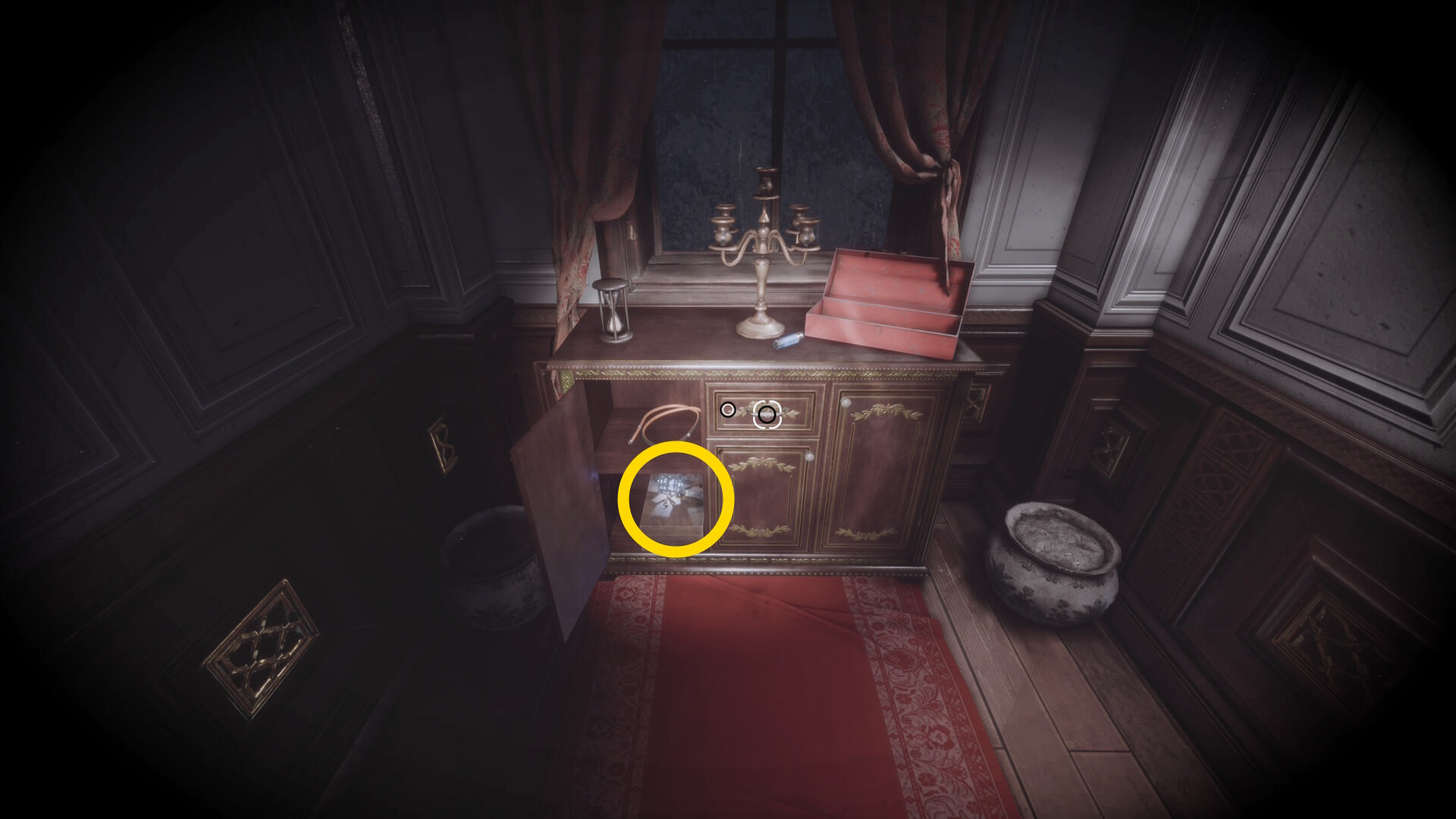 • 1階に下りて壁掛け時計(セーブポイント)の左にあるキャビネットを解錠し、鉄の部品4 を回収