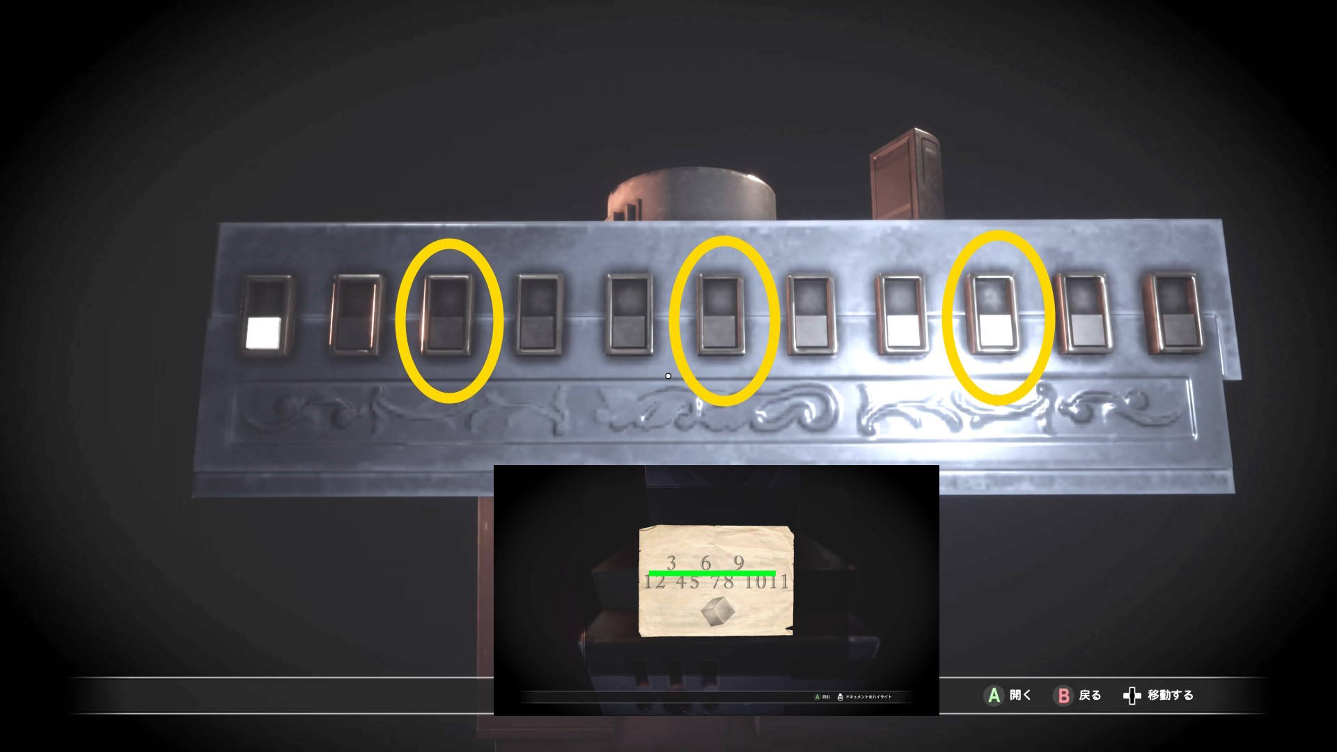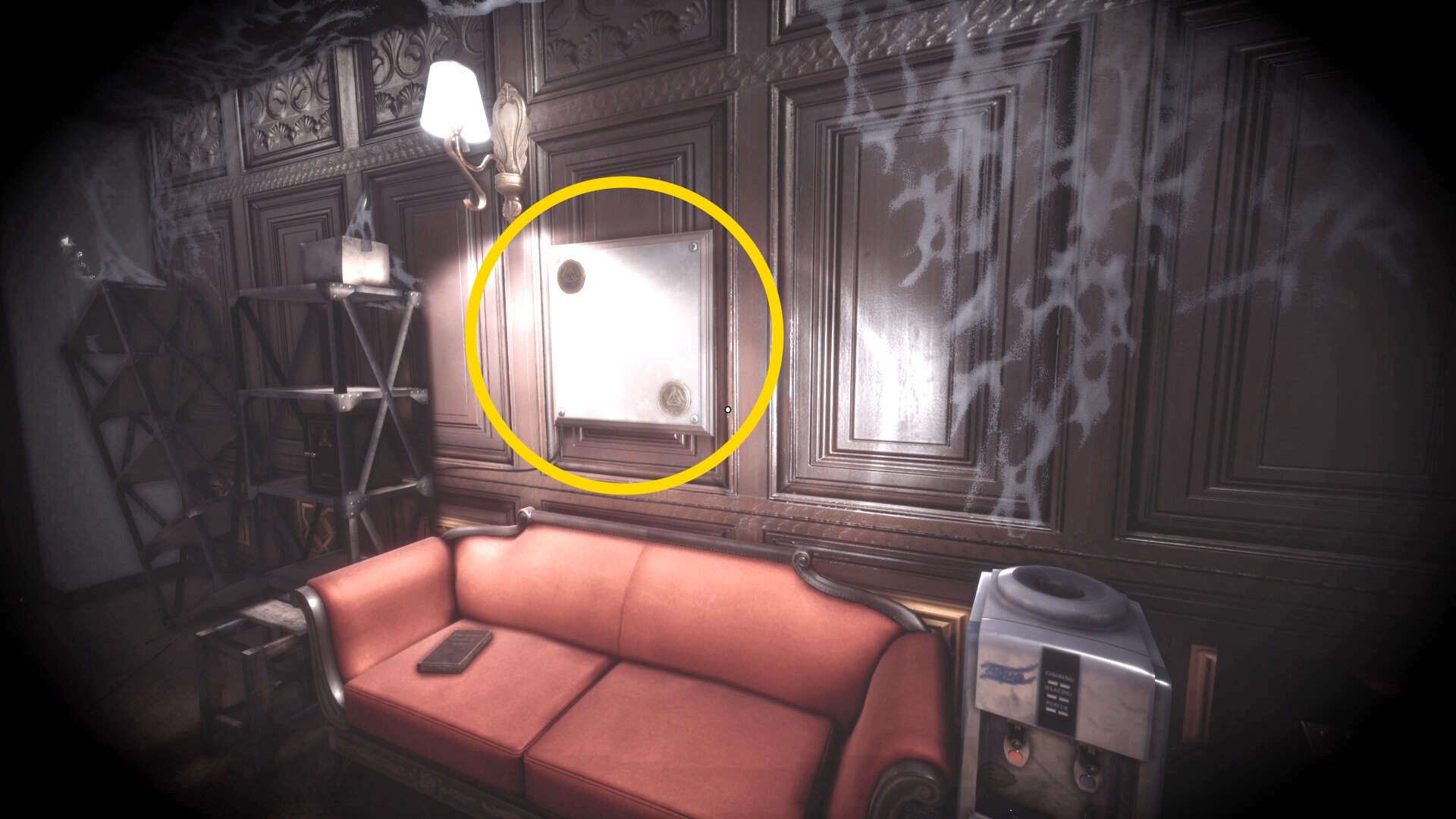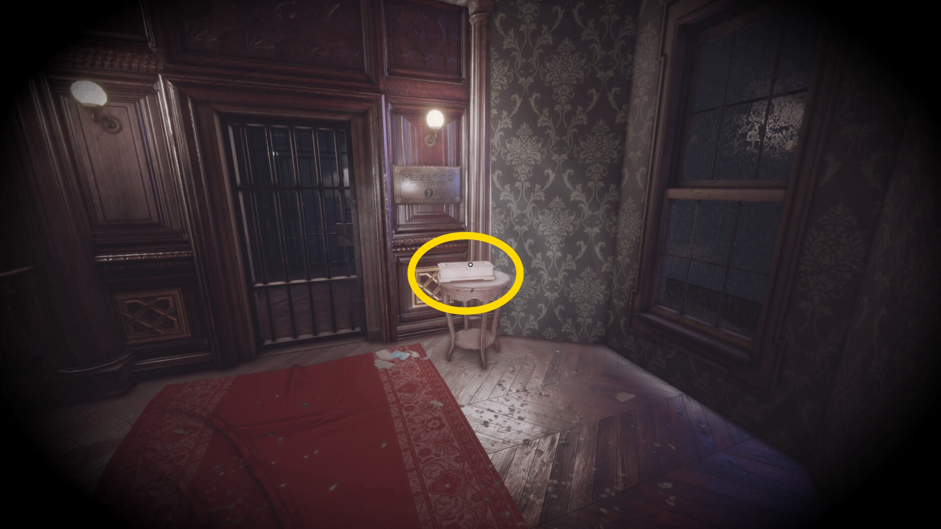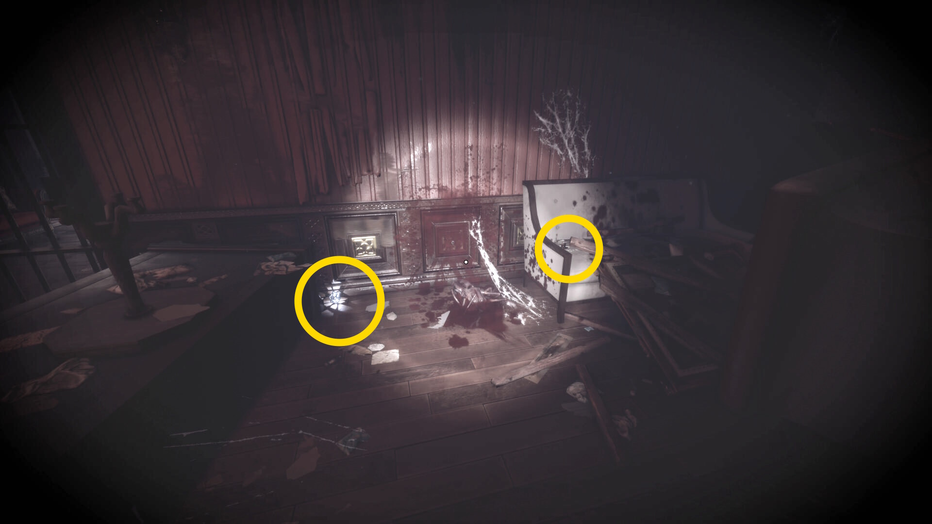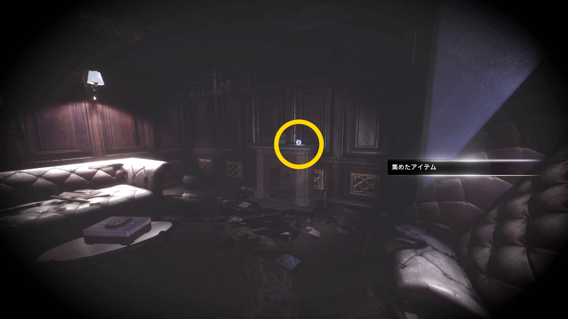 • 1階に下りて壁掛け時計(セーブポイント)の左にあるキャビネットを解錠し、鉄の部品4 を回収