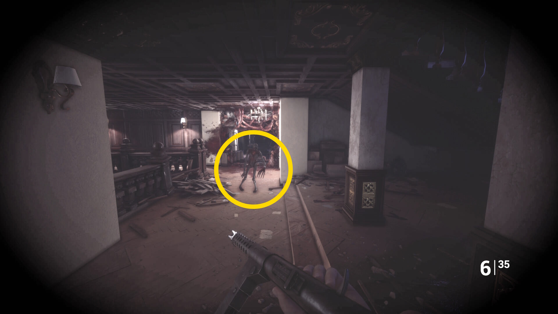 • 部屋を出て階段を登り、右に U ターンして次の部屋に入る ⇒ すぐ敵がいるのでキル