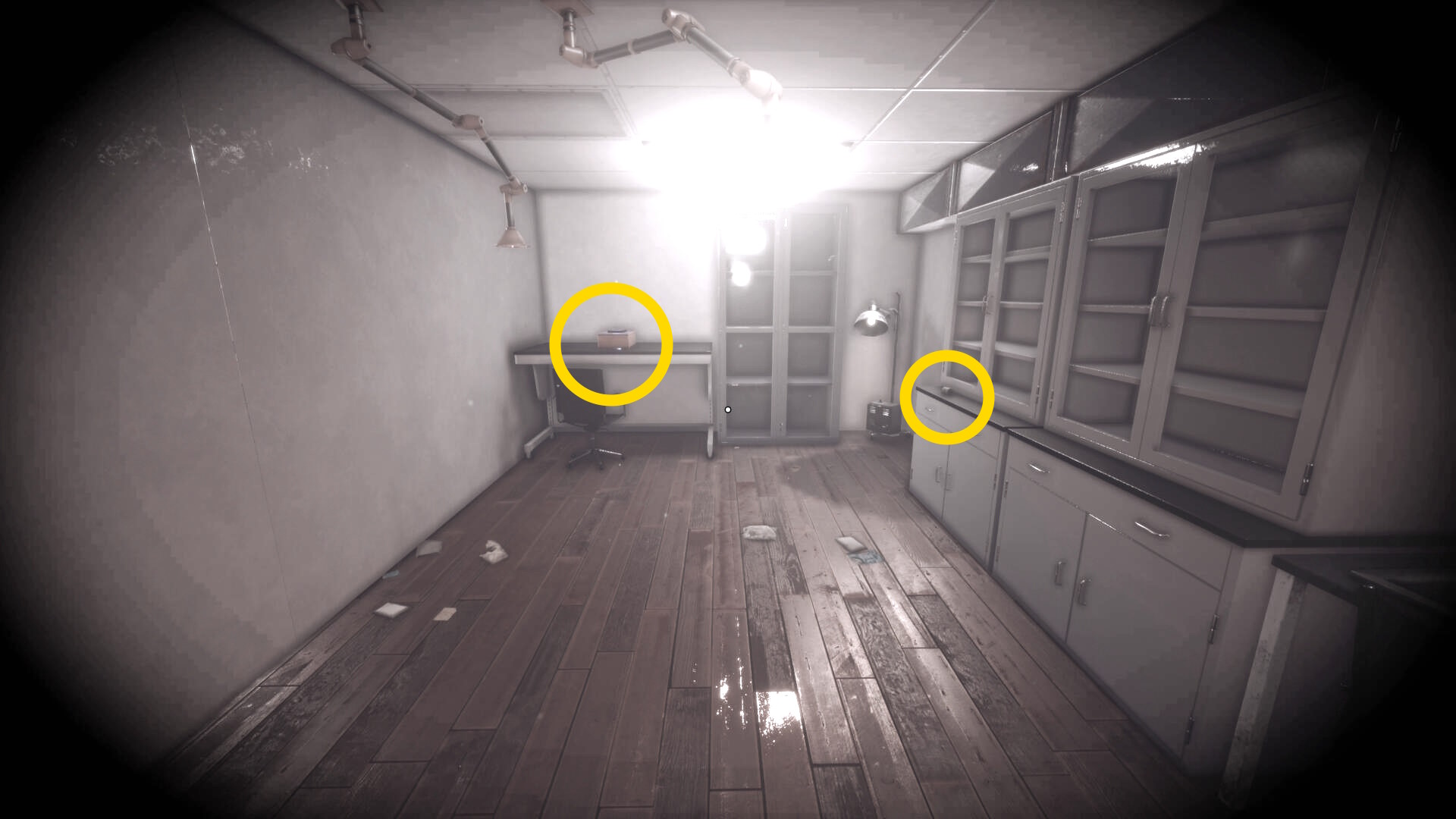 • 廊下を進み、エレベーターを過ぎた少し先、右側の倒れた棚から ガーゼ 回収し、絆創膏を組み合わせて包帯を作る
