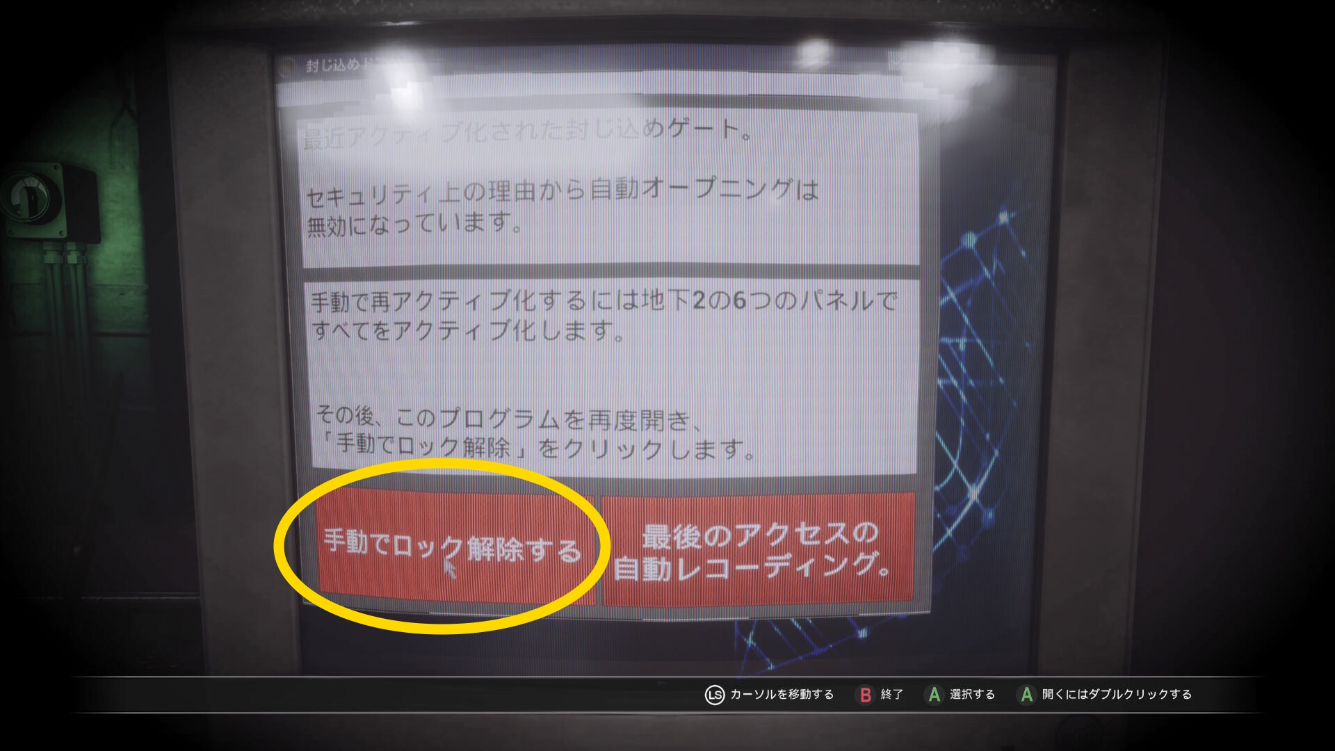 • 研究所03のモニター ⇒ 封じ込めドアと進み、「手動でロック解除する」を選ぶ