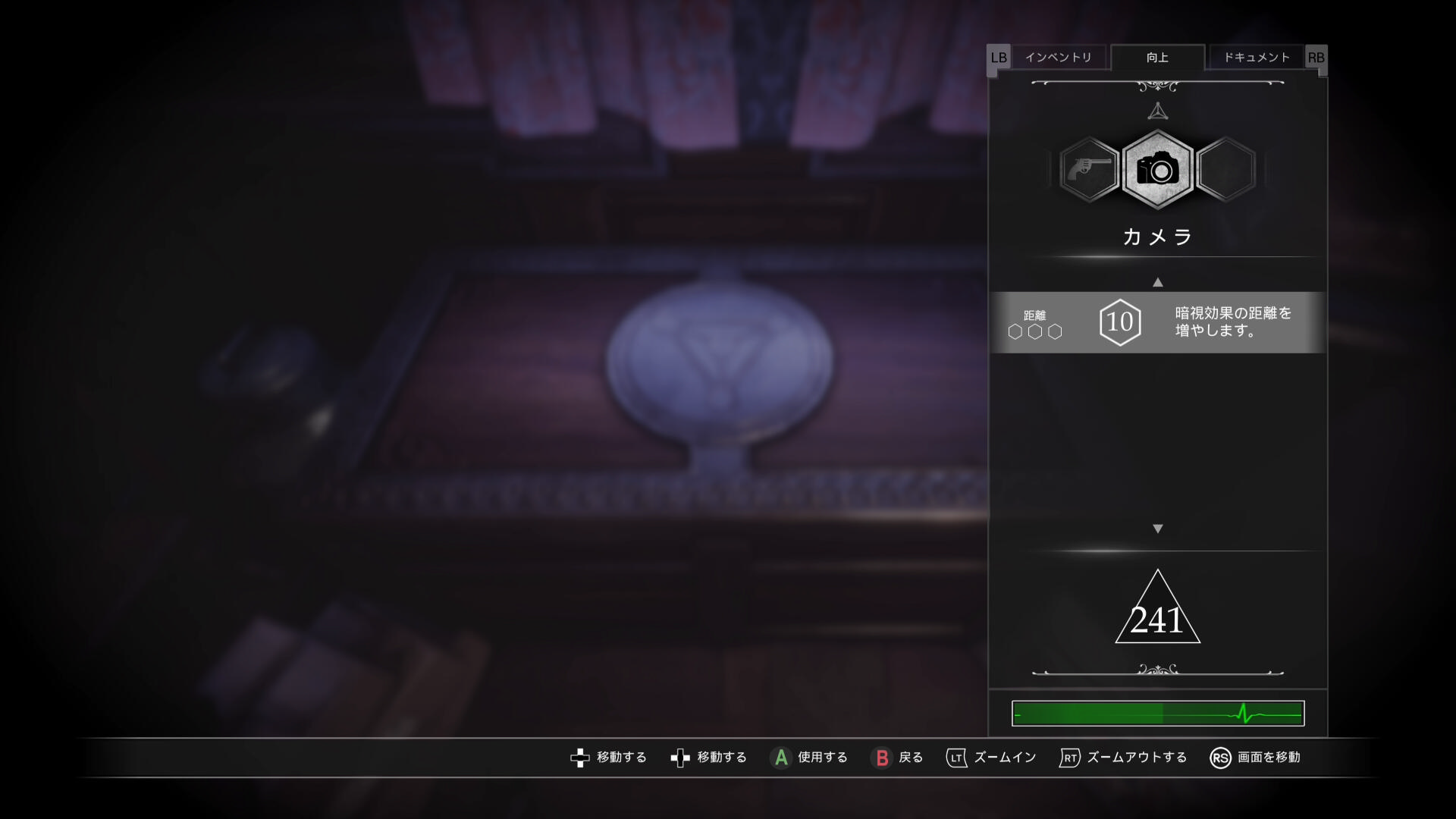 • 1周目と2周目でアップグレードアイテムを取りこぼしなく回収した場合、アップグレードに使えるポイントが「240」になっているはず(下画像はアップグレードアイテムを1個回収したあとなので241になっている)