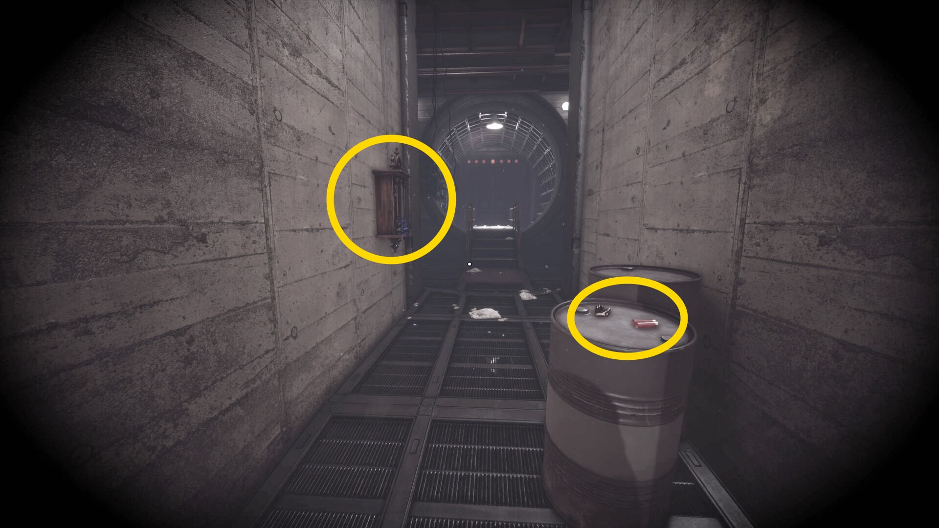 - エレベーターを降りたところ、ドラム缶の上に ピストル弾薬 と ショットガンシェル あり