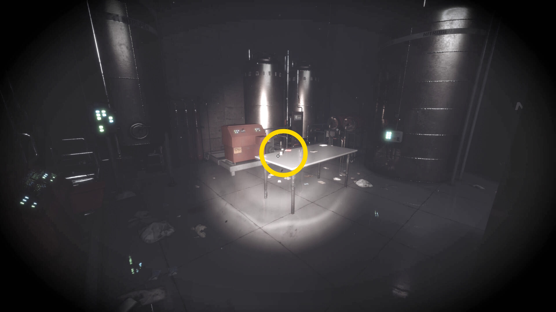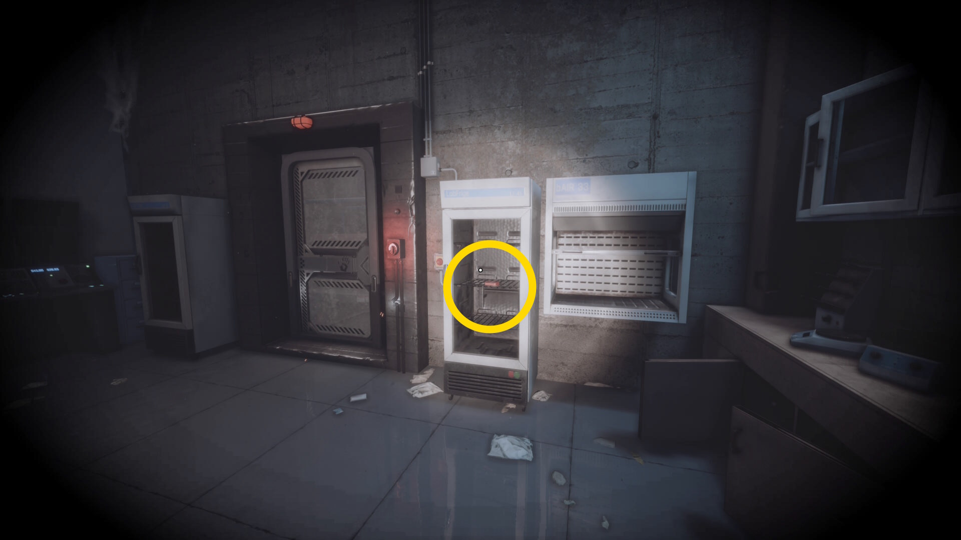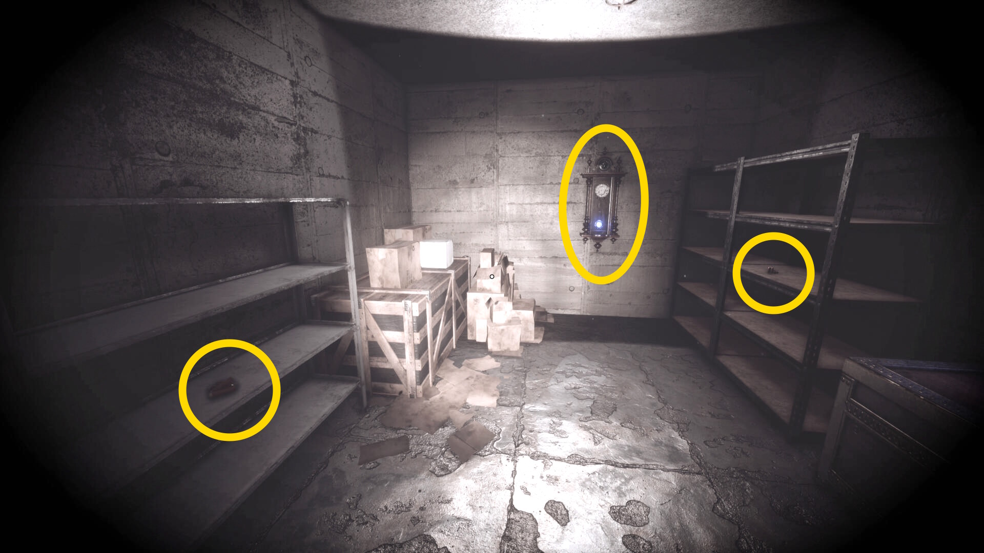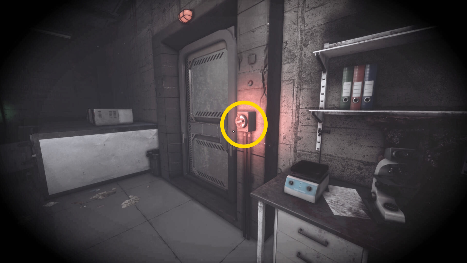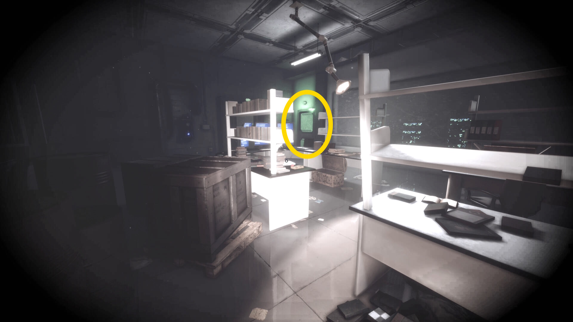 - 大きな棚が倒れて通路を塞いでいるが、暗視カメラを起動すれば通過できる