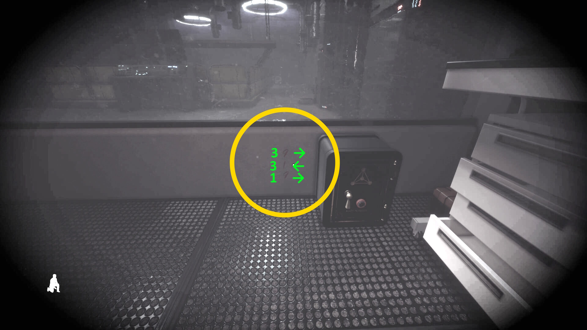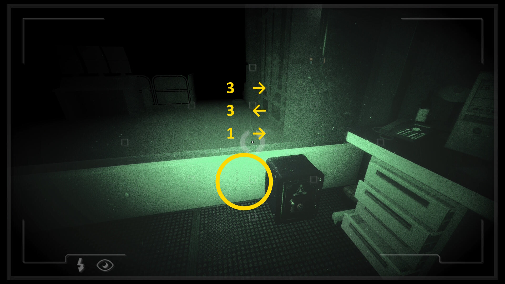 - 暗視カメラを起動して金庫の左横に数字と矢印が書かれているを確認できる(3 →/3 ←/1 →)
