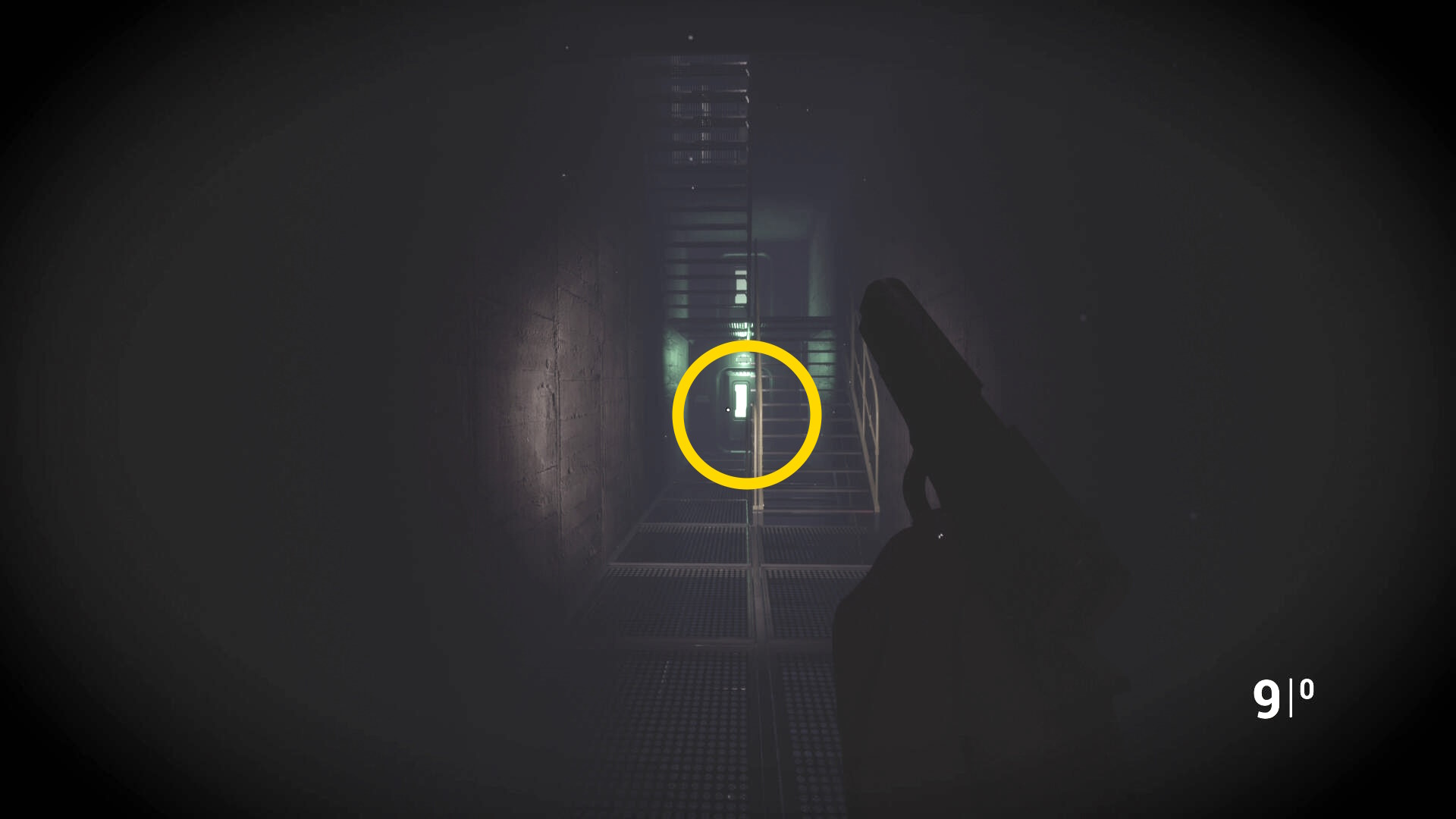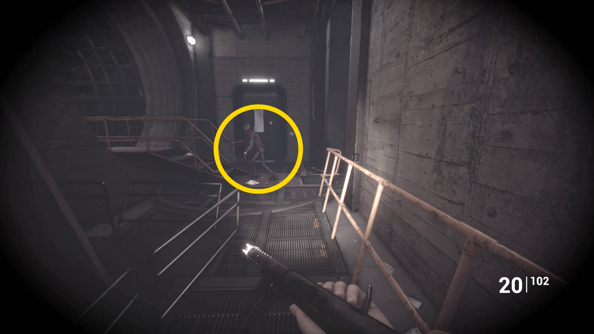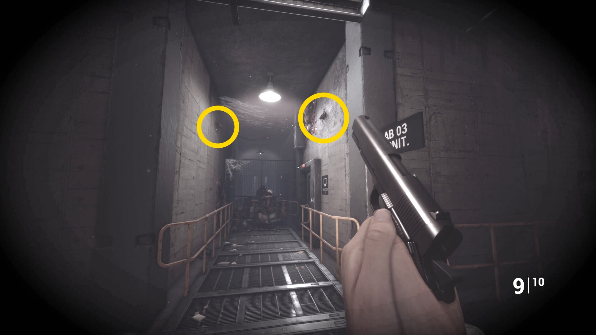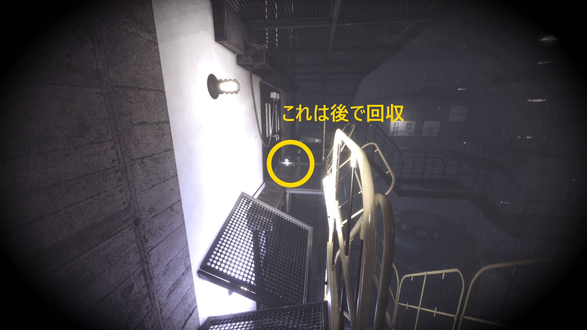 - さらに奥の階段を登るが、右に曲がったところの右壁にクモ型の敵がいるのでショットガンでエイムしたまま曲がってキルすることを推奨