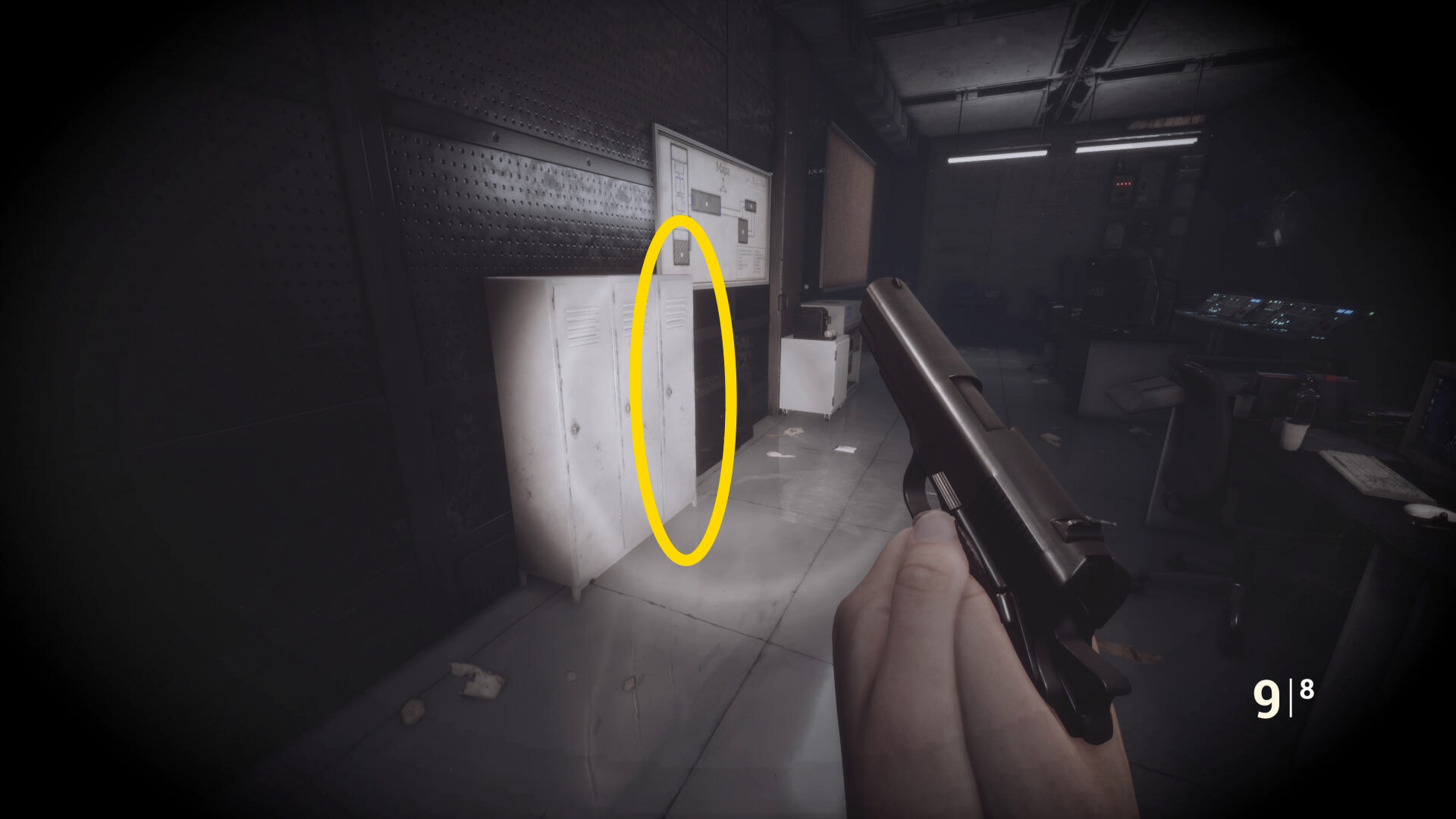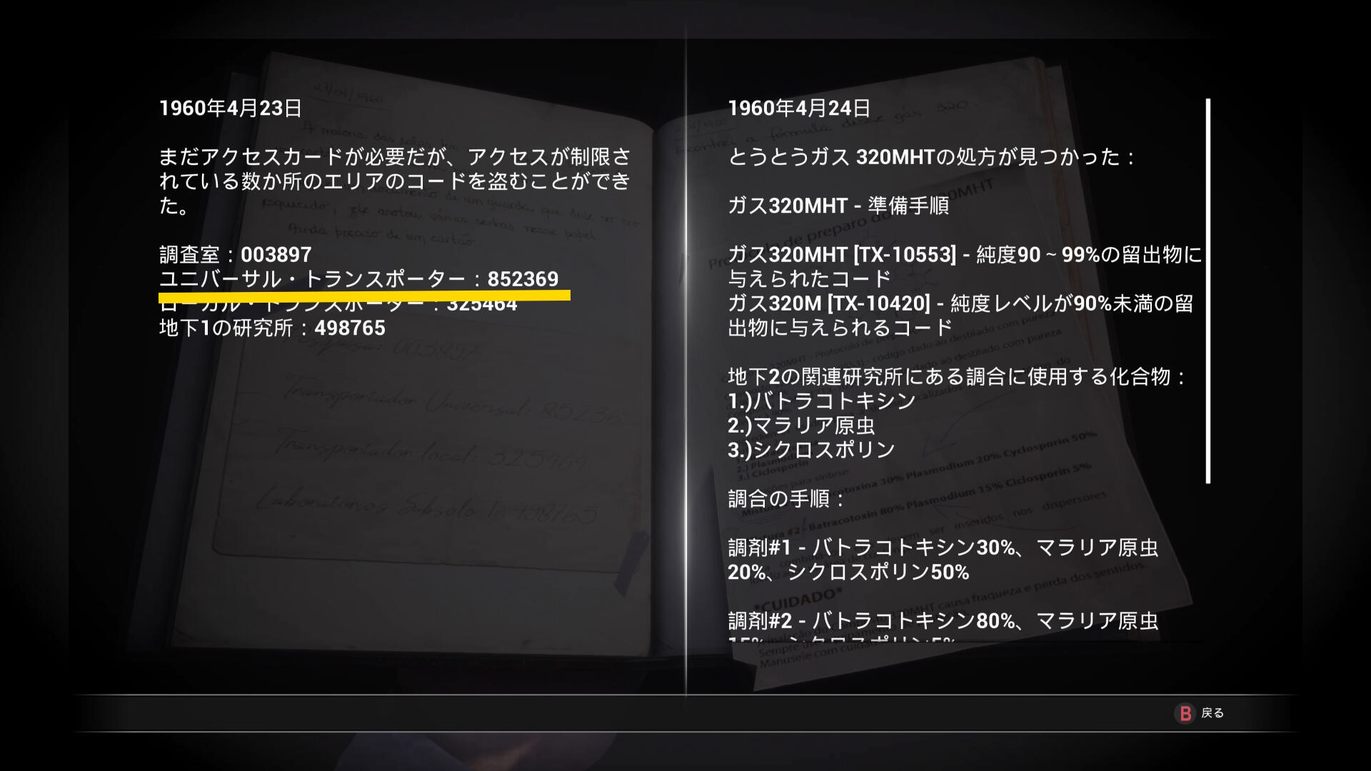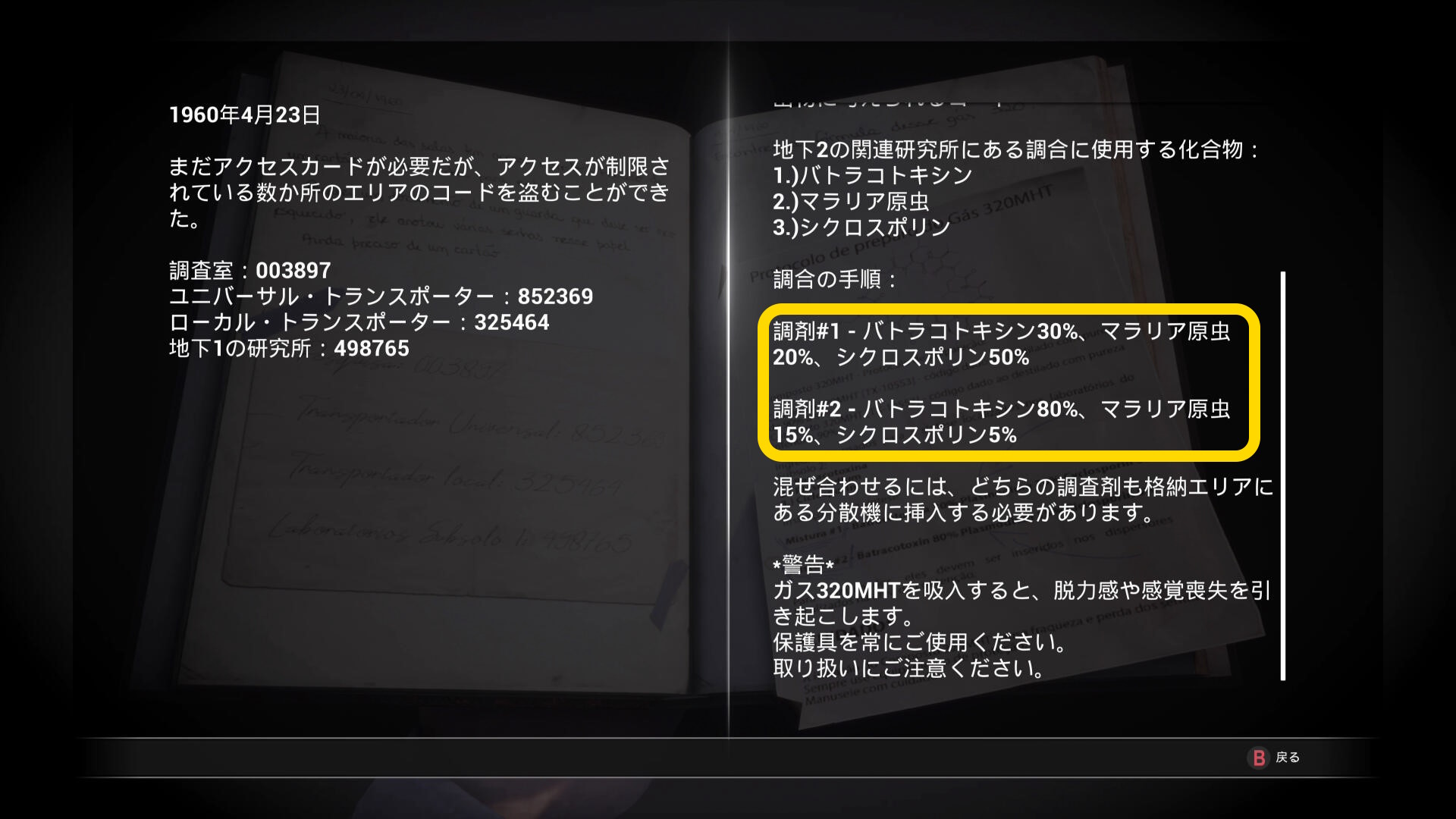 - ピストル弾薬、包帯、アクセスカードに関するメモがある