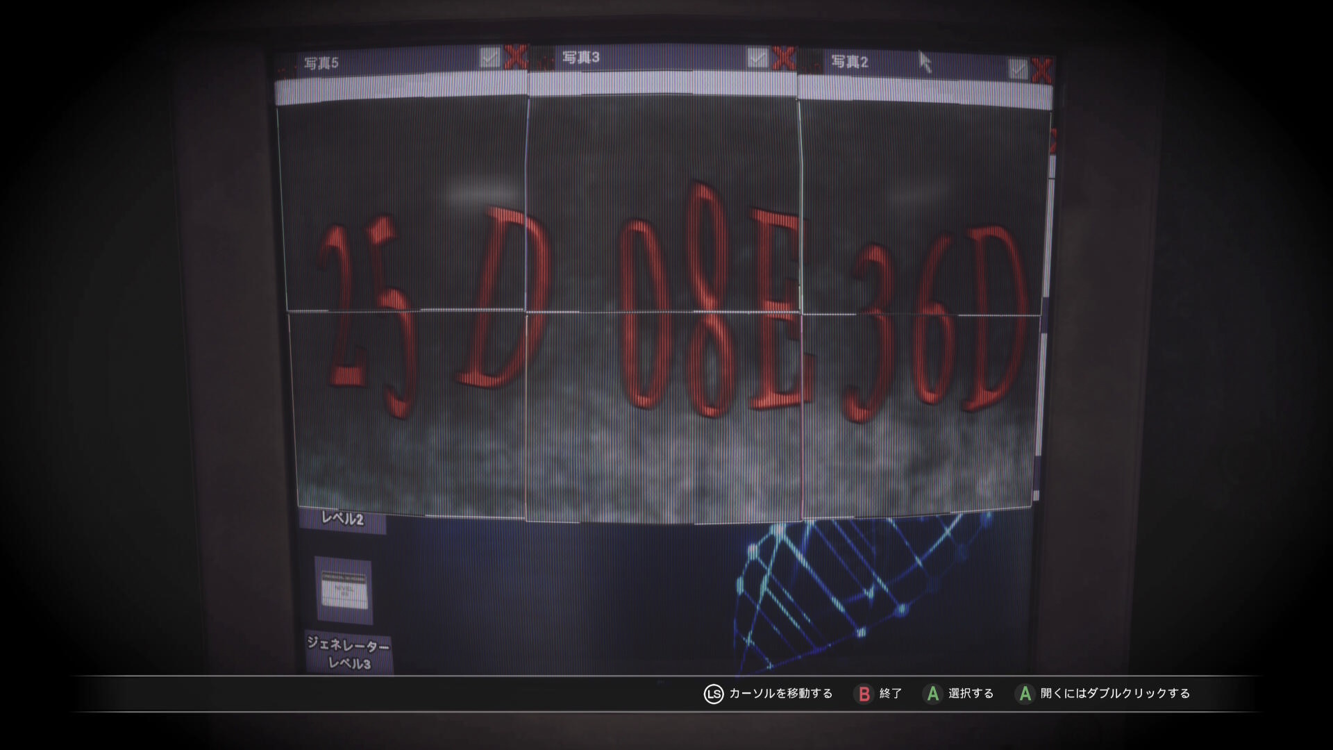 - 6枚の写真が保存されてあり、これらをダブルクリックして開き、並べることで 25D 08E 36D が判明する