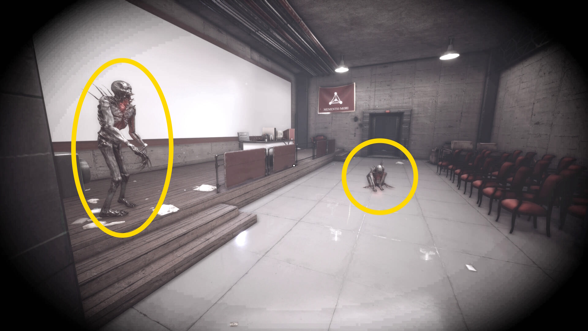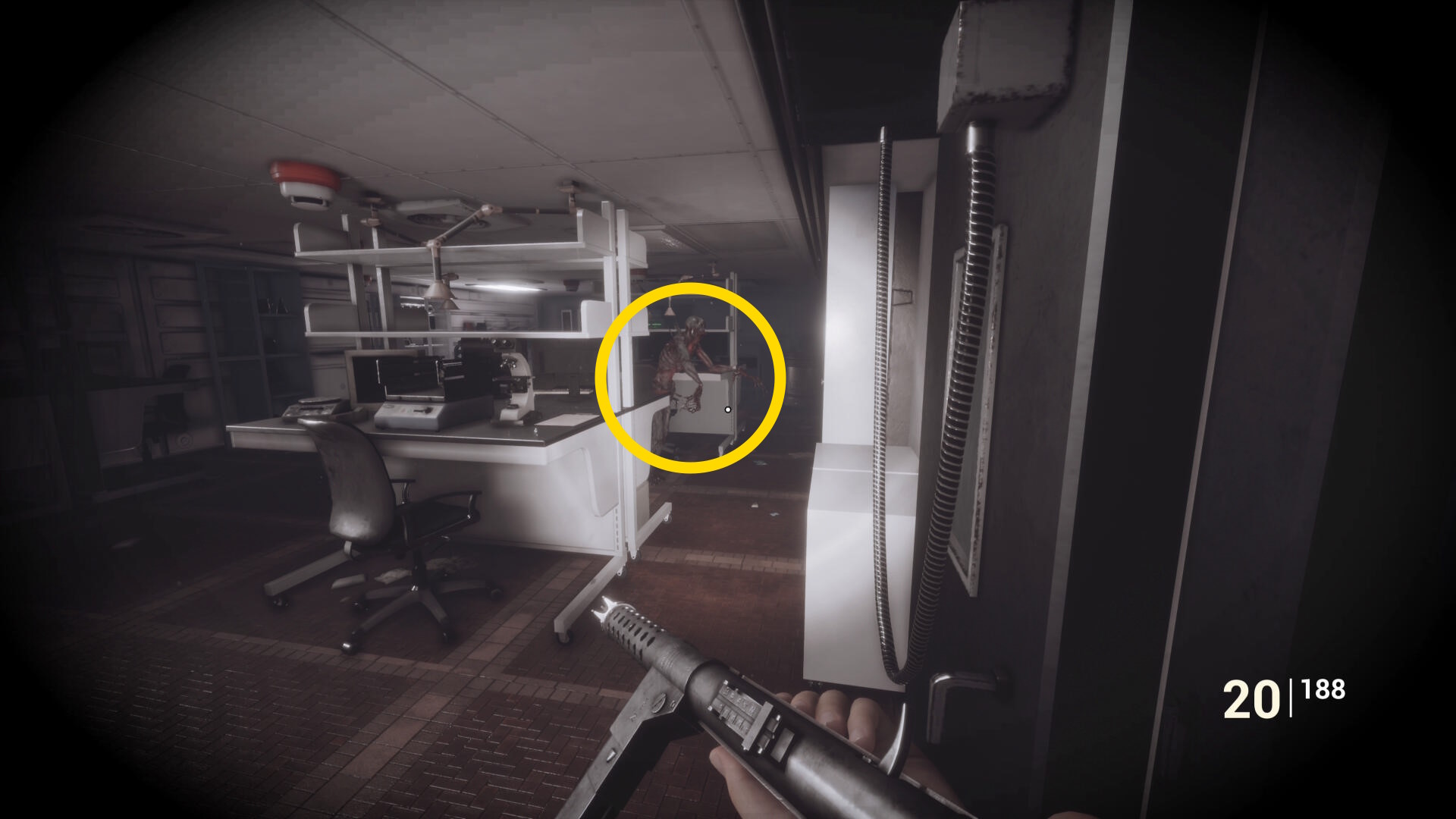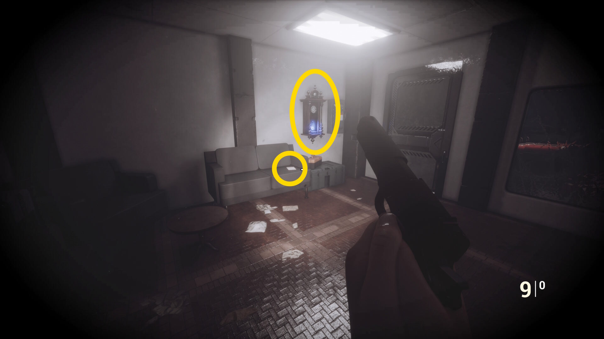 - 衝立のほうに近づくが、蛍光灯の上にクモ型の敵がいるのでキル
