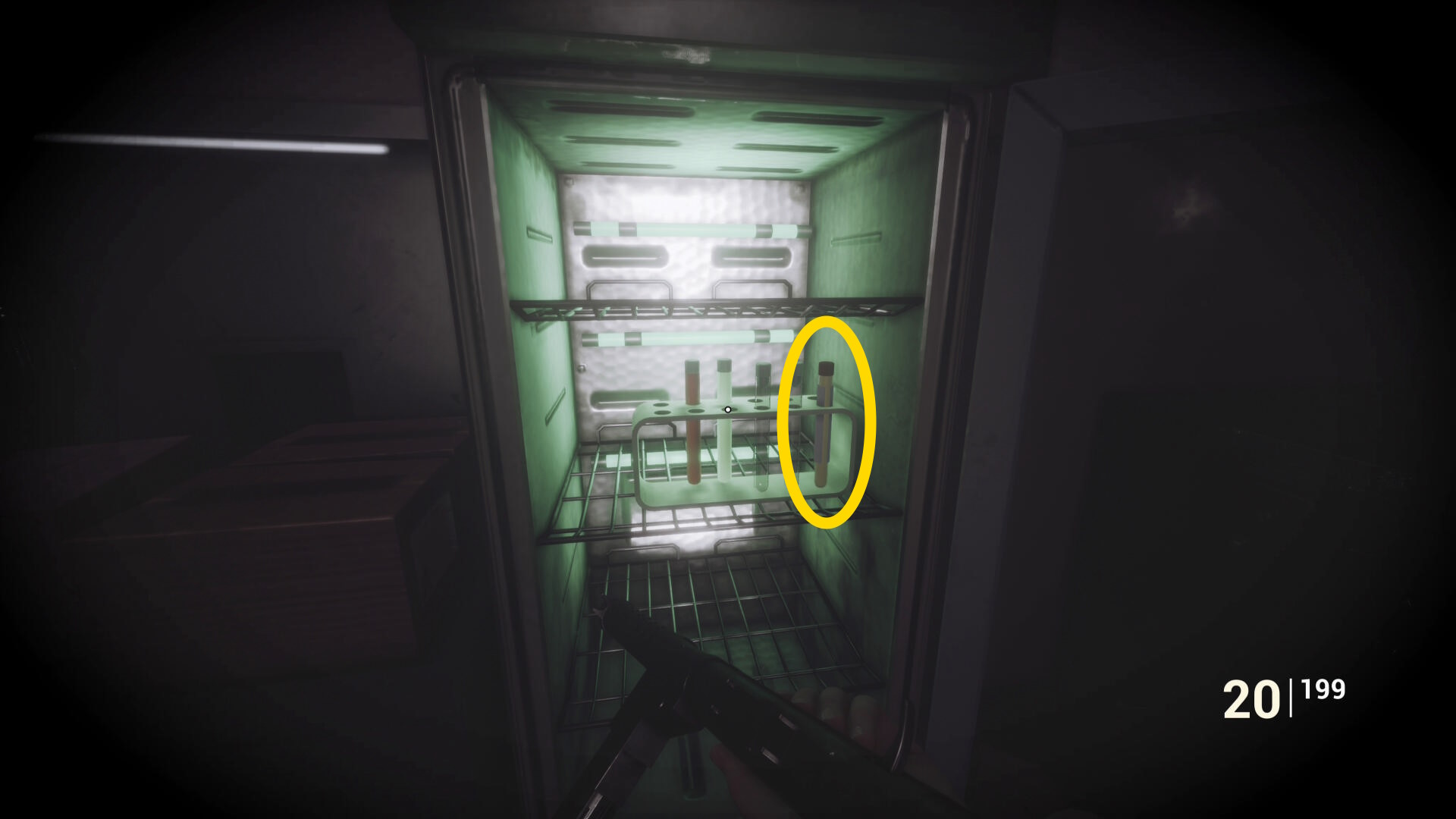 - 後ろを向くと保管庫があり、扉を開けて ガスマスク を回収(自動的に装着する)