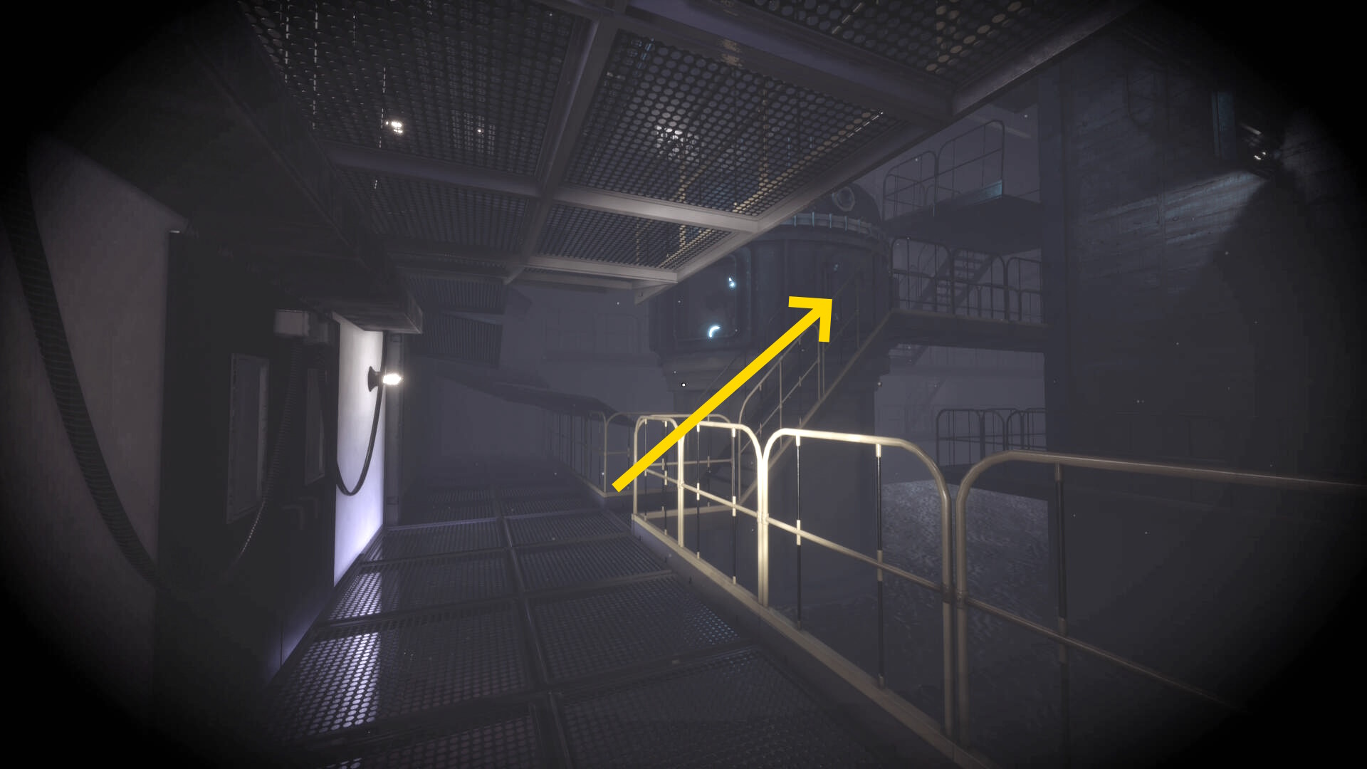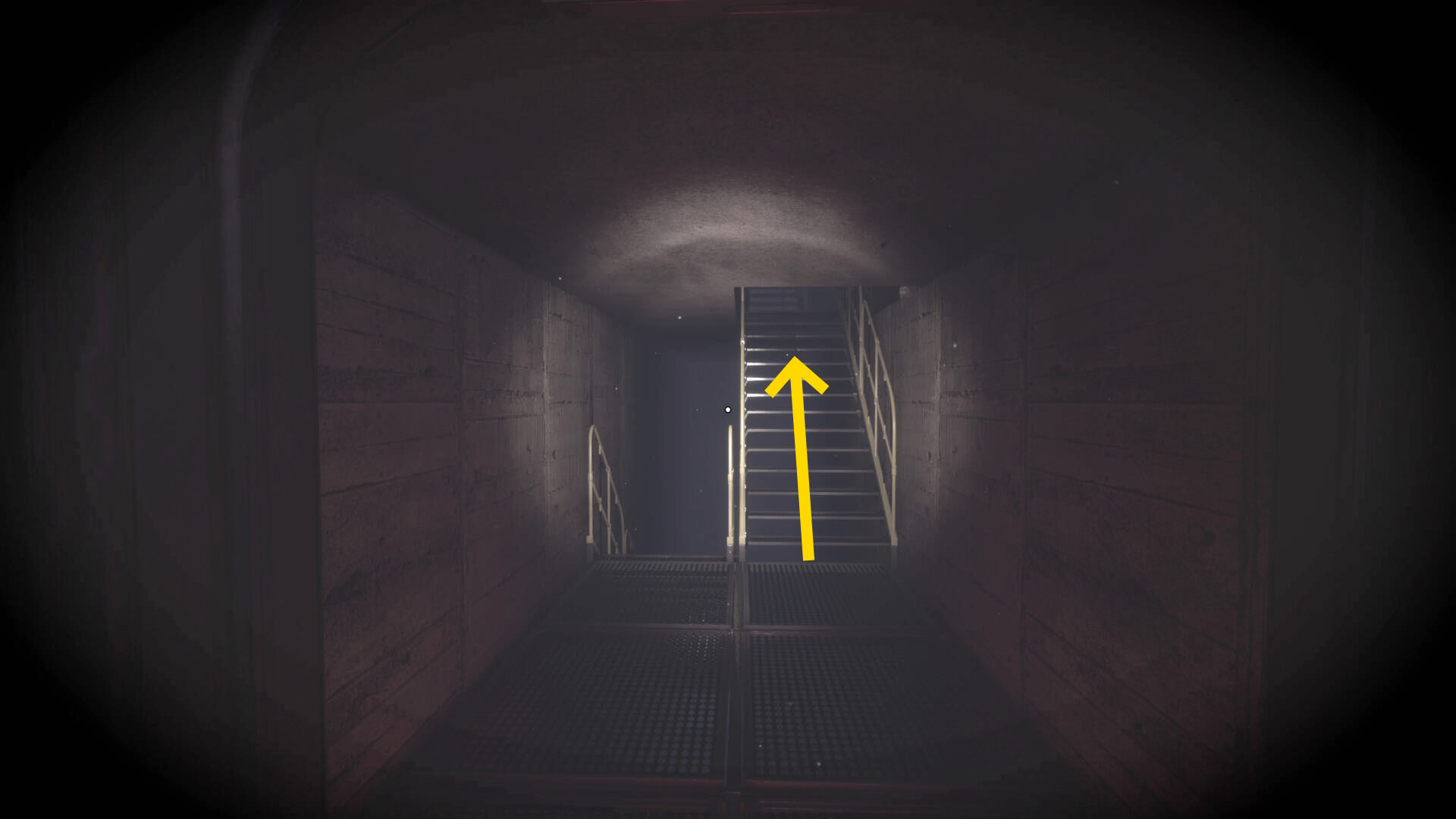 - 後ろを向き、奥に見える階段へ