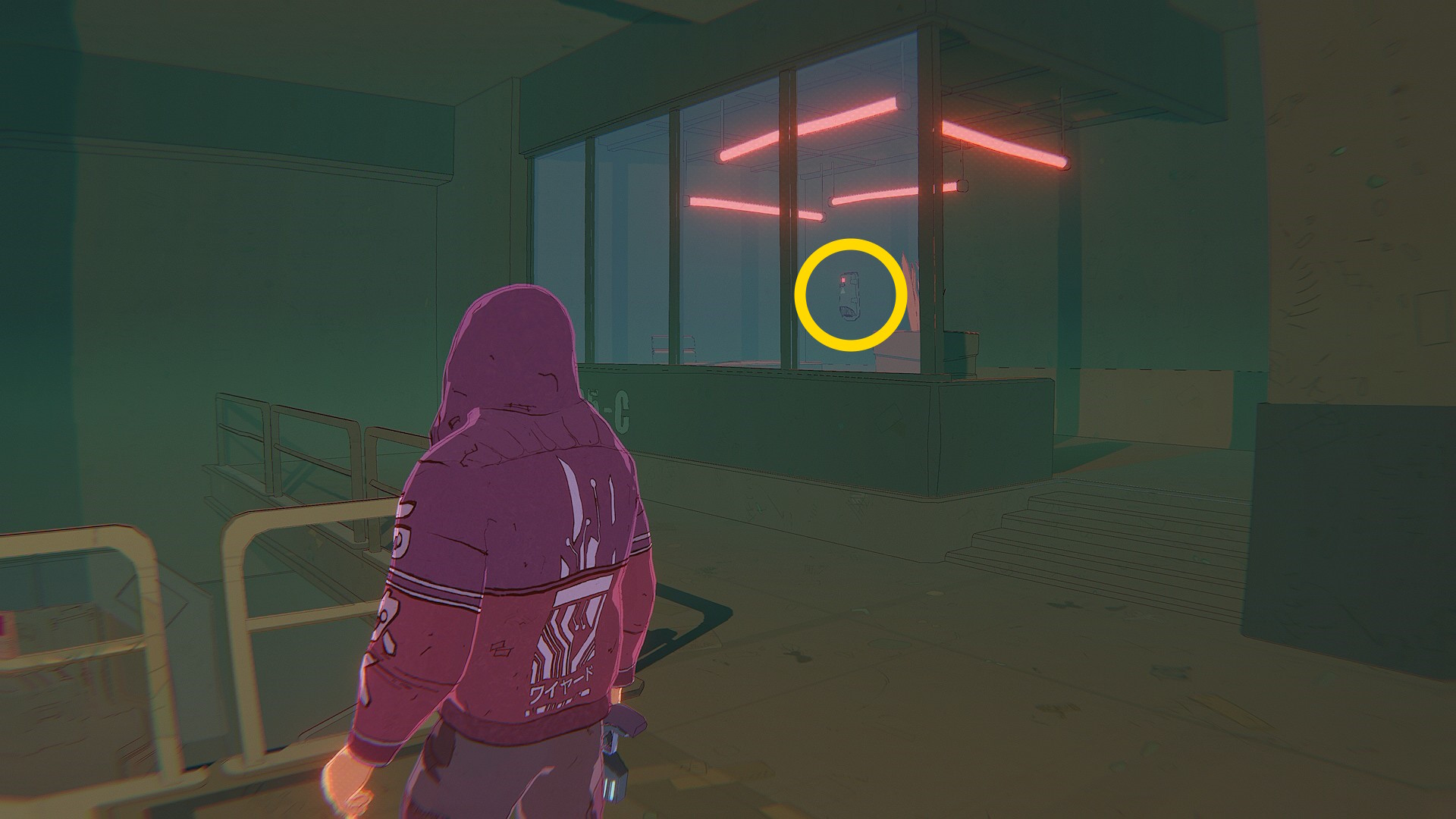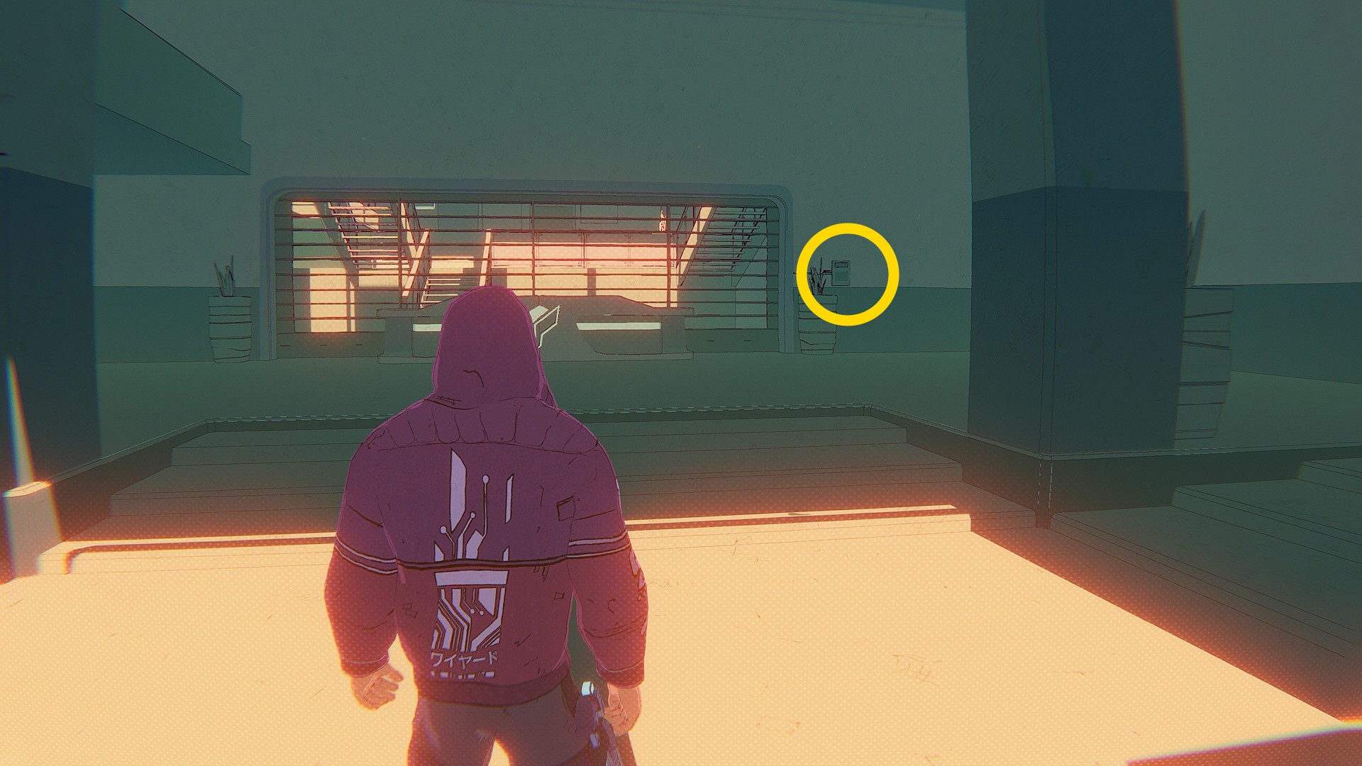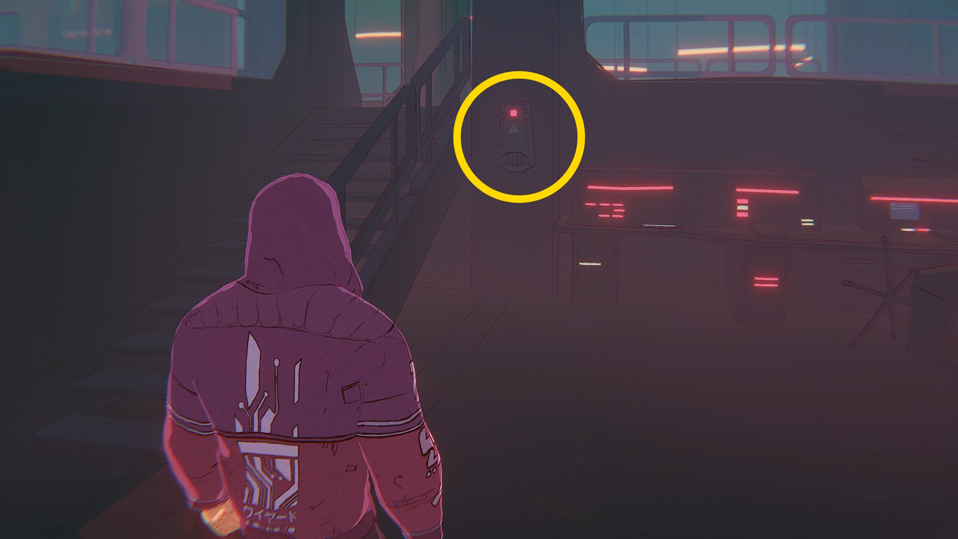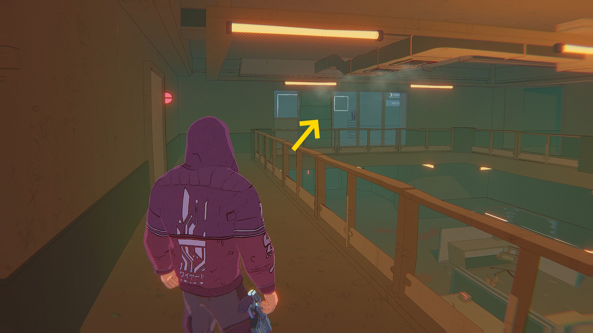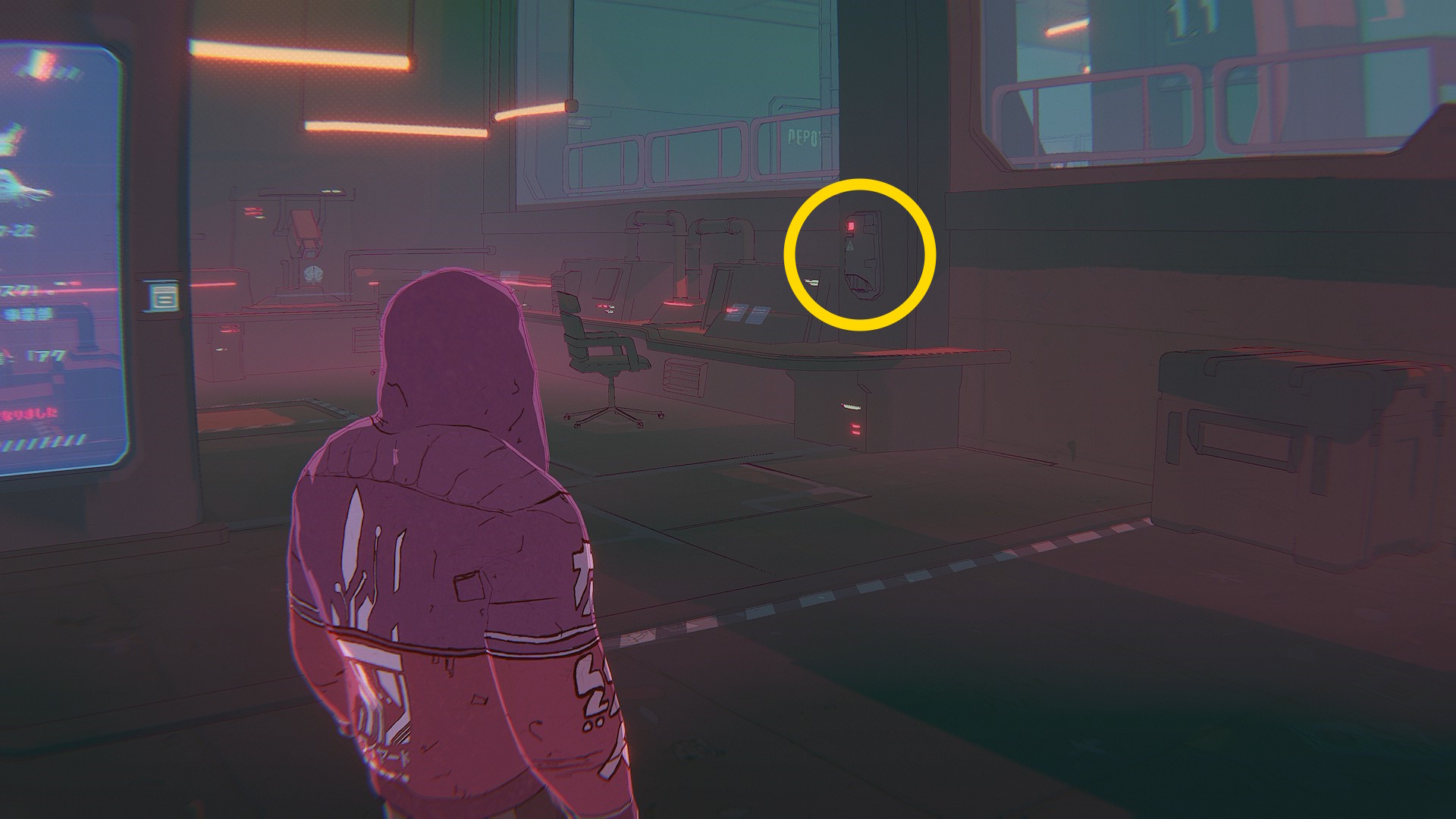 • インプラントハッキングを終えたら、その先の階段は下りずに近くのドアパネルをハッキングして中に入る