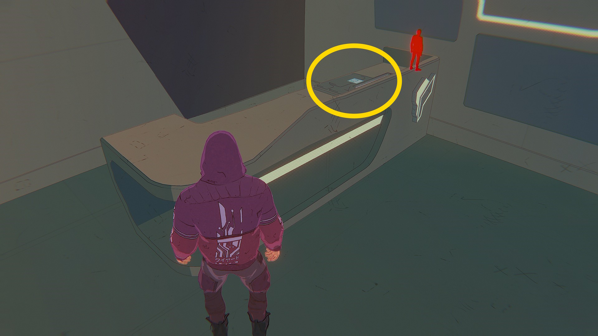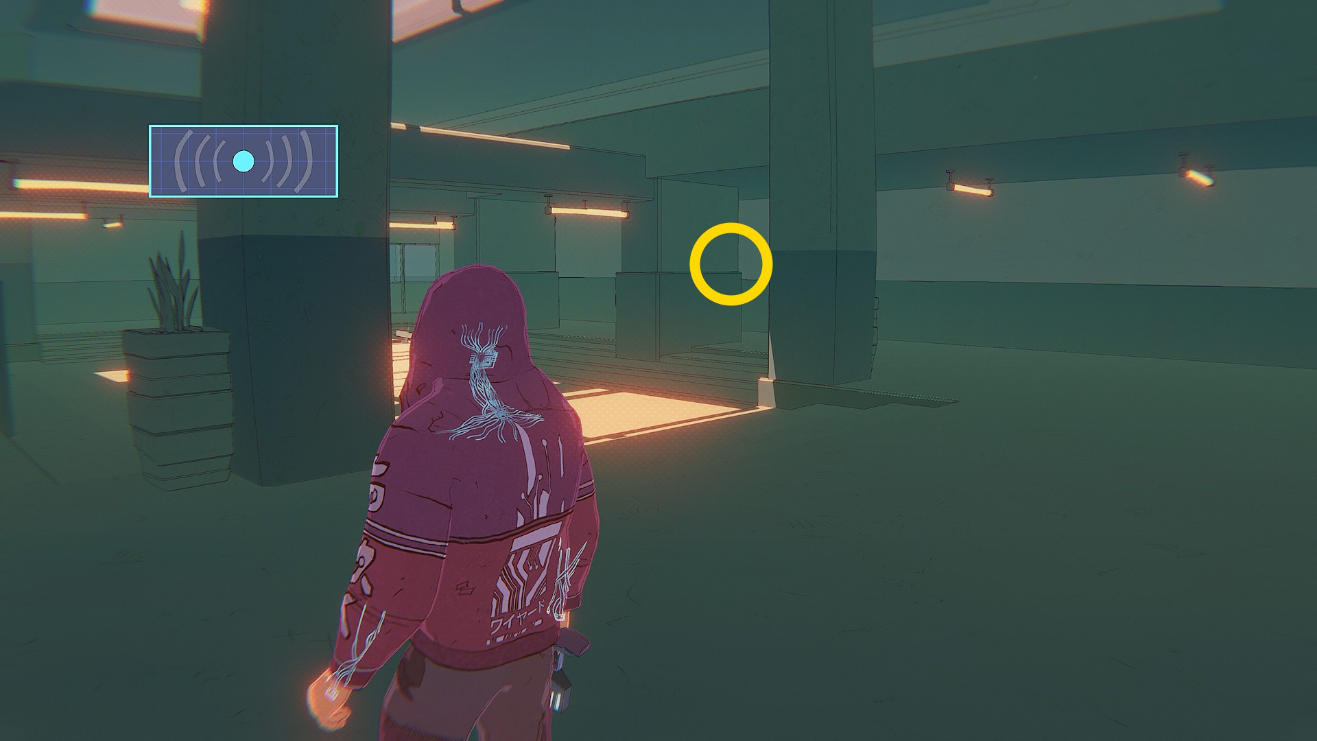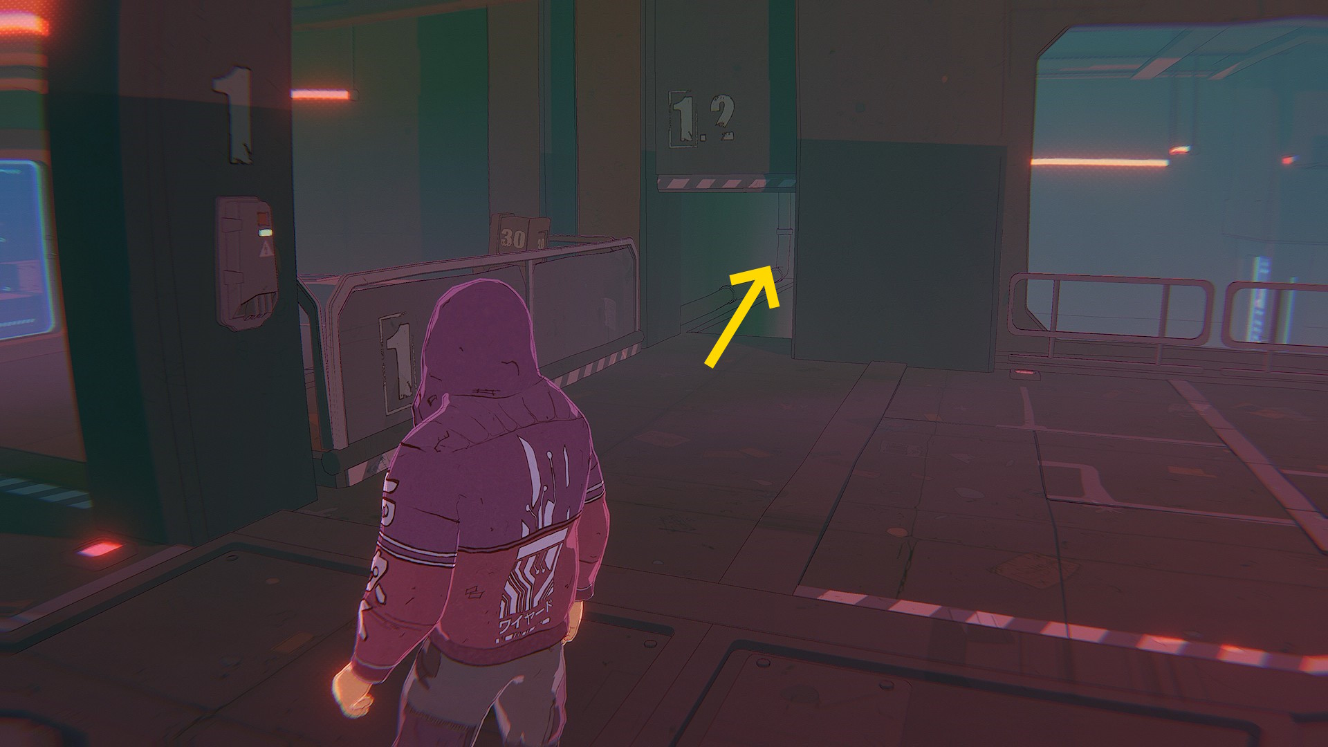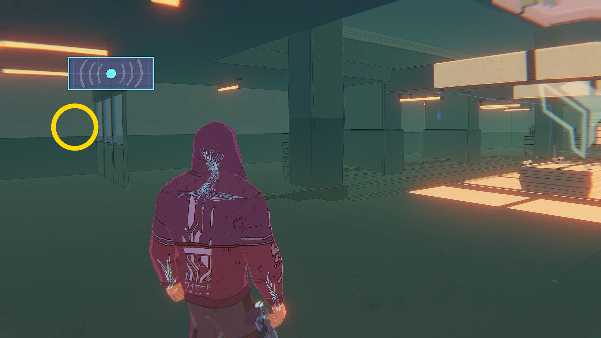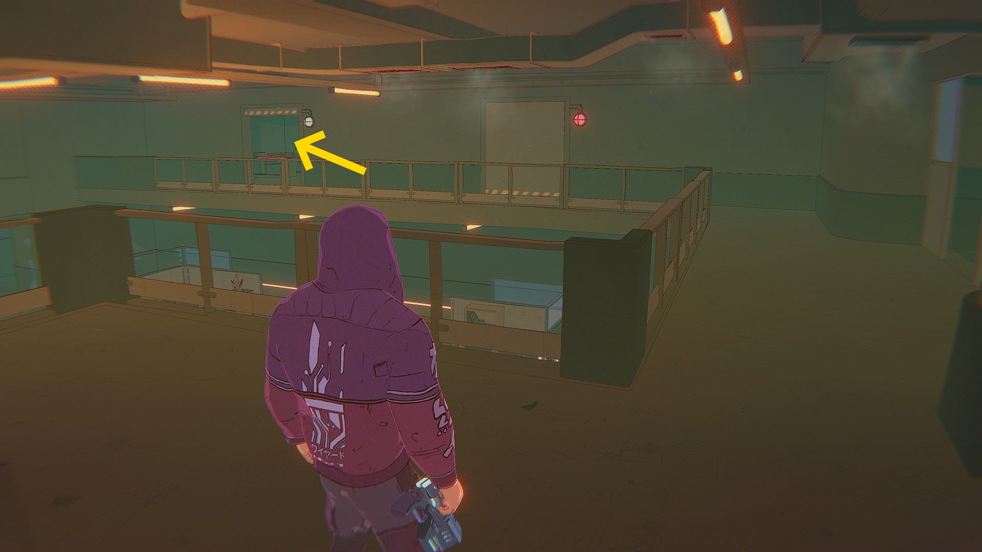 • インプラントハッキングを終えたら、その先の階段は下りずに近くのドアパネルをハッキングして中に入る