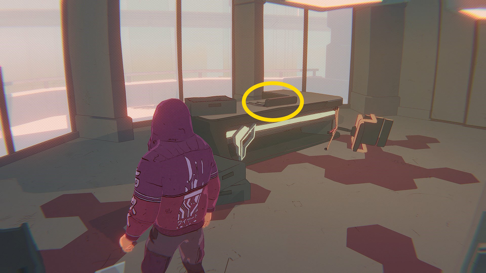 • 中に入ったら、机の上の PC を調べてエレベーターのドアを開く