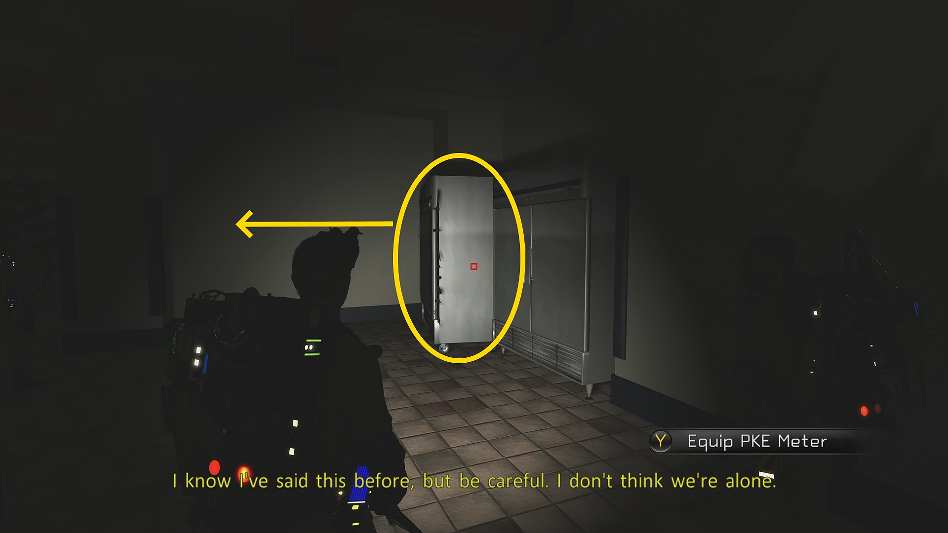 - 通路を左に曲がると冷蔵庫が2つ並んでおり、向かって左側の冷蔵庫を動かす (ブラストの LT を撃ちつつ LB を押して掴み、RS で動かす。損害額 $891 はあきらめる)