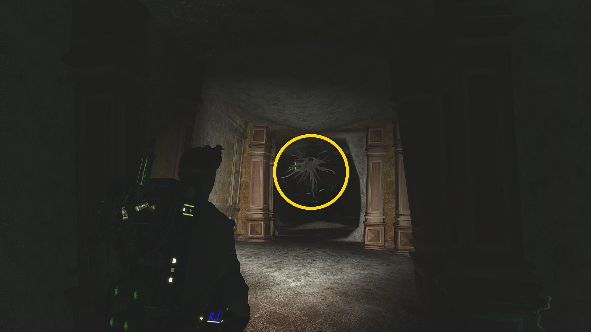 - 正面奥に進んでいき、右に U ターンするように進むとホテルの廊下が一部残っているのでそちらへ (よくわからない場合は PKE で反応がある方へ進む)