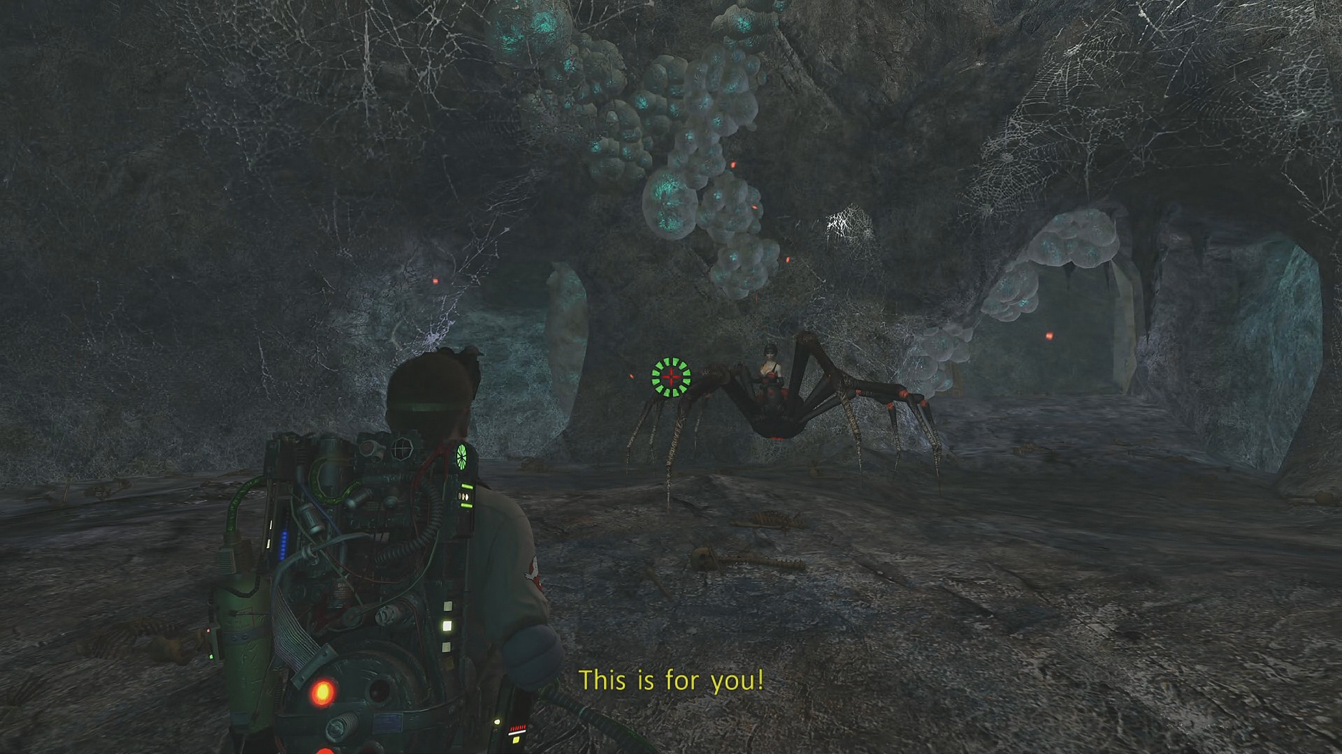 - 来た道を戻り、正規ルートを進むと人間が蜘蛛の糸にやられて吊り下げられているところにたどり着く ⇒ クモ出現
