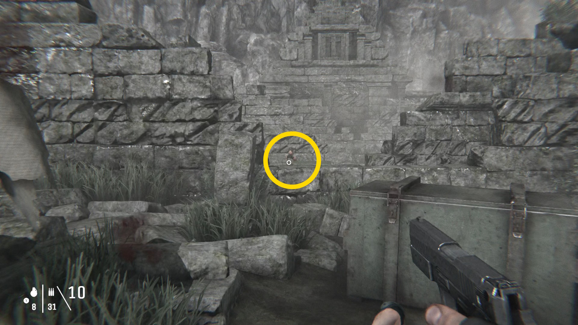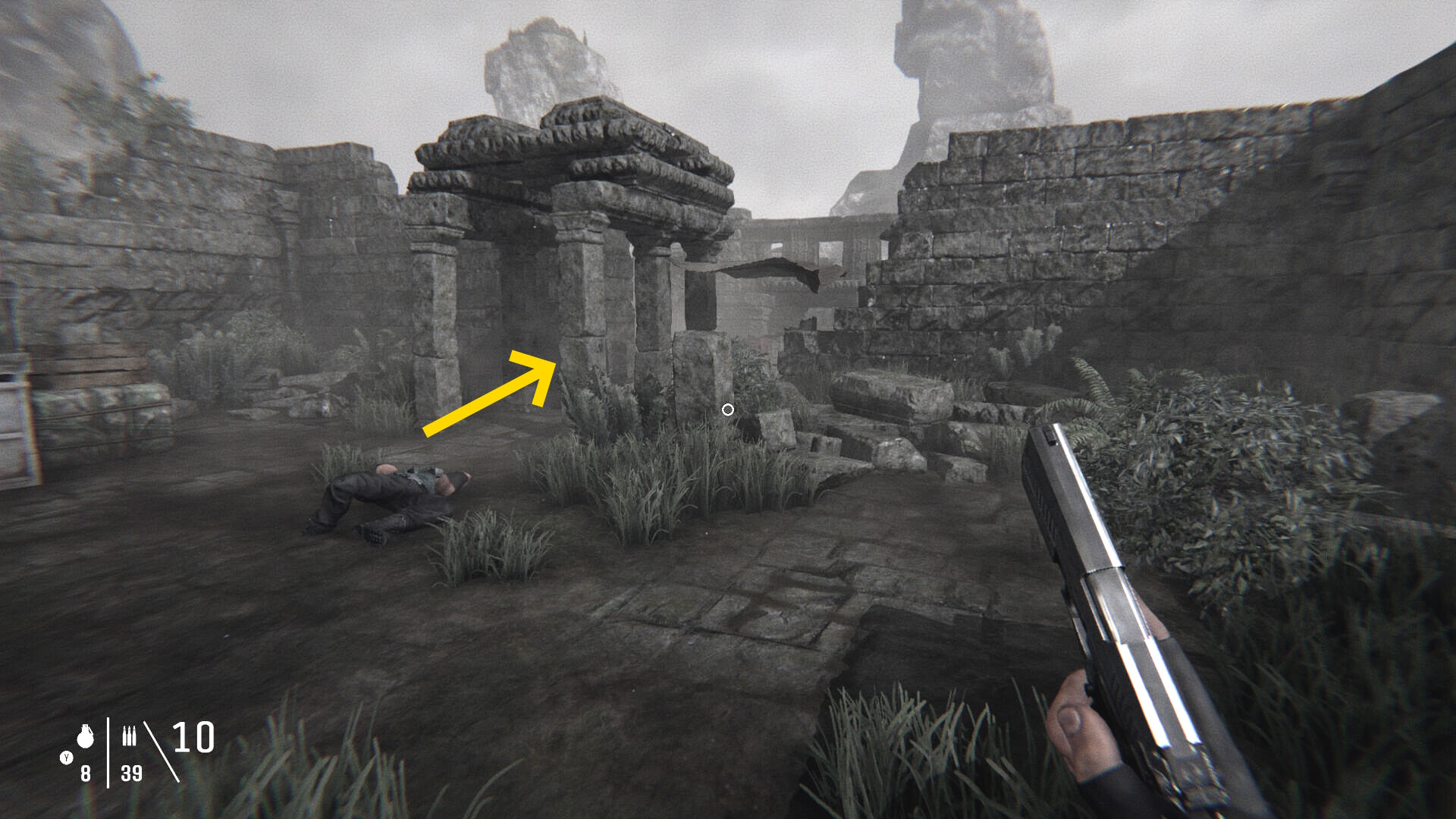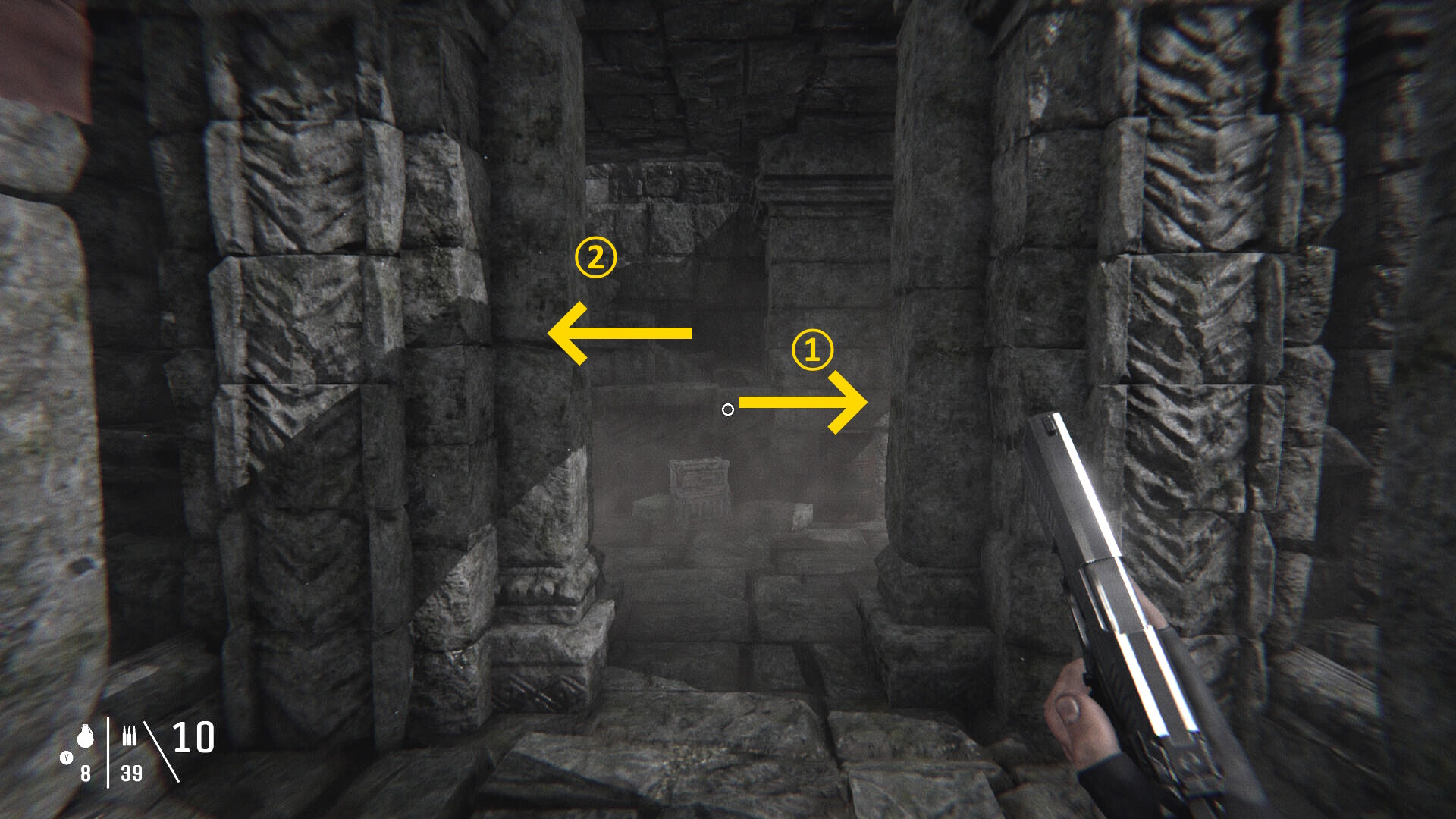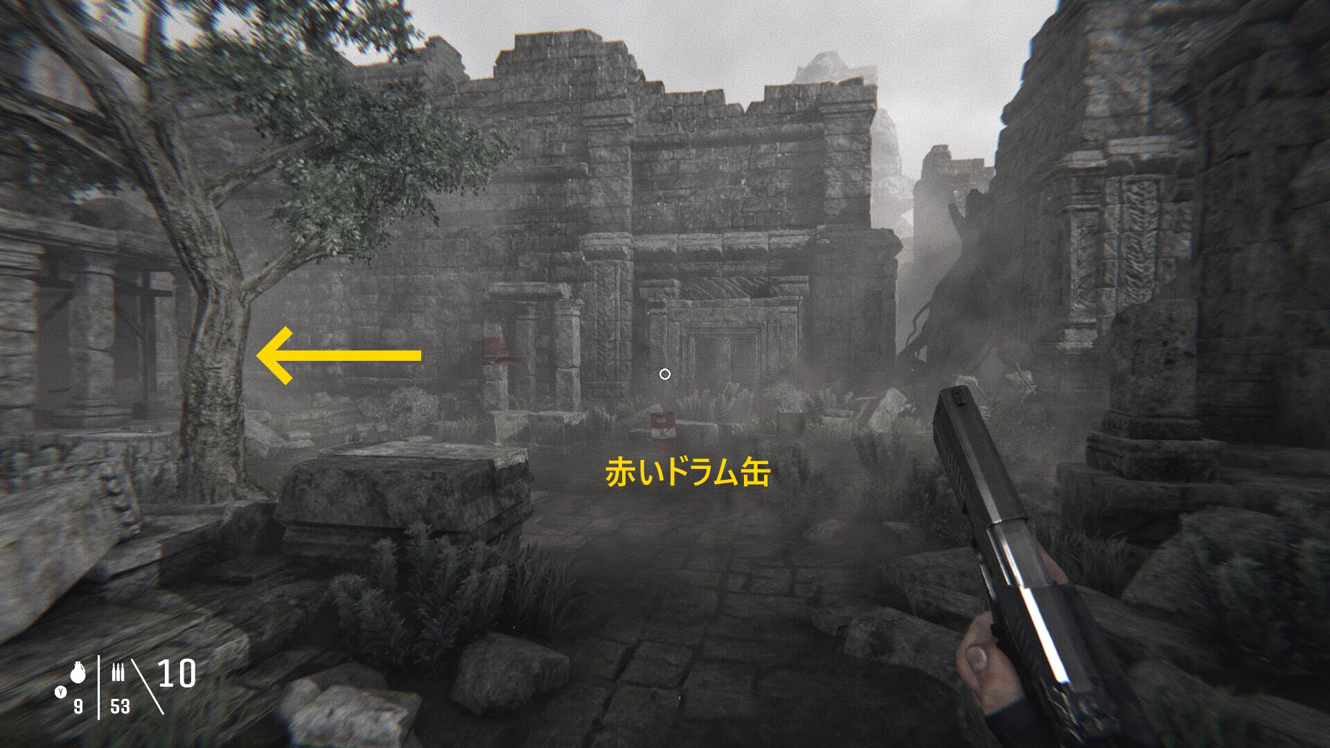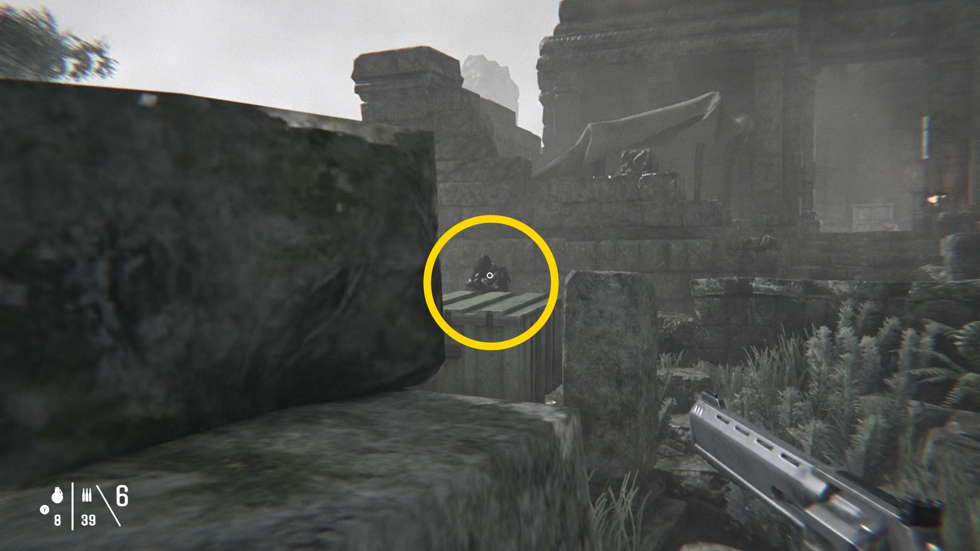 - 玉転がしパズルを解き、遺物を回収したら、ショットガンナーの死体のほうに戻る