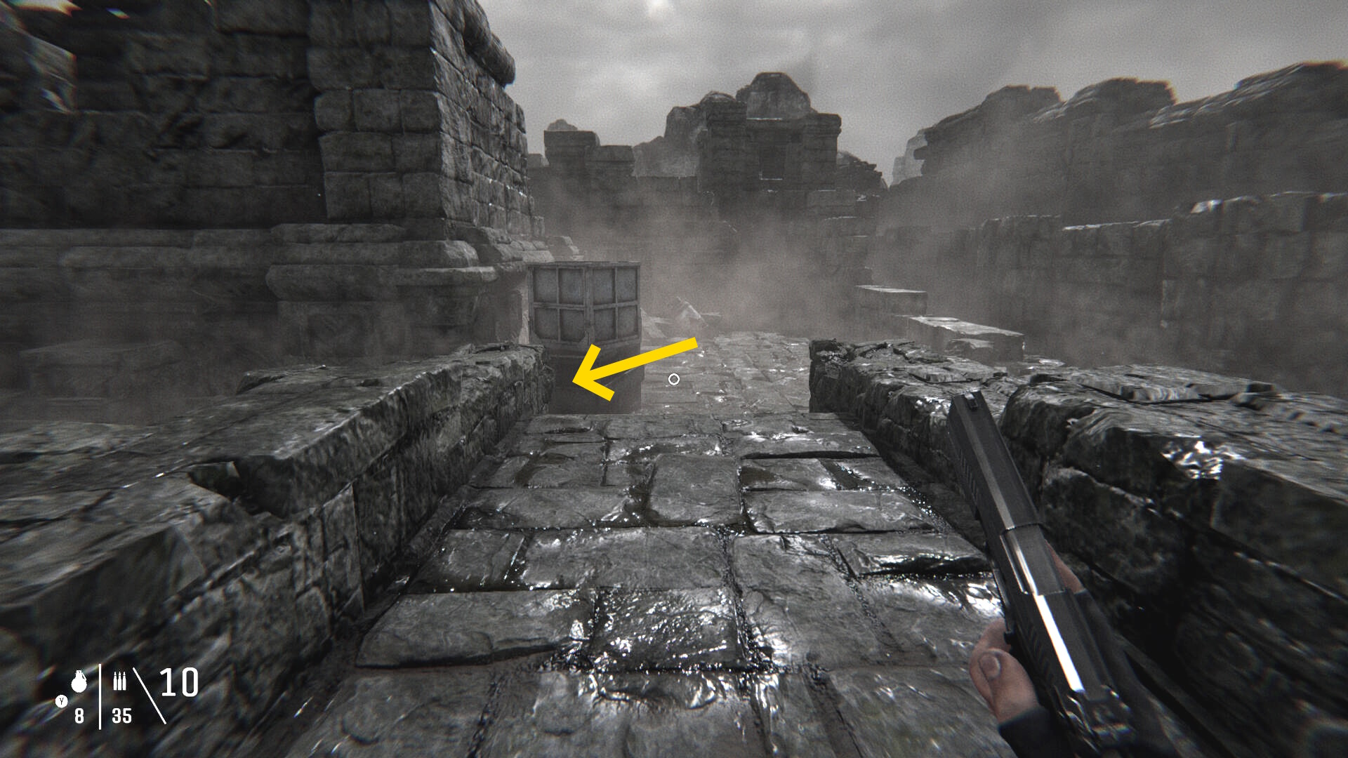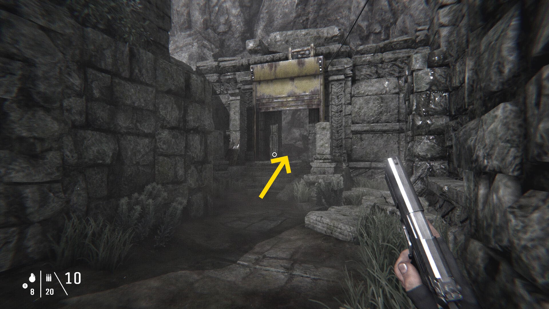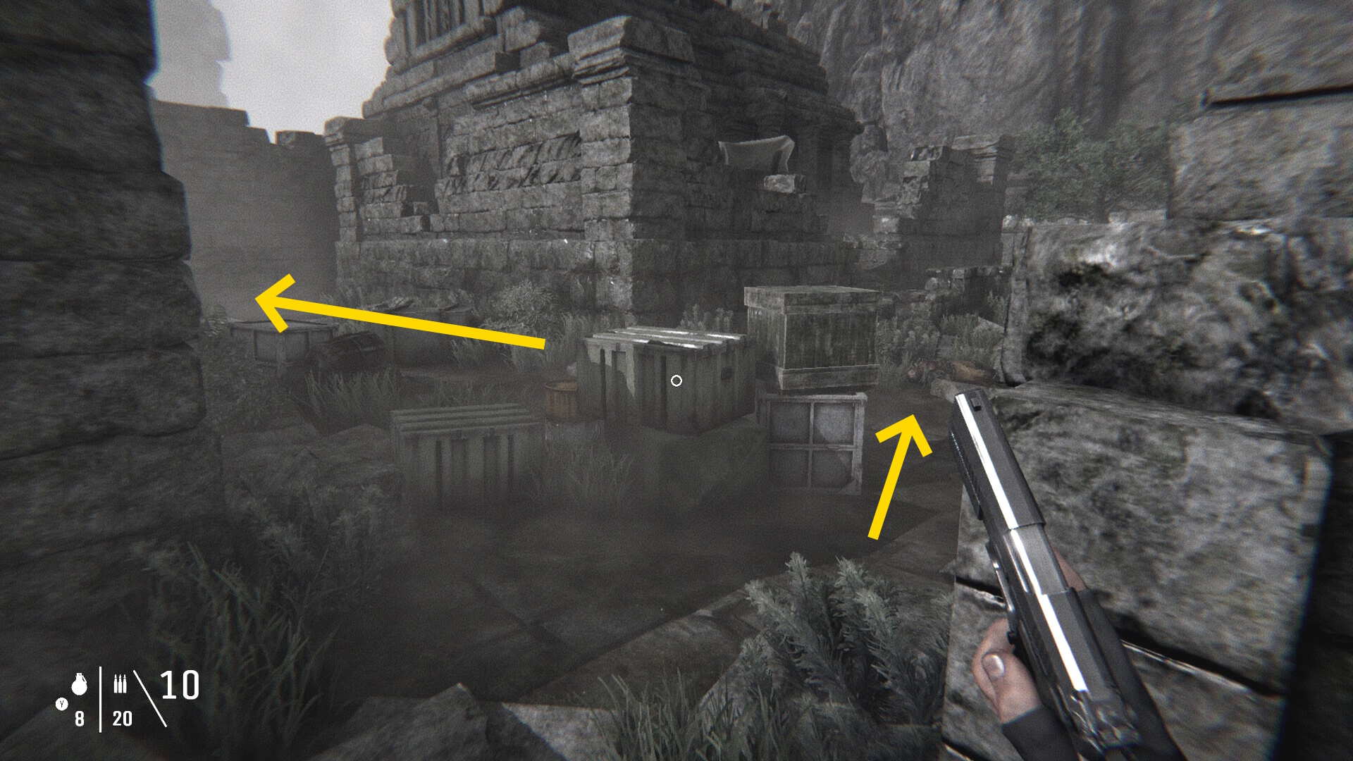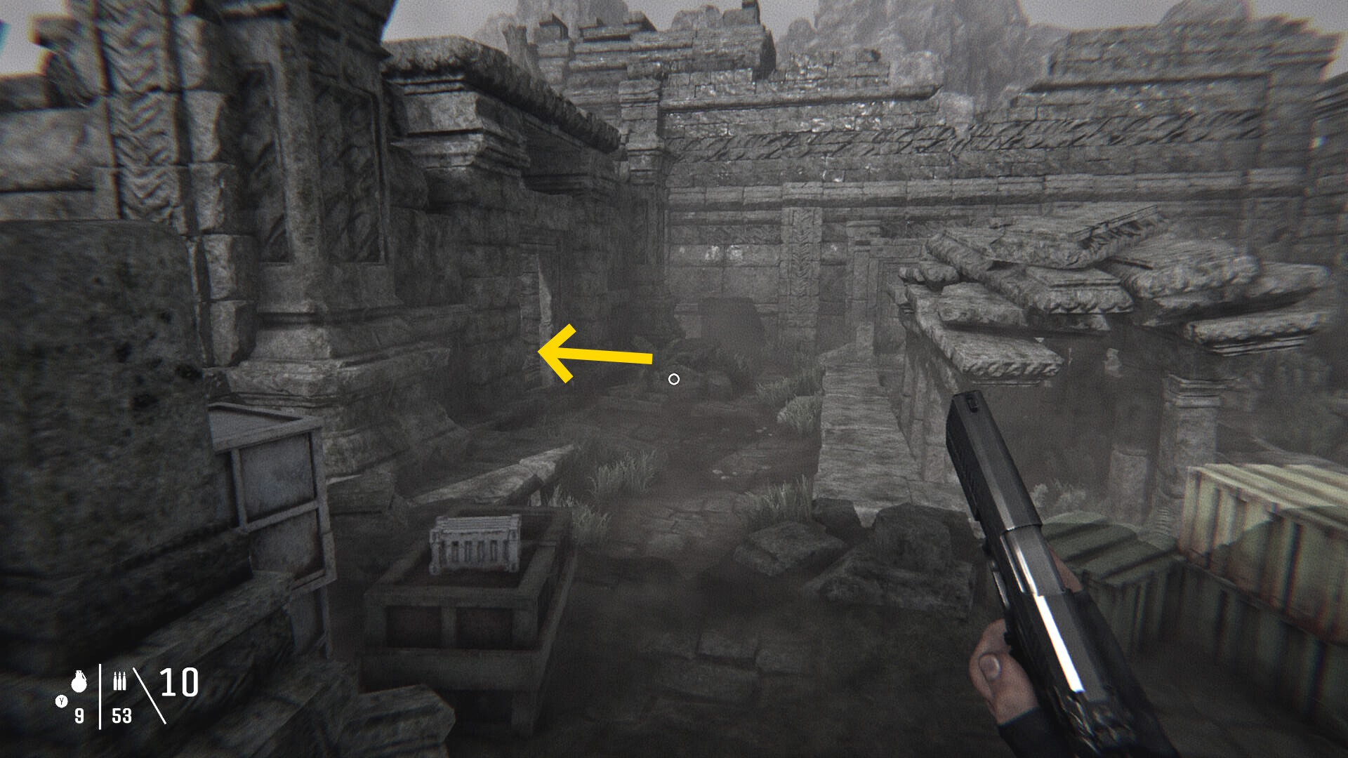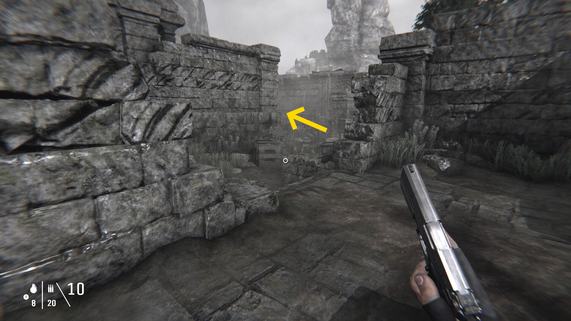 - 玉転がしパズルを解き、遺物を回収したら、ショットガンナーの死体のほうに戻る
