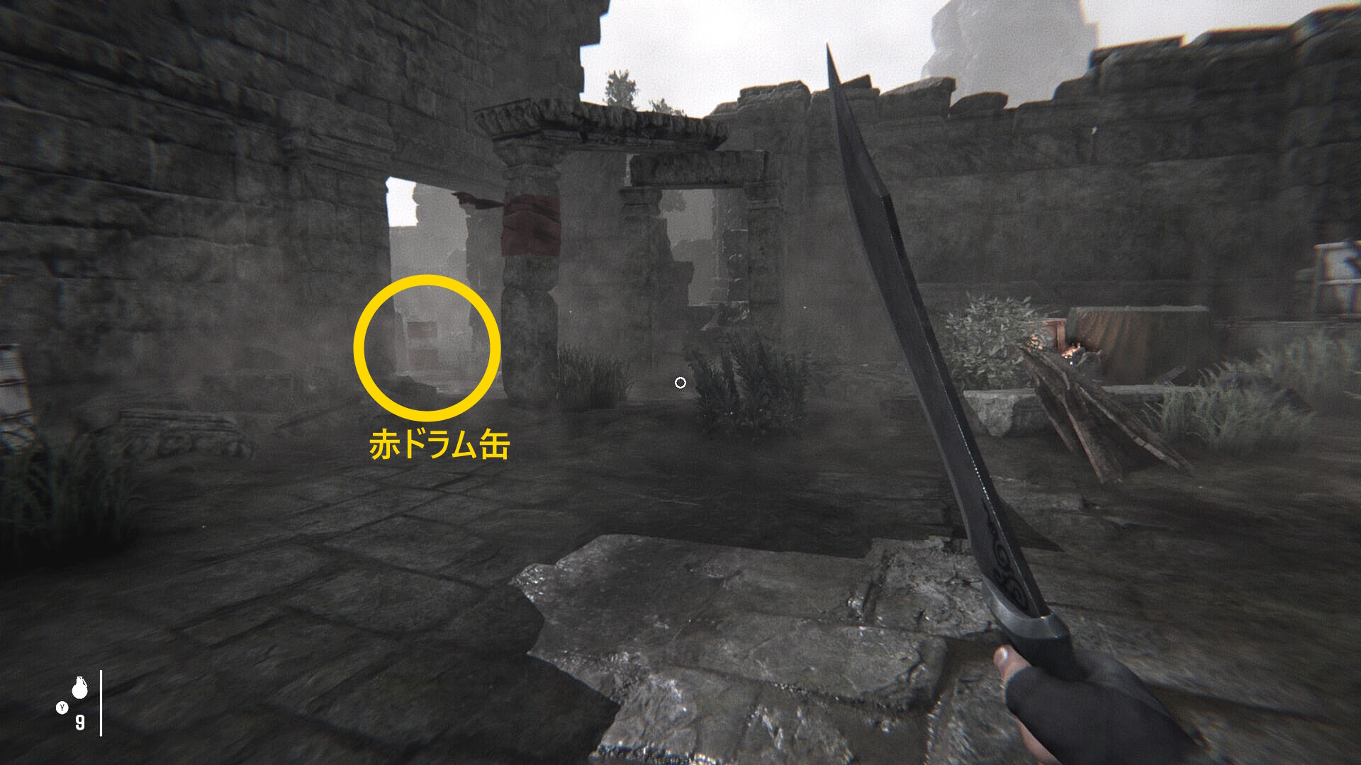 - ドラム缶を左に見て、左奥に進む(左壁に沿って)