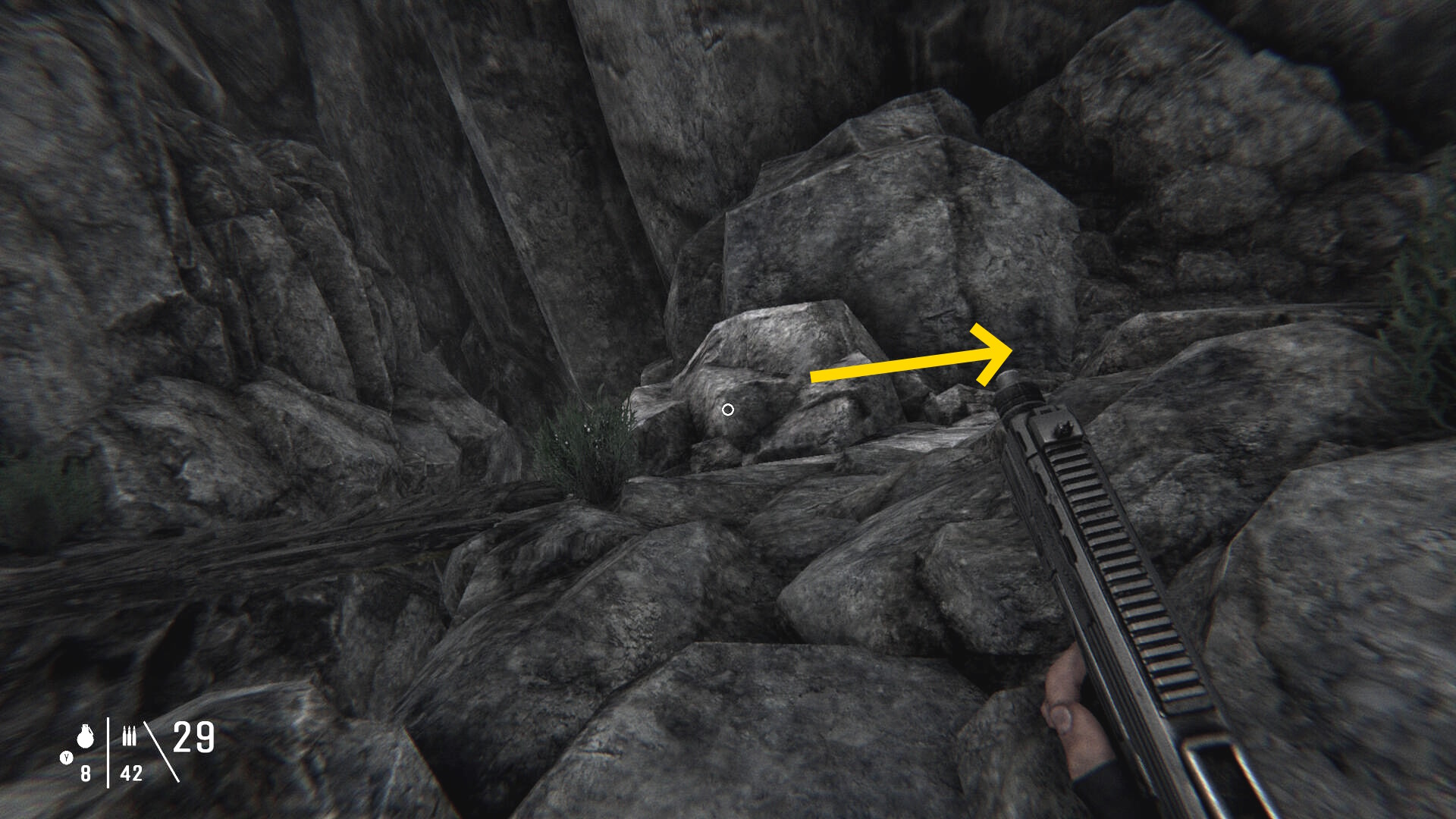 - 左壁の崩れたところから覗くと雑魚1人とショットガンナー1人が見える