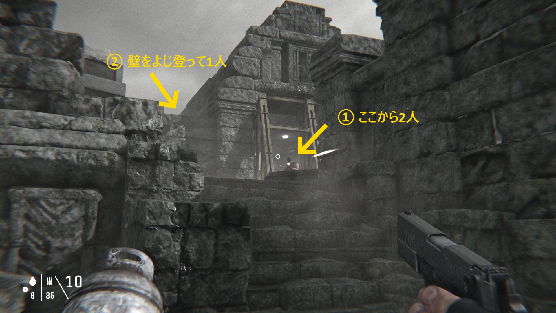 - 階段にいない場合は階段に近づくと、奥の建物から2人 ⇒ その左の壁をよじ登って1人 が出現するのでキル