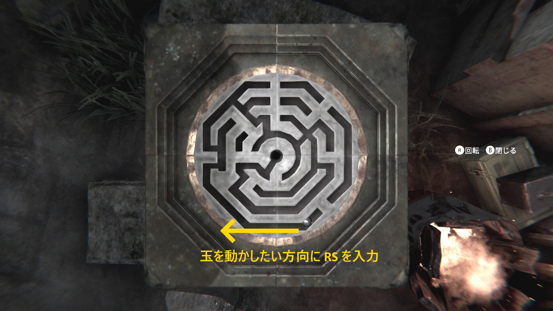 - ドラム缶の焚き火のところ、切断された柱の上に 玉転がしパズル(1/14)がある
