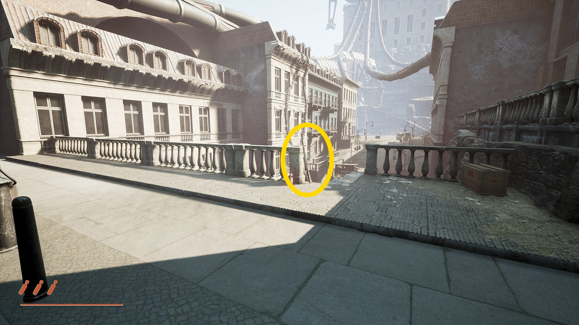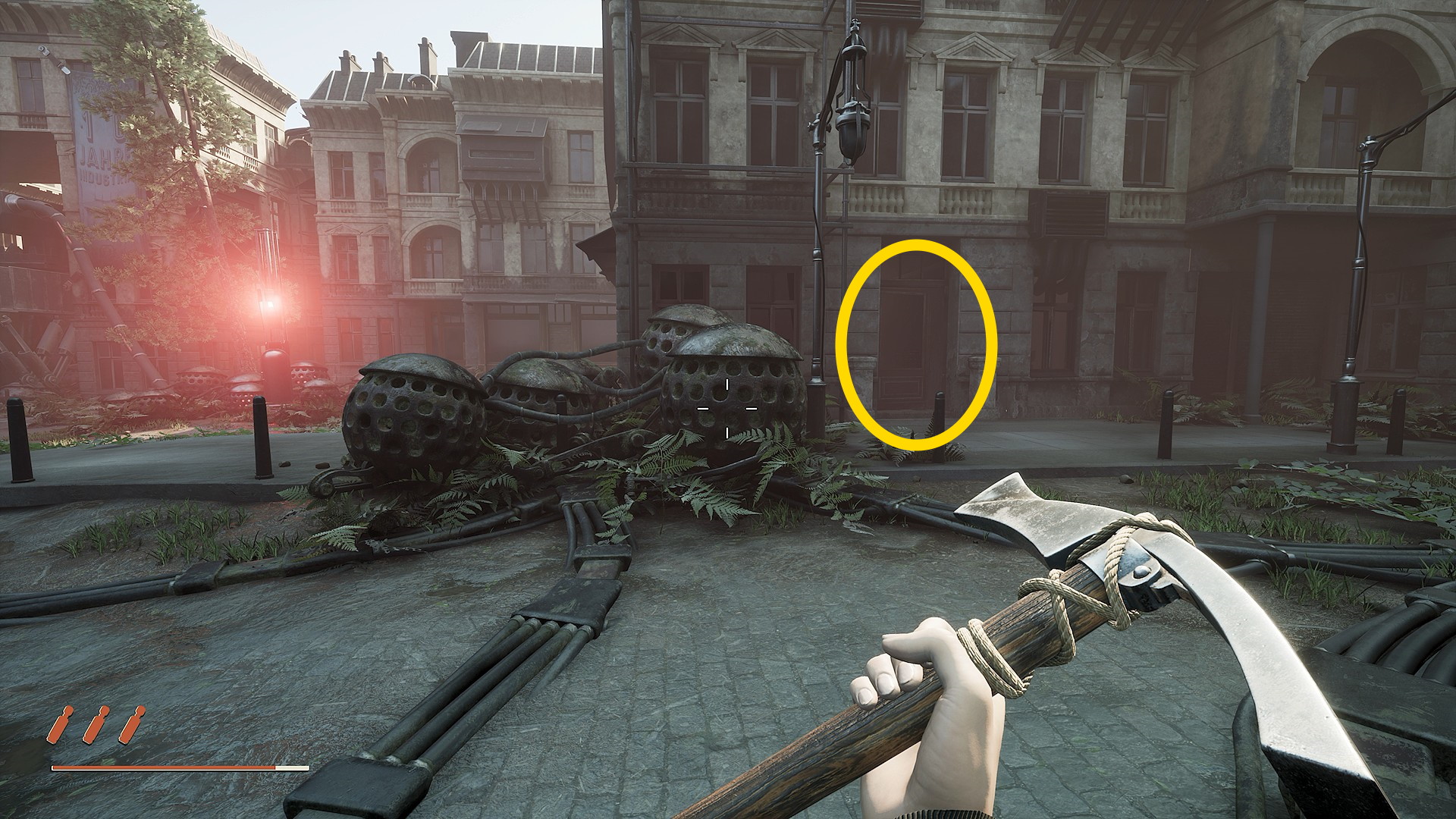 - 通信後、ウォルターの銅像の奥にある関所のスロープを下ろすために2箇所の赤い装置をシャットダウンする必要がある