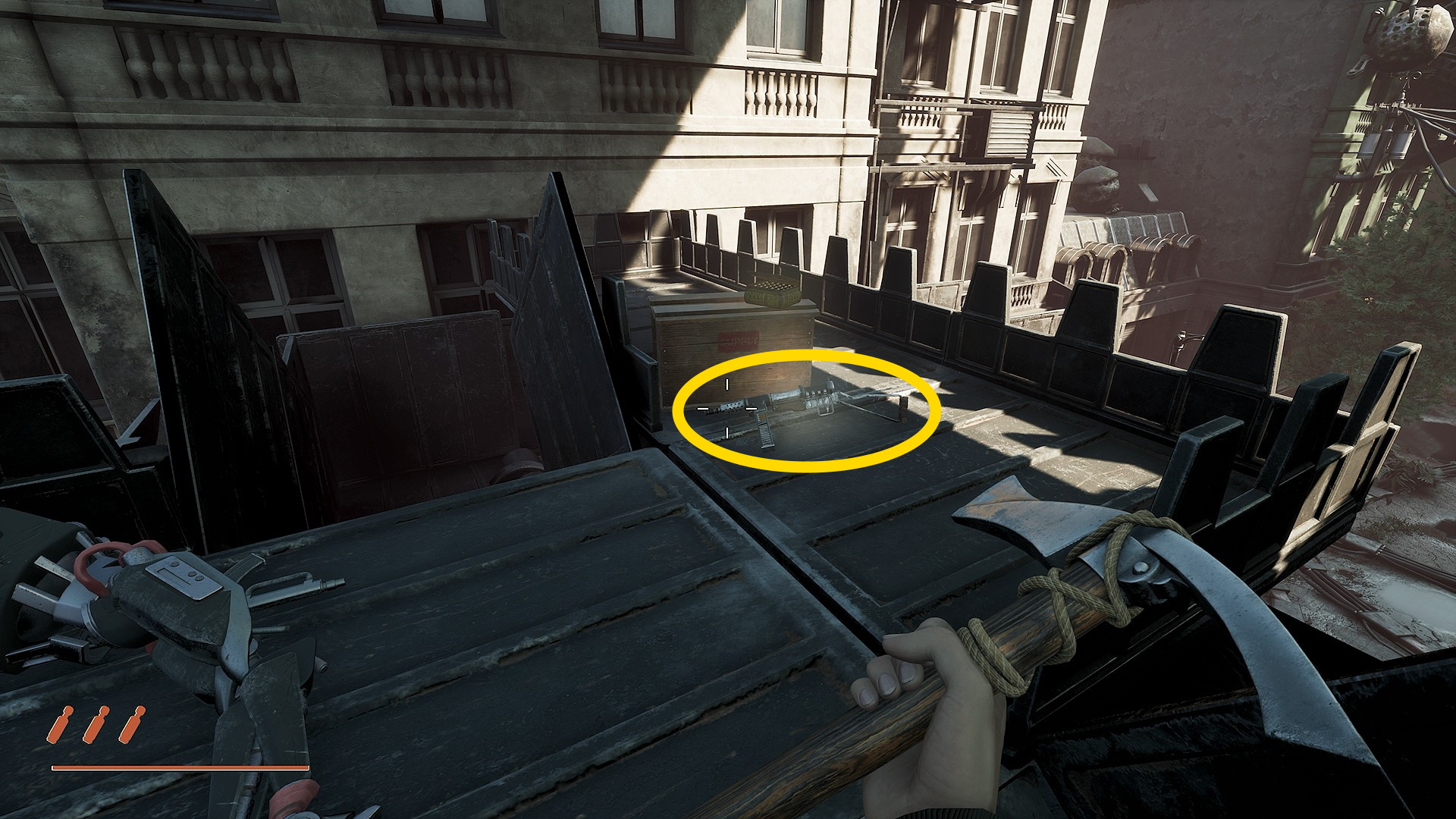 - カフェで弾薬等を補給したら、奥にある木箱を持って外に出る