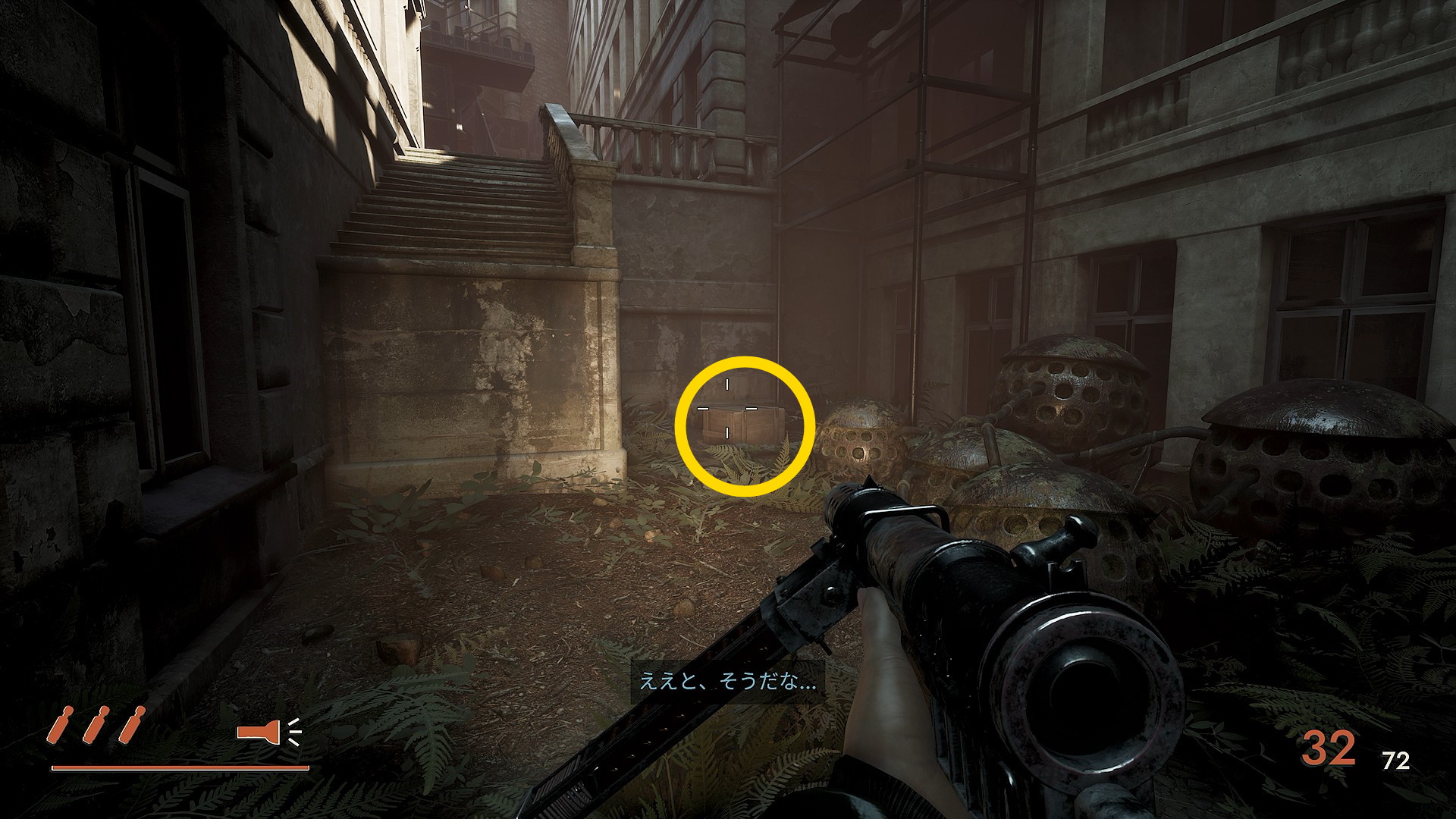 - 奥のドアを開けて中庭に進み、右側の棚から弾薬等を回収し、その奥の補給箱×3からも弾薬等を回収