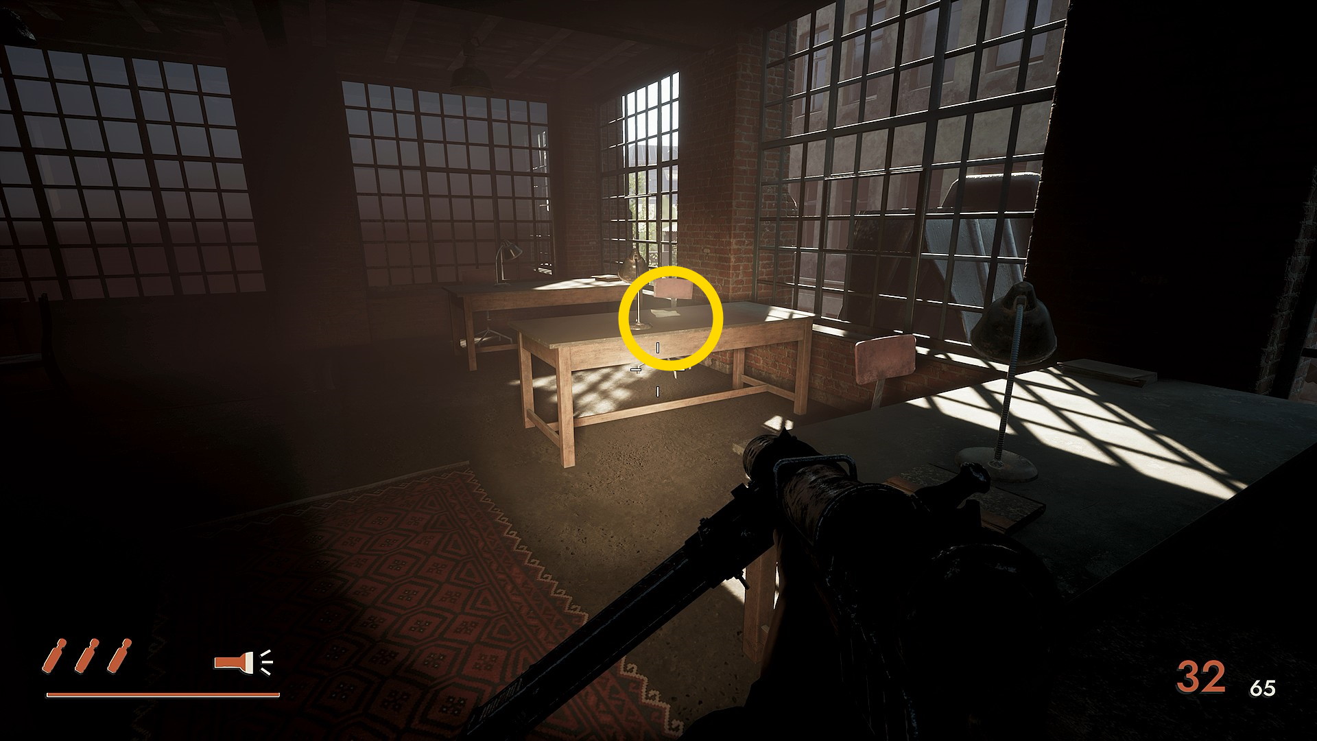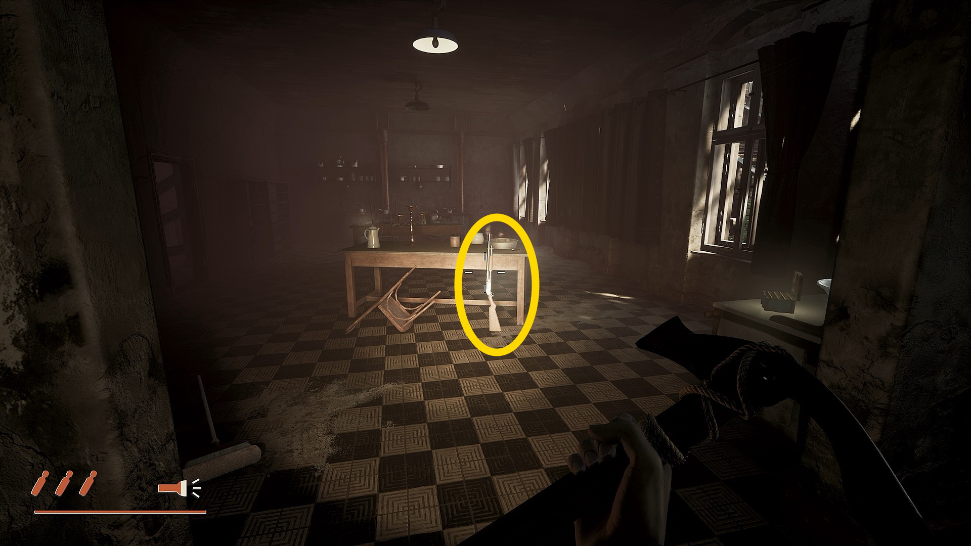 - タイプライターのある小部屋を出たら、正面の手すりに ライフル が立てかけてある
