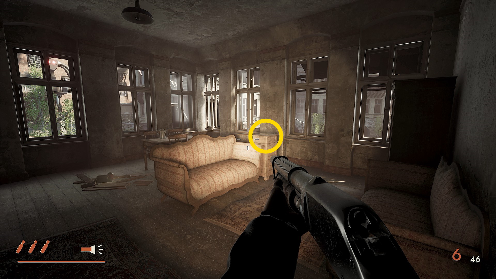 - 適当に始末したら、右側の部屋に入るとテーブルに立てかけられた ショットガン が見える(テーブルにはショットガン弾薬もあり)