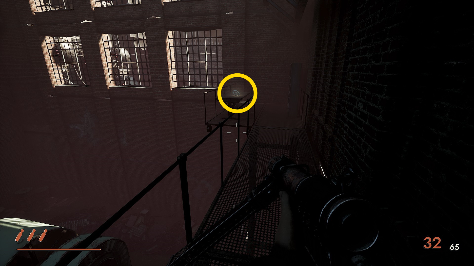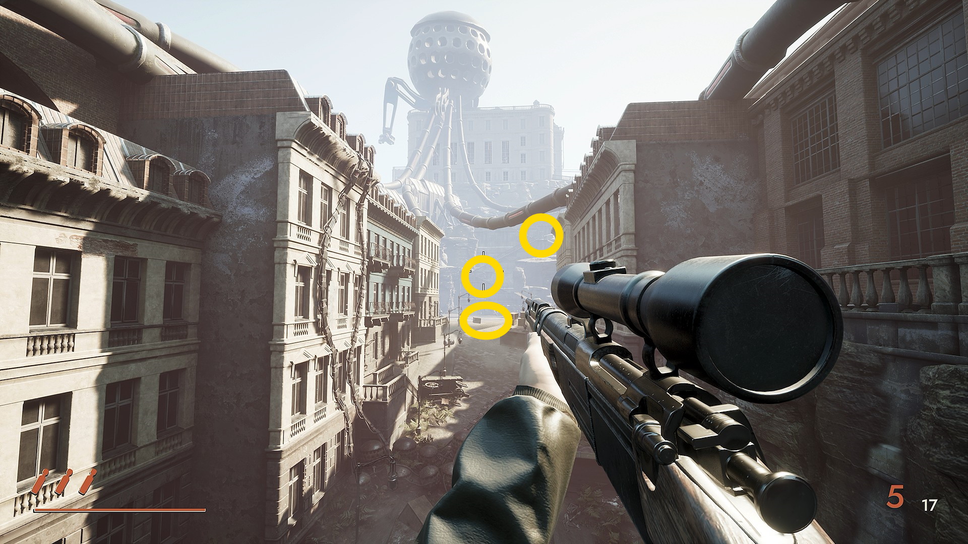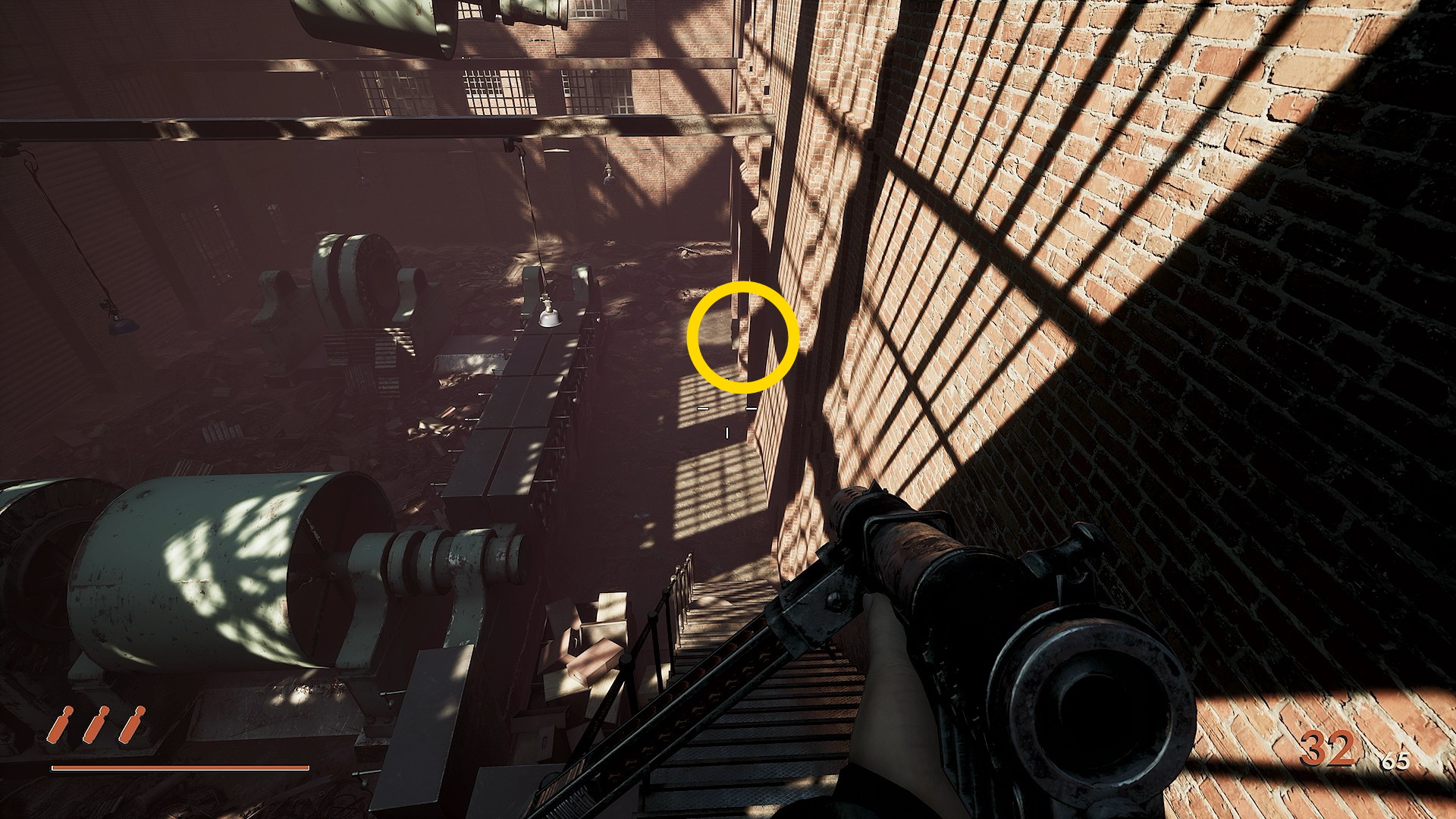- 正面奥を見ると地上に銃持ち1体、その上の階段に1体、さらに右上の階段に1体いるので先に狙撃しておく