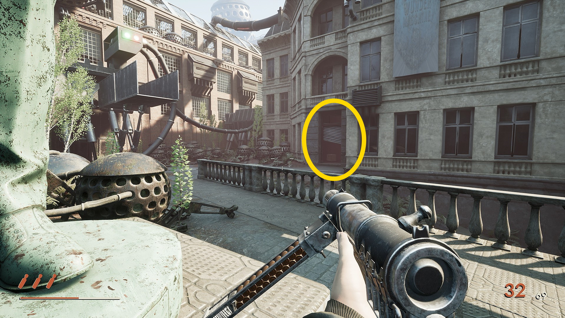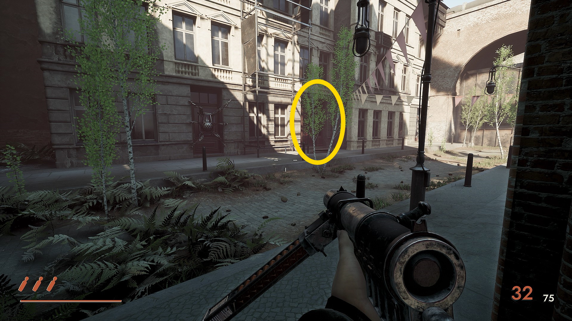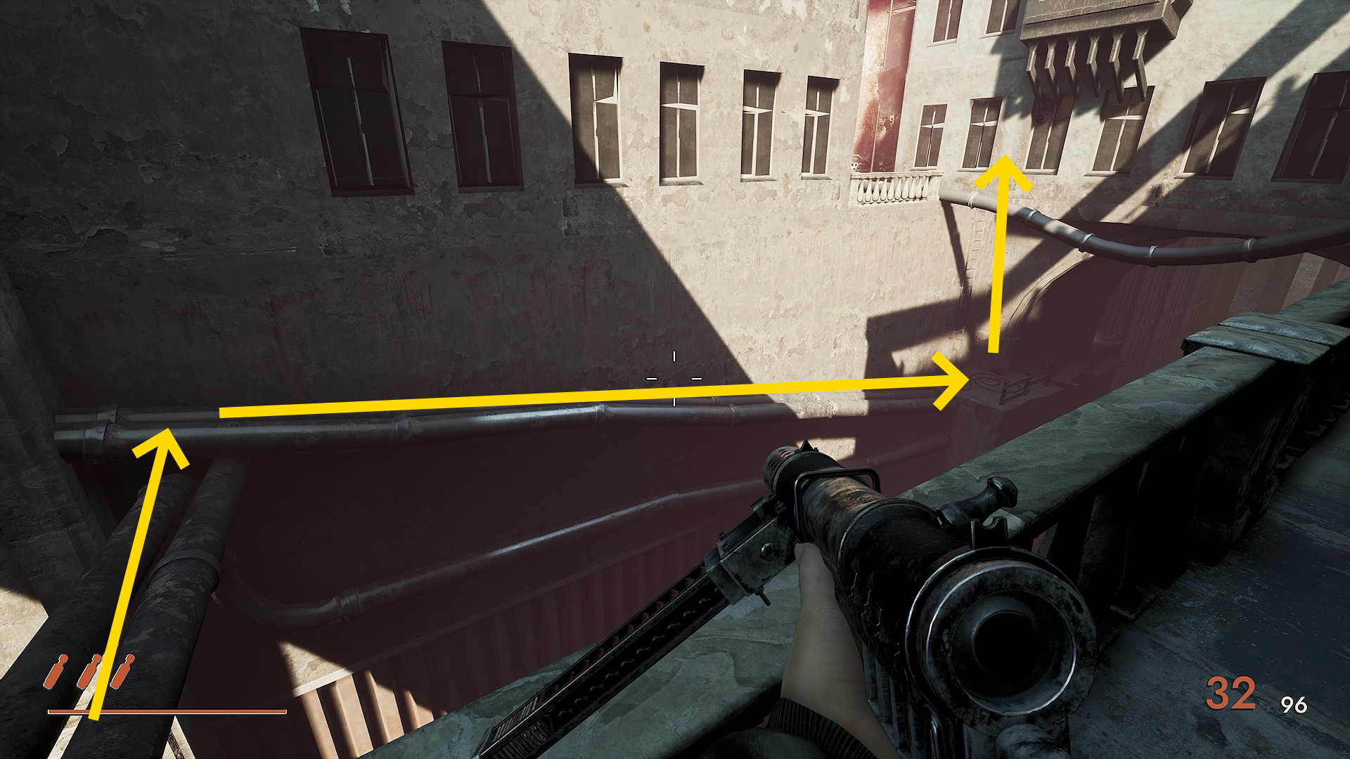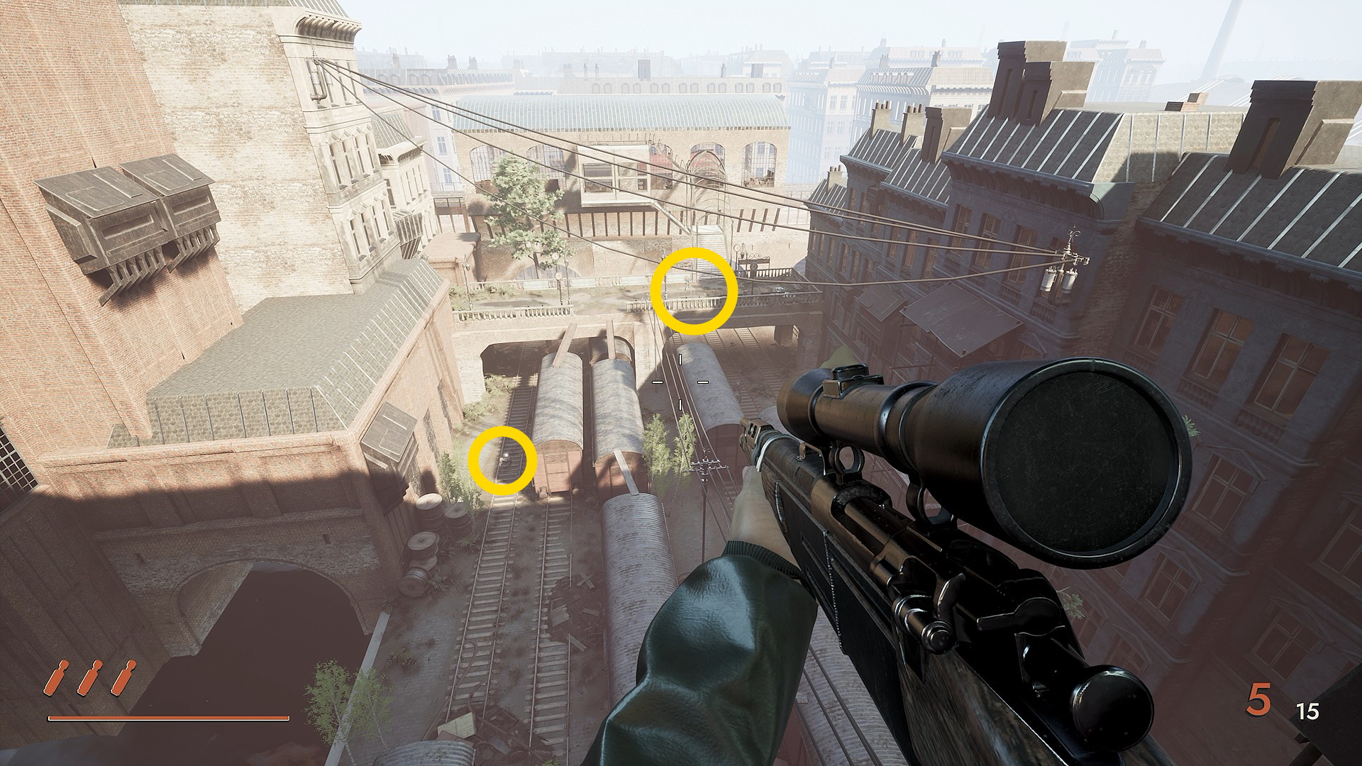 - 正面奥を見ると地上に銃持ち1体、その上の階段に1体、さらに右上の階段に1体いるので先に狙撃しておく