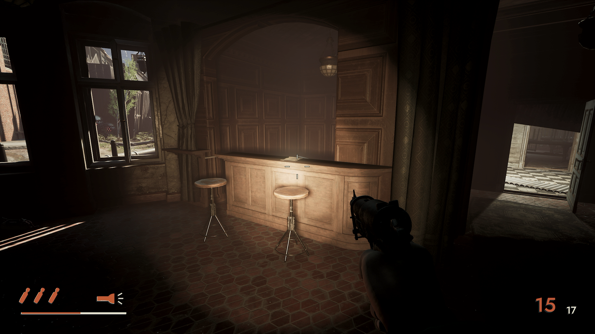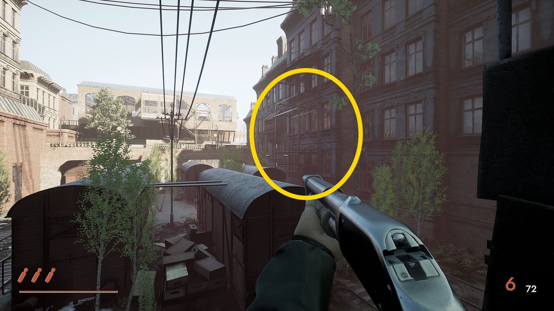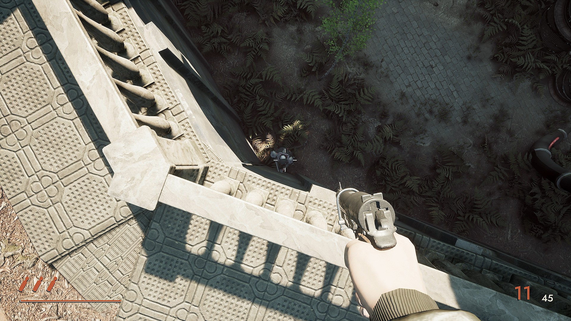 - 階段の手すりに隠れながら狙撃することで銃持ちの数を減らし、残りの銃持ちも始末(合計4体)
