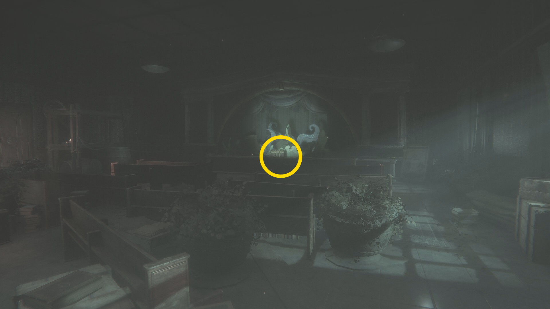 - ステージに近づくと右側面の窓を突き破って敵が1体飛び込んでくる (敵はすぐに巡回を始めるので、一旦廊下に戻ると安全)