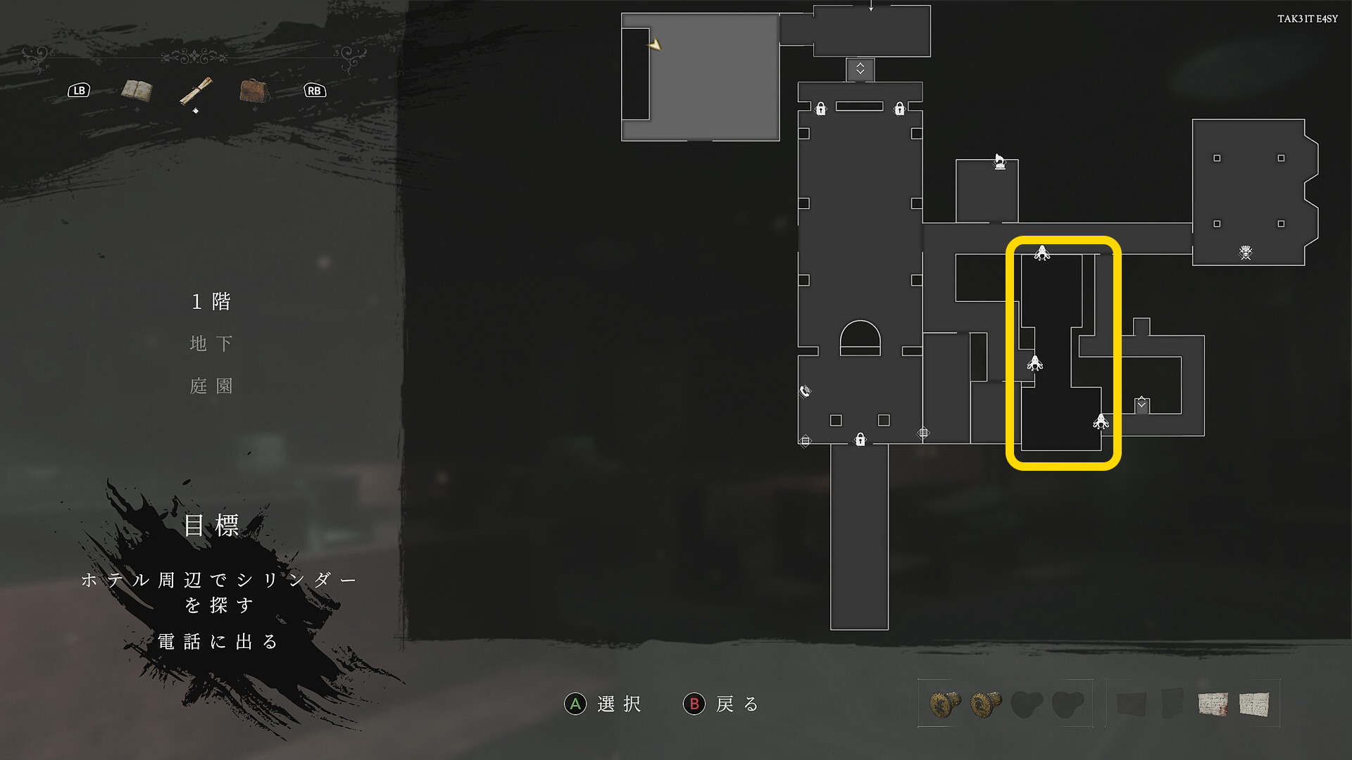 ホテル周辺でシリンダーを探す/電話に出る