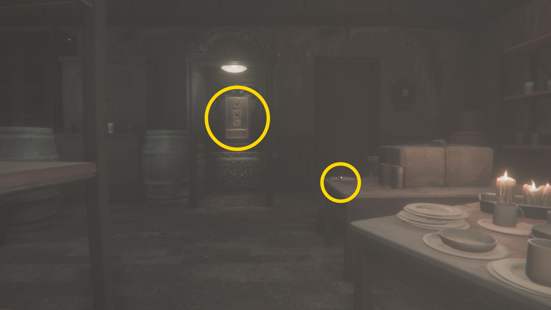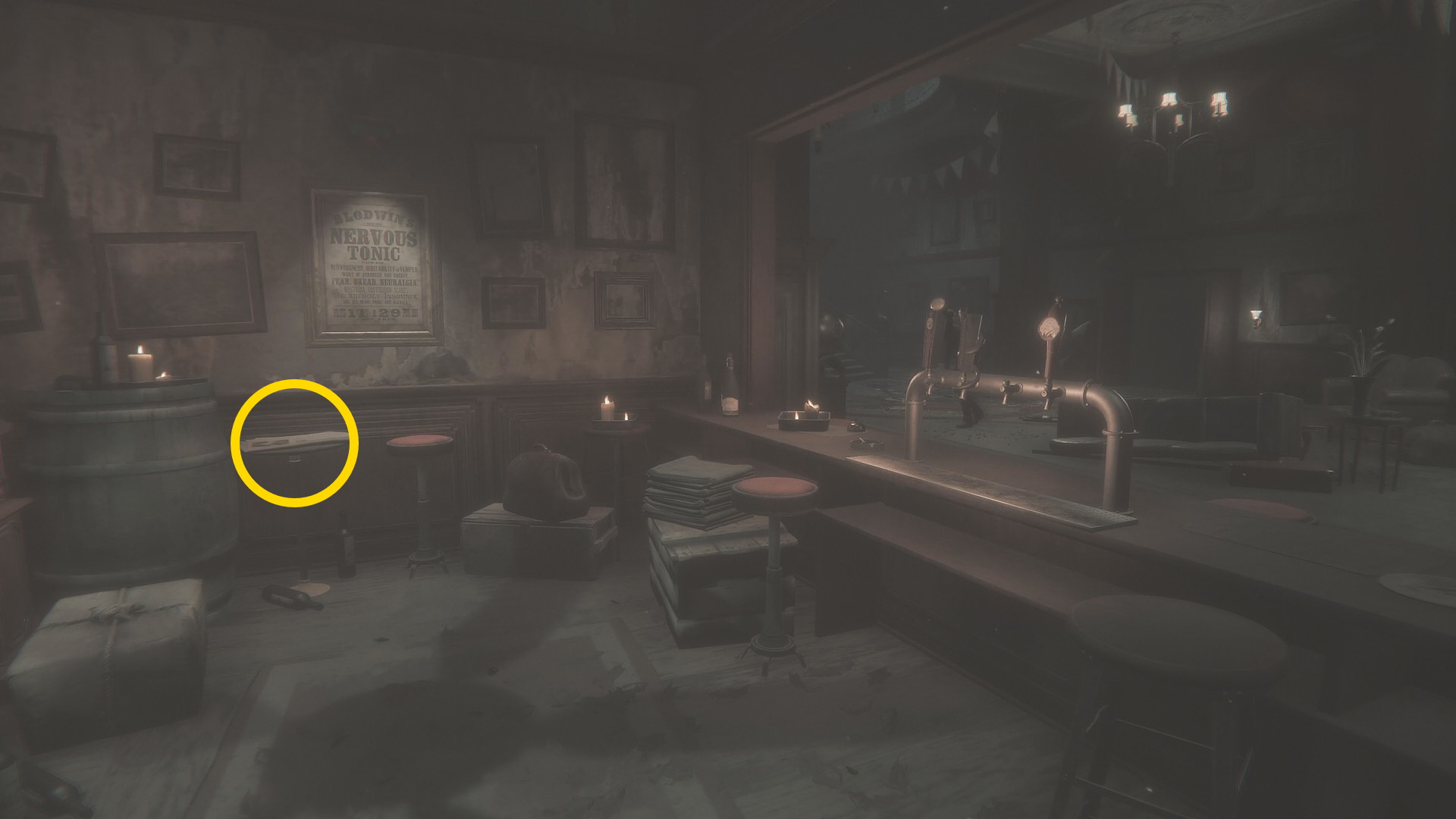 - バーの裏側 (バックヤード)に入ったら右前方に電話 (一応、エリザベスに話しかけておく)。その手前にはカートリッジがあるので回収