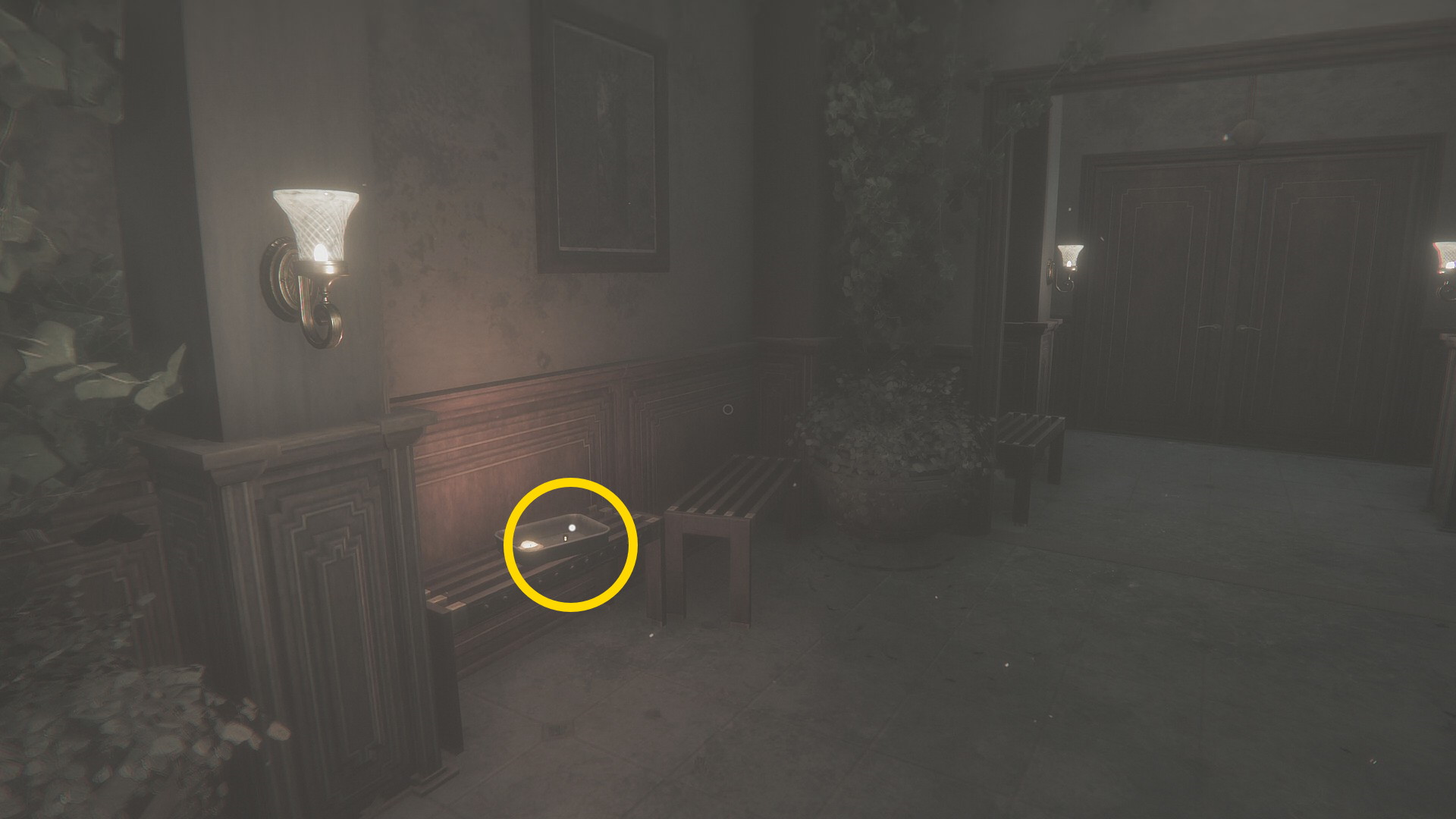 - 少し進んで受付のドアを開け、その中を通りエントランスに出る (エントランスも敵が巡回しているので注意)