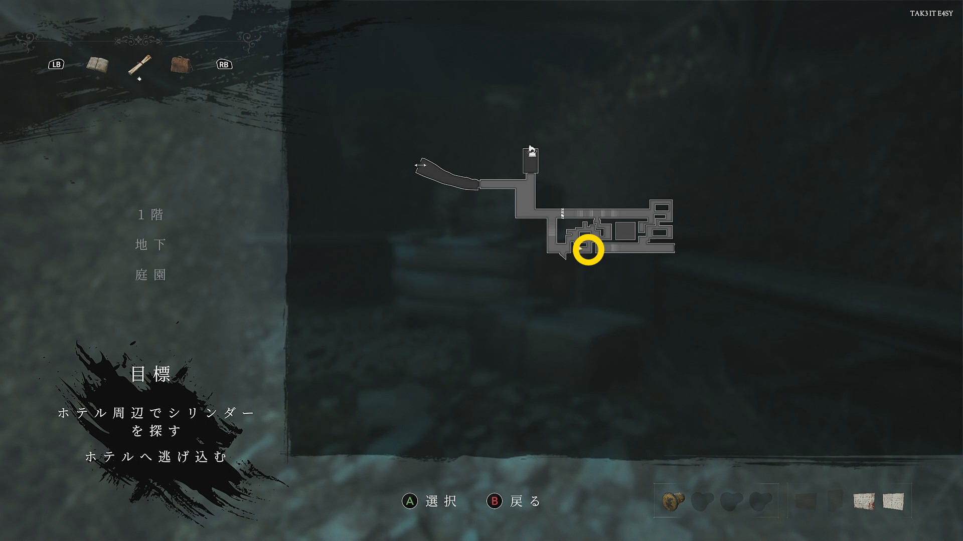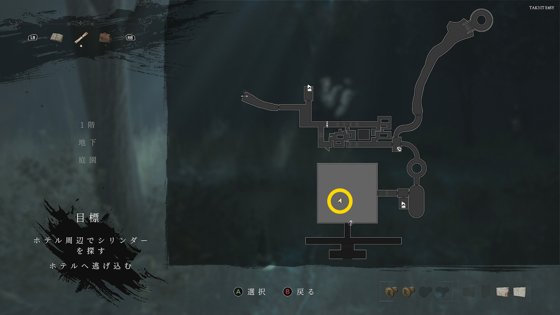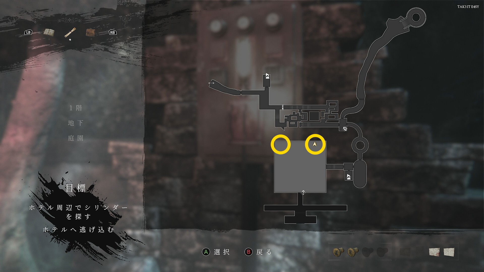 ホテル周辺でシリンダーを探す/ホテルに逃げ込む