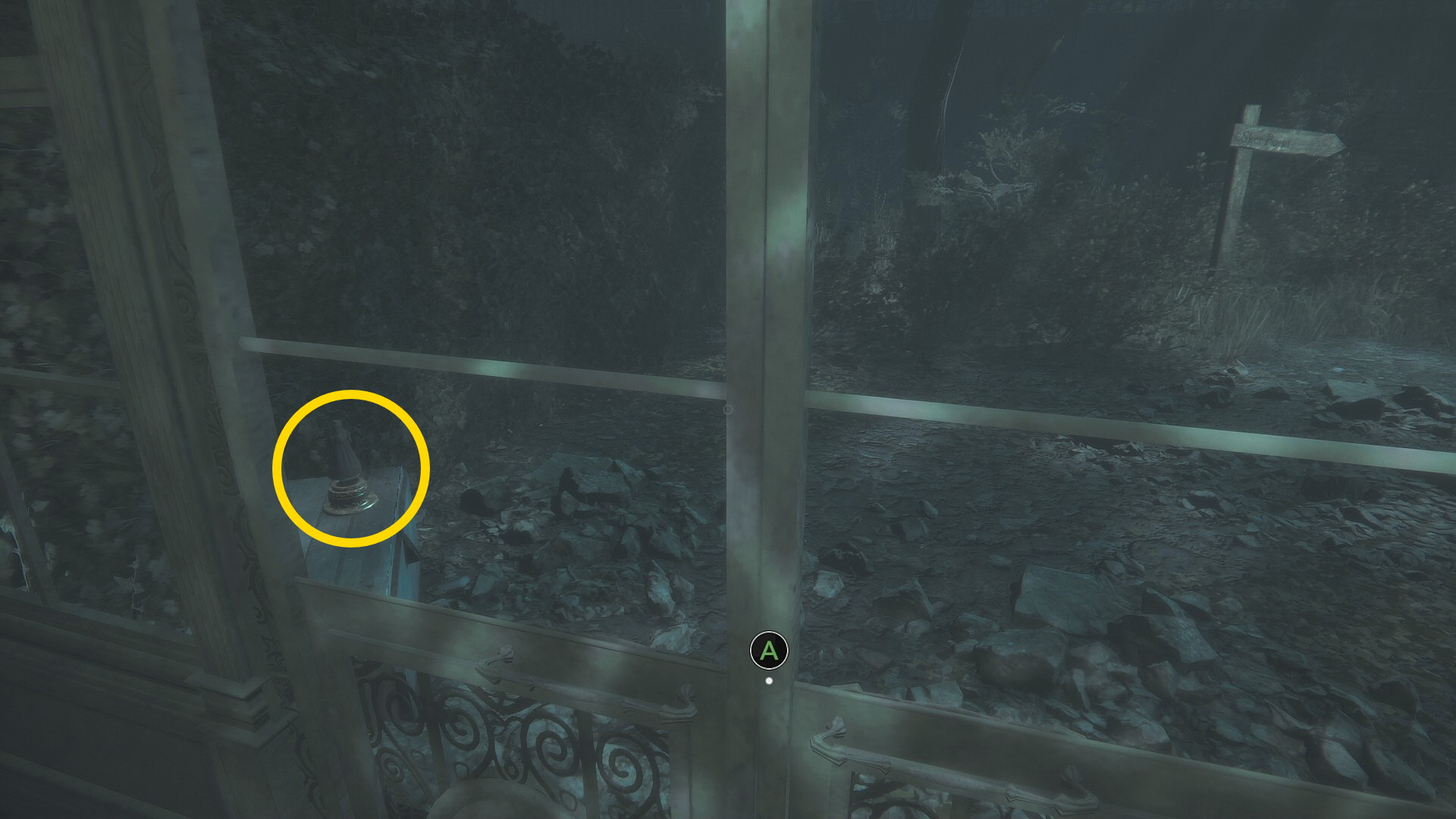 - 頭上の橋に注目しながら少し進むとハットをかぶった敵が何かを投げ、左側に紫色のガスが出現。それと共に敵が庭園を巡回するようになる