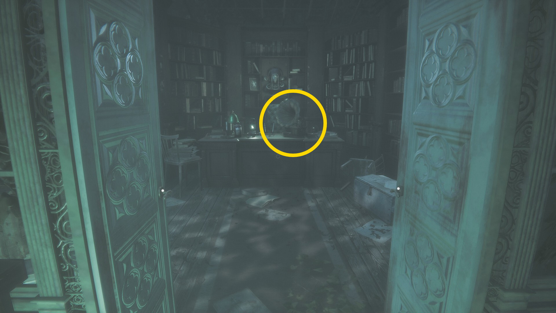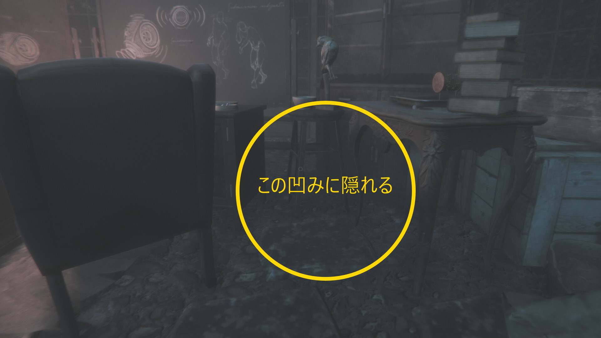 - 台座の右側、鳥の剥製がある凹みに入っていれば、こちらに向かってくる敵には見つからない (ギリギリまで近寄ってくるけど見つからない)