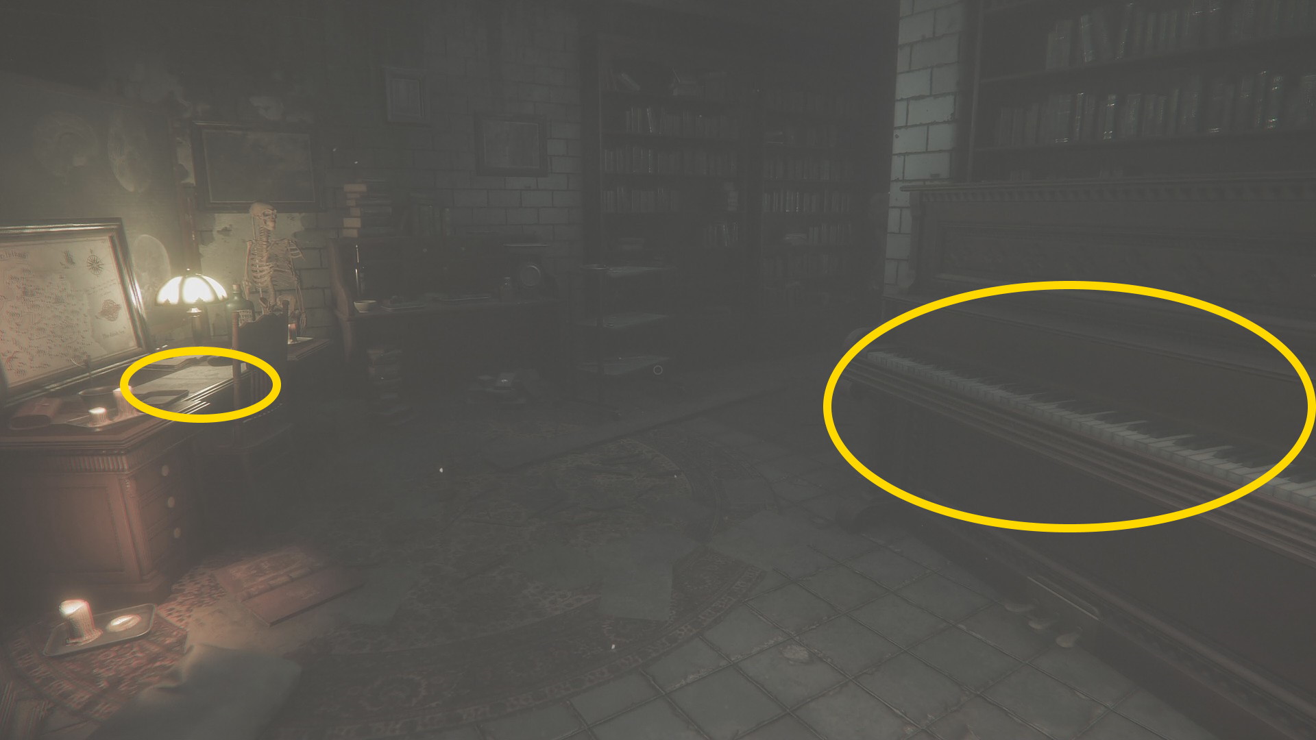 - 中には座ったままの死体があり、足元に 楽譜:アーサー・モリス が落ちているので回収